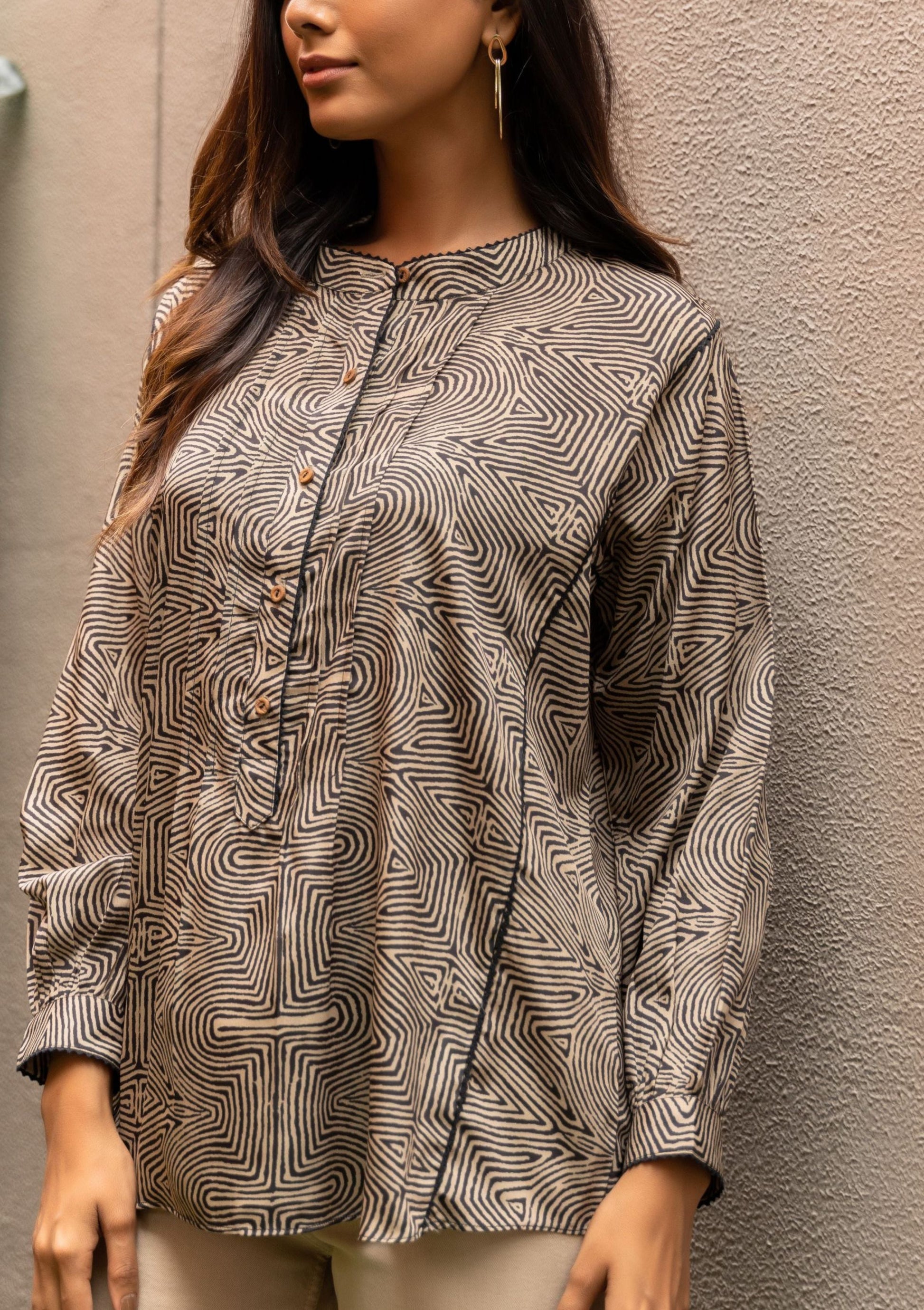 Step up your 9-5 style game in this chic Tunnel Black And Beige Abstract Crepe Top! Featuring a stand collar and stylised lace trims, you can rock this sleek piece for a professional vibe. With full sleeves and gathers at the cuff, you'll be looking sharp! Plus, the front button placket makes it easy to rock it for casual days too 🤩. Office-approved and weekend-ready, you'll be looking 💯!