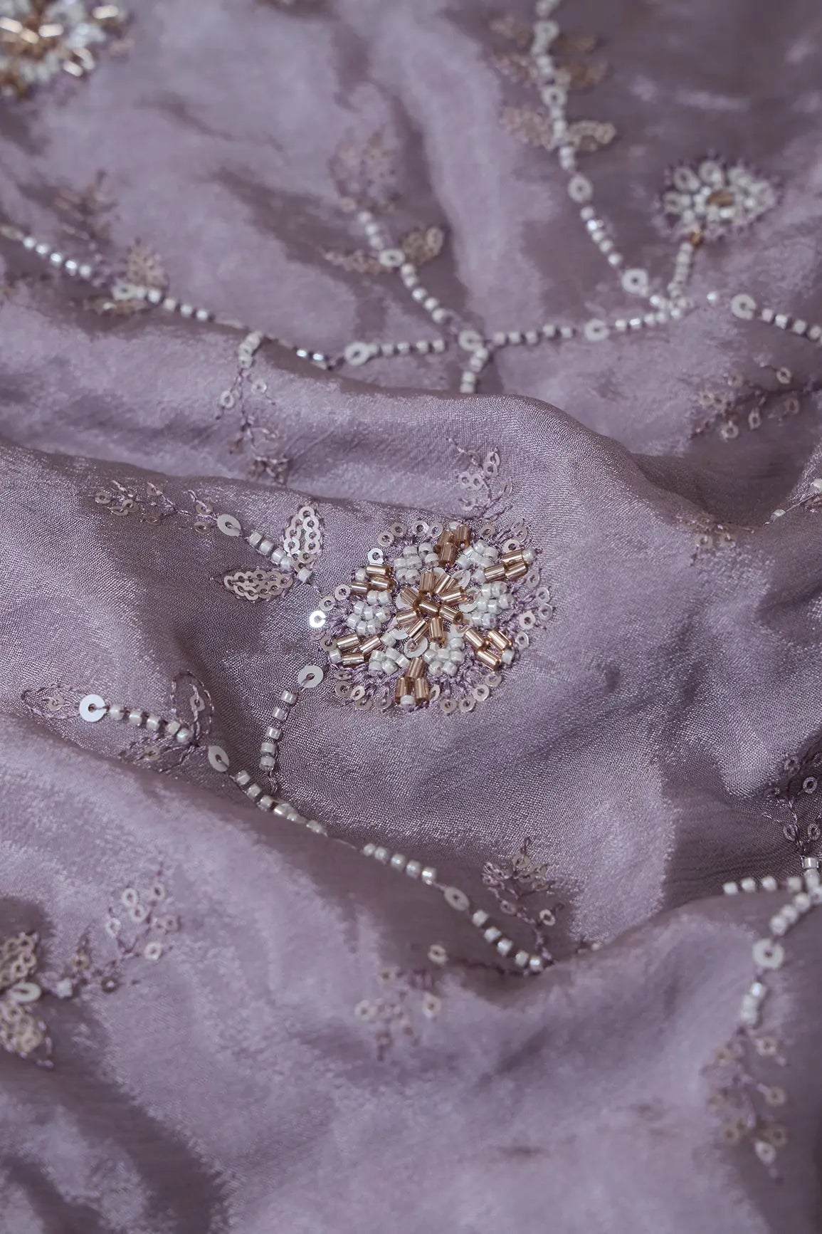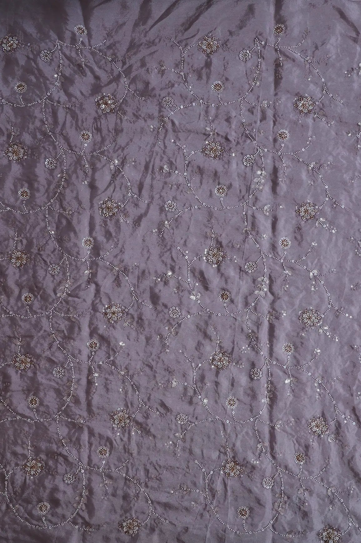 White Beads And Sequins Floral Embroidery On Fossil Grey Chinnon Chiffon Fabric