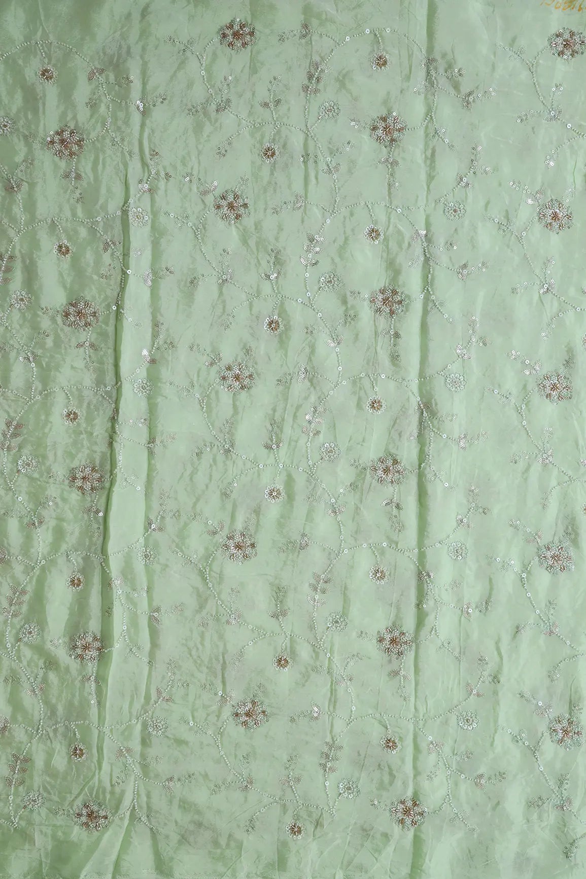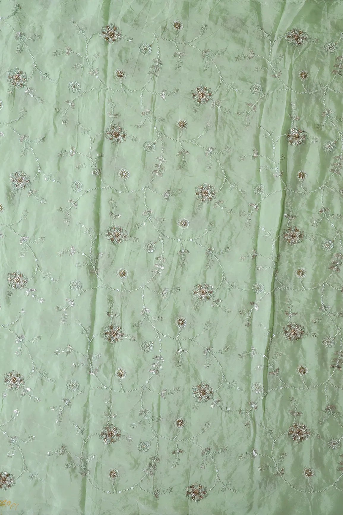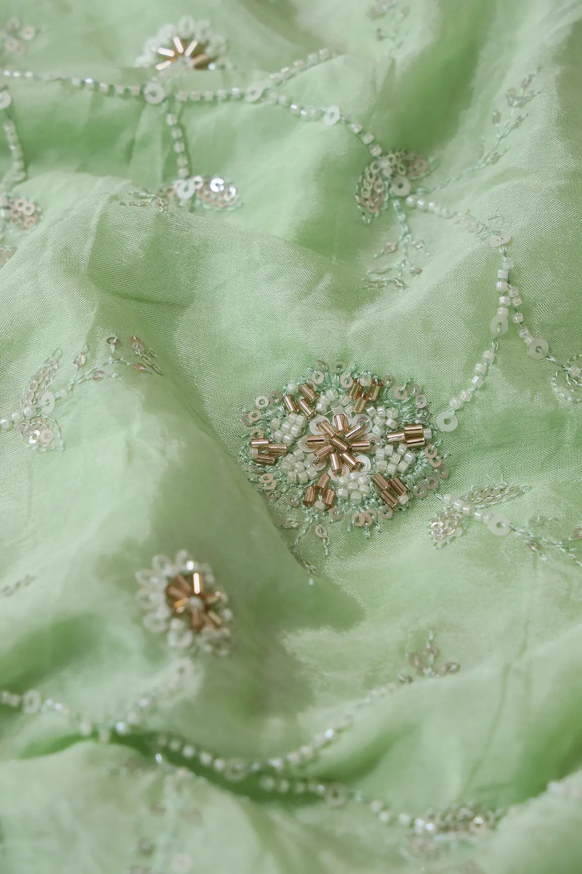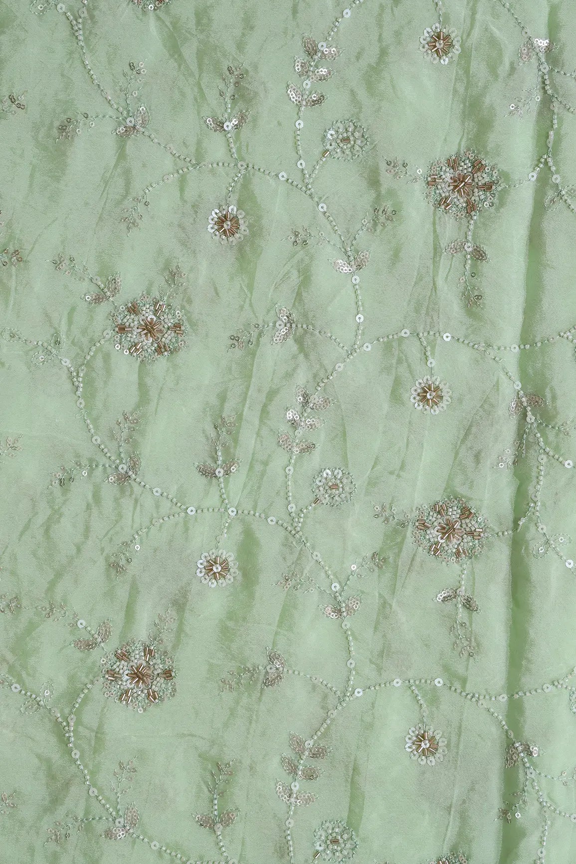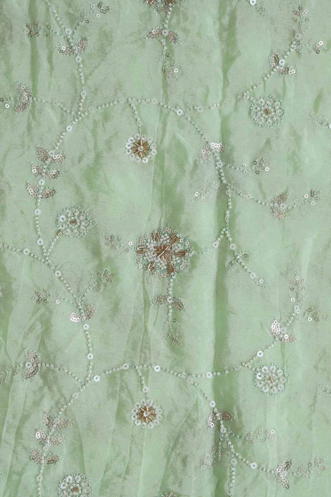 White Beads And Sequins Floral Embroidery On Pista Green Chinnon Chiffon Fabric