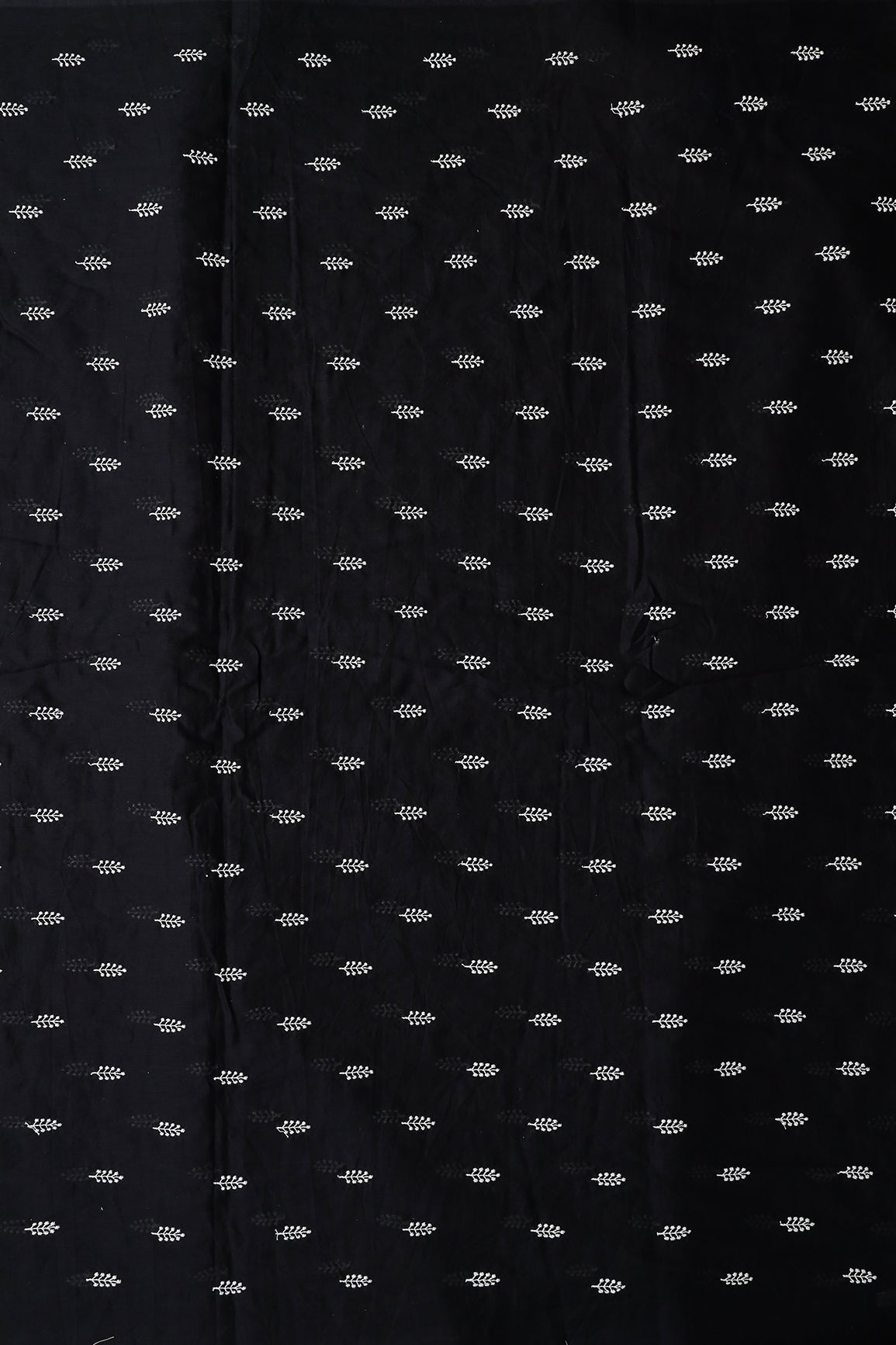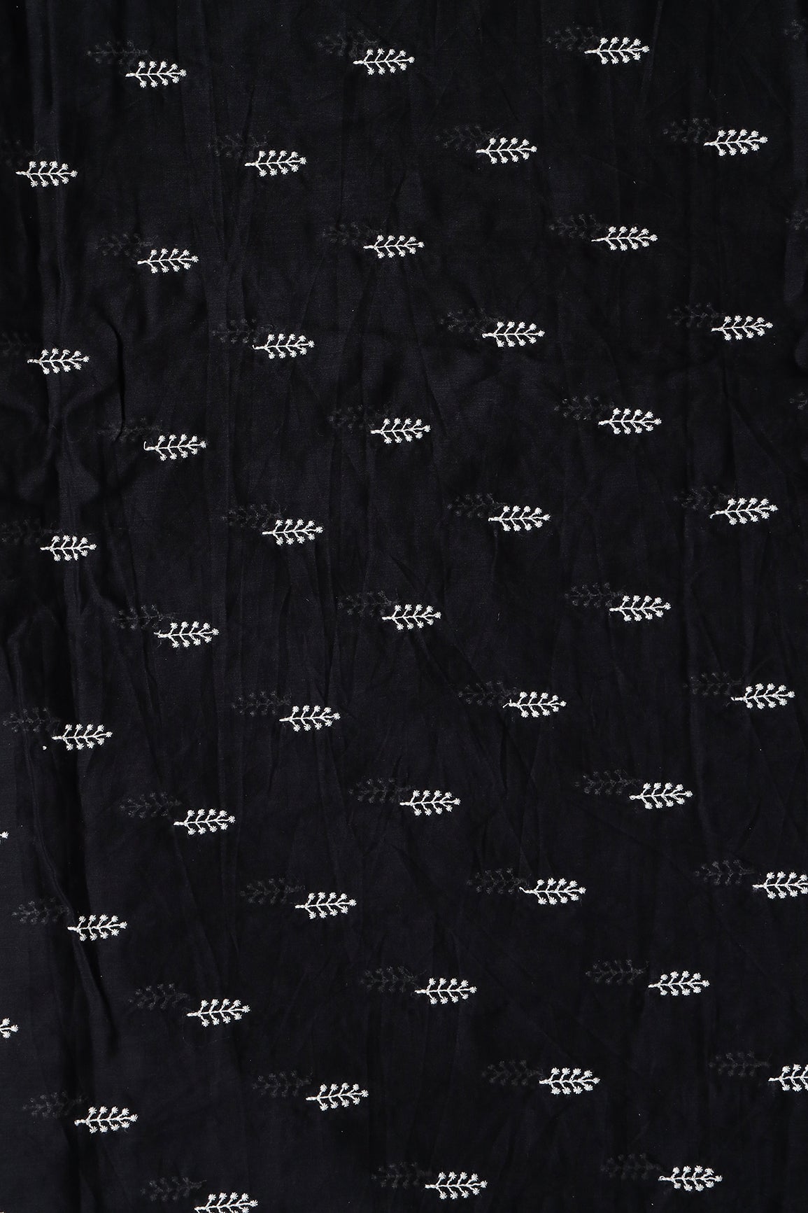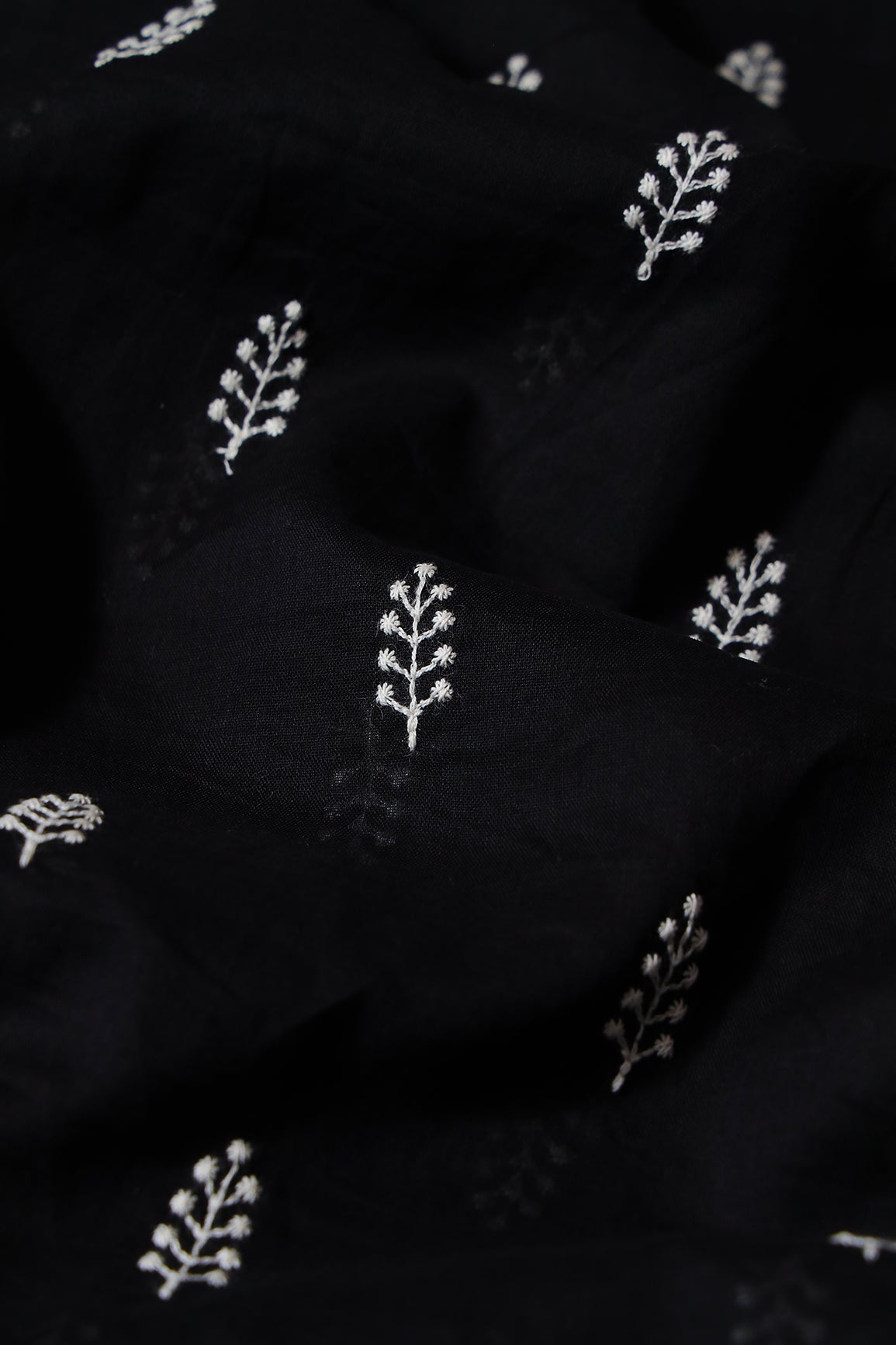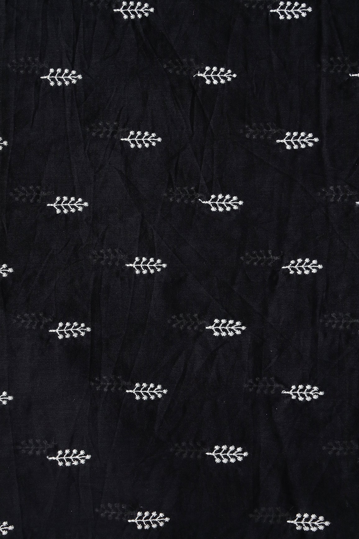 White Thread Leafy Embroidery On Black Pure Mul Cotton Fabric