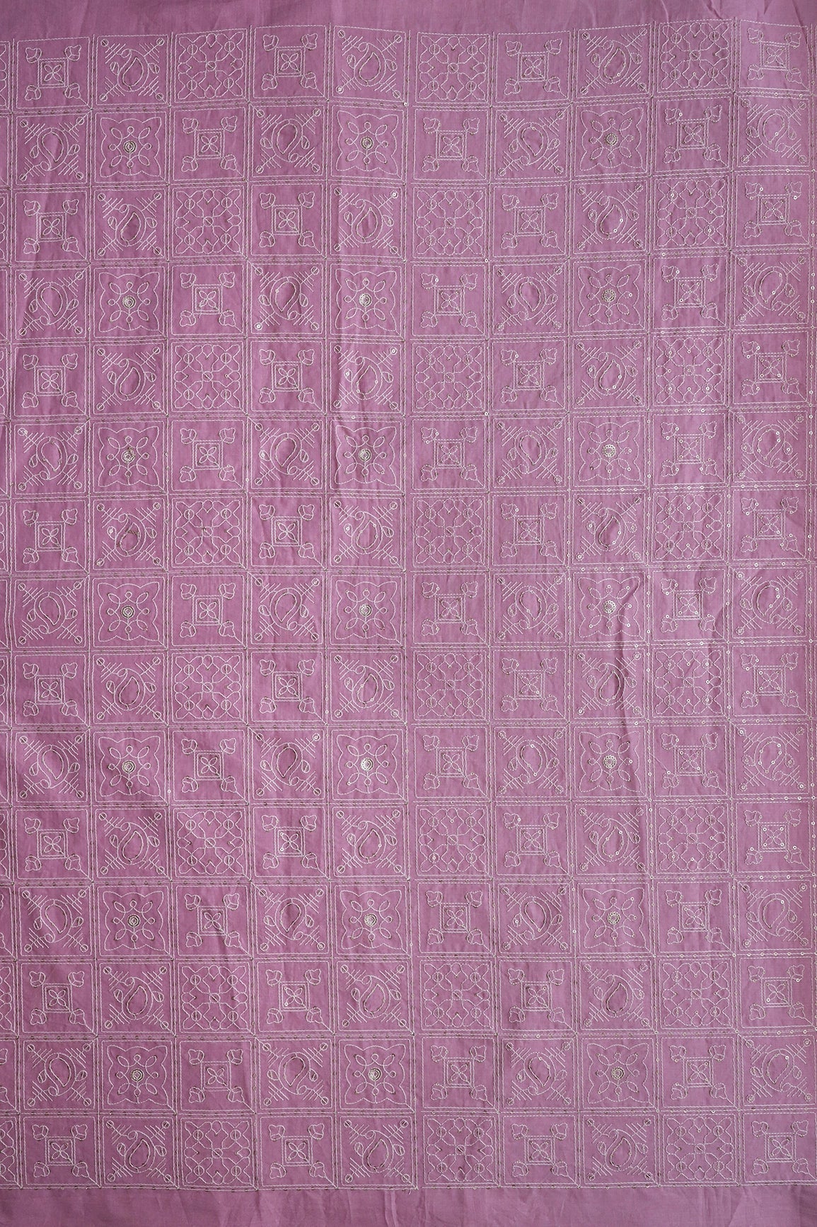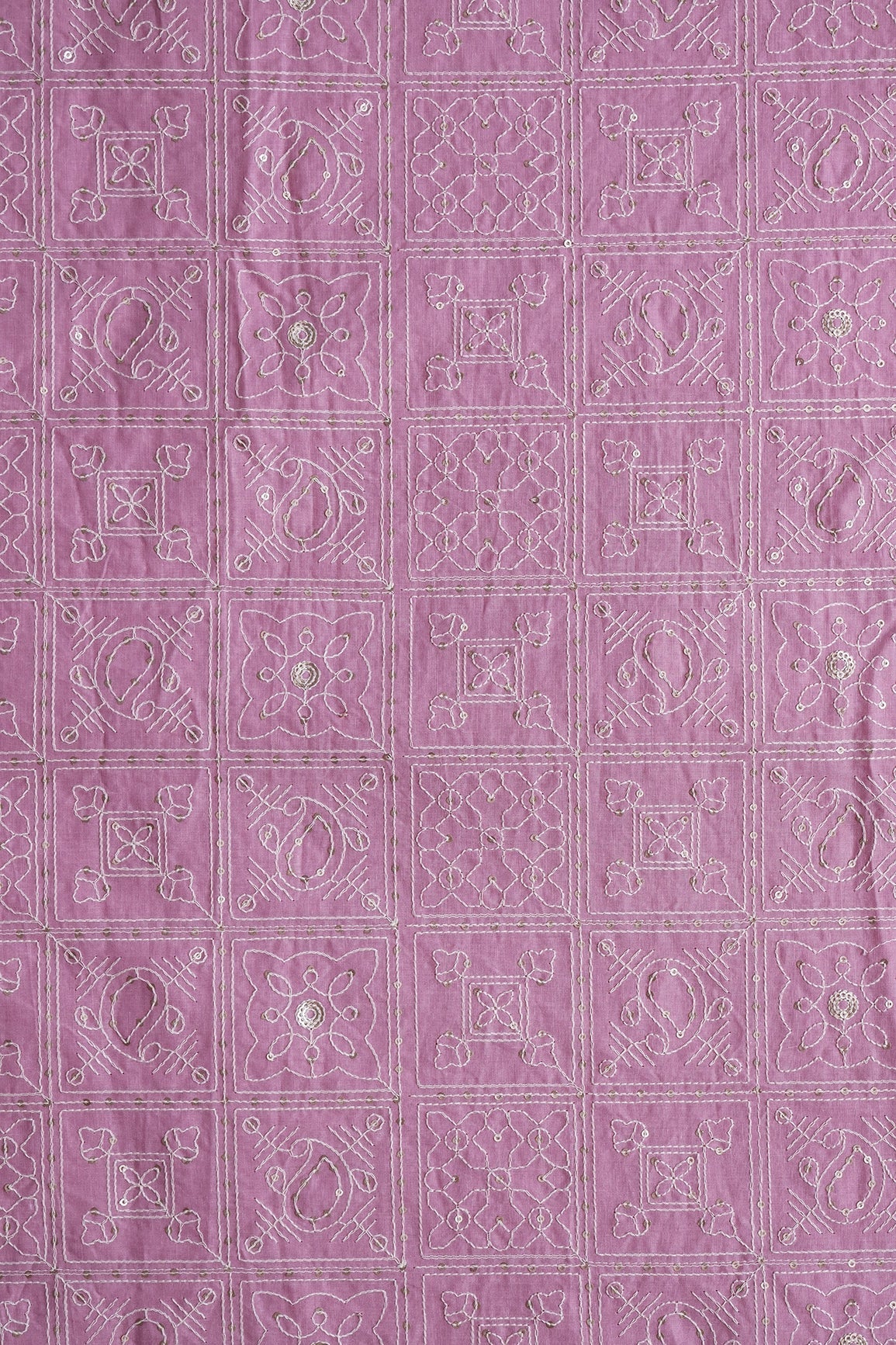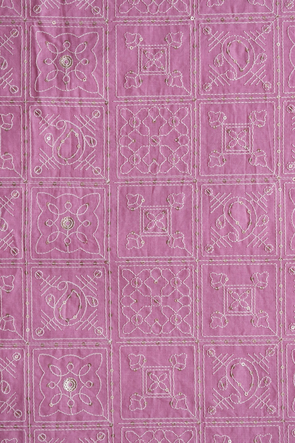 White Thread With Gold Sequins Geometric Embroidery Work On Pink Organic Cotton Fabric