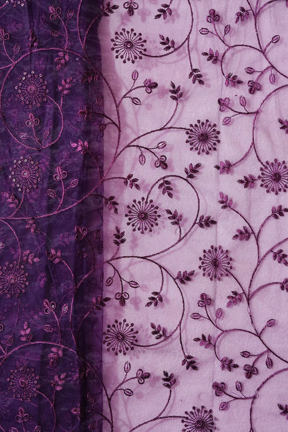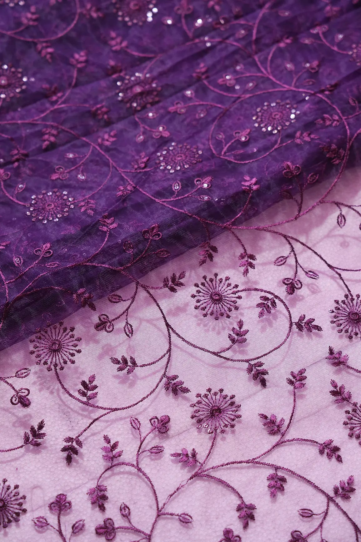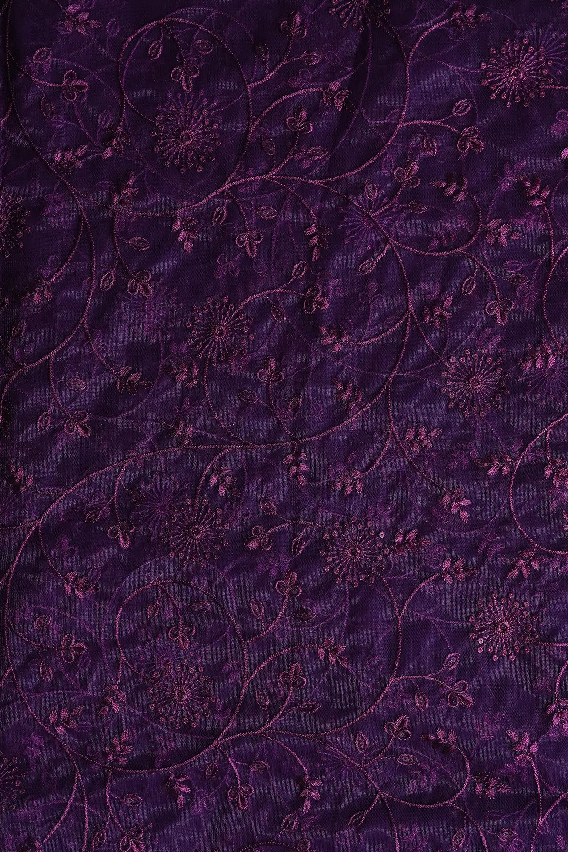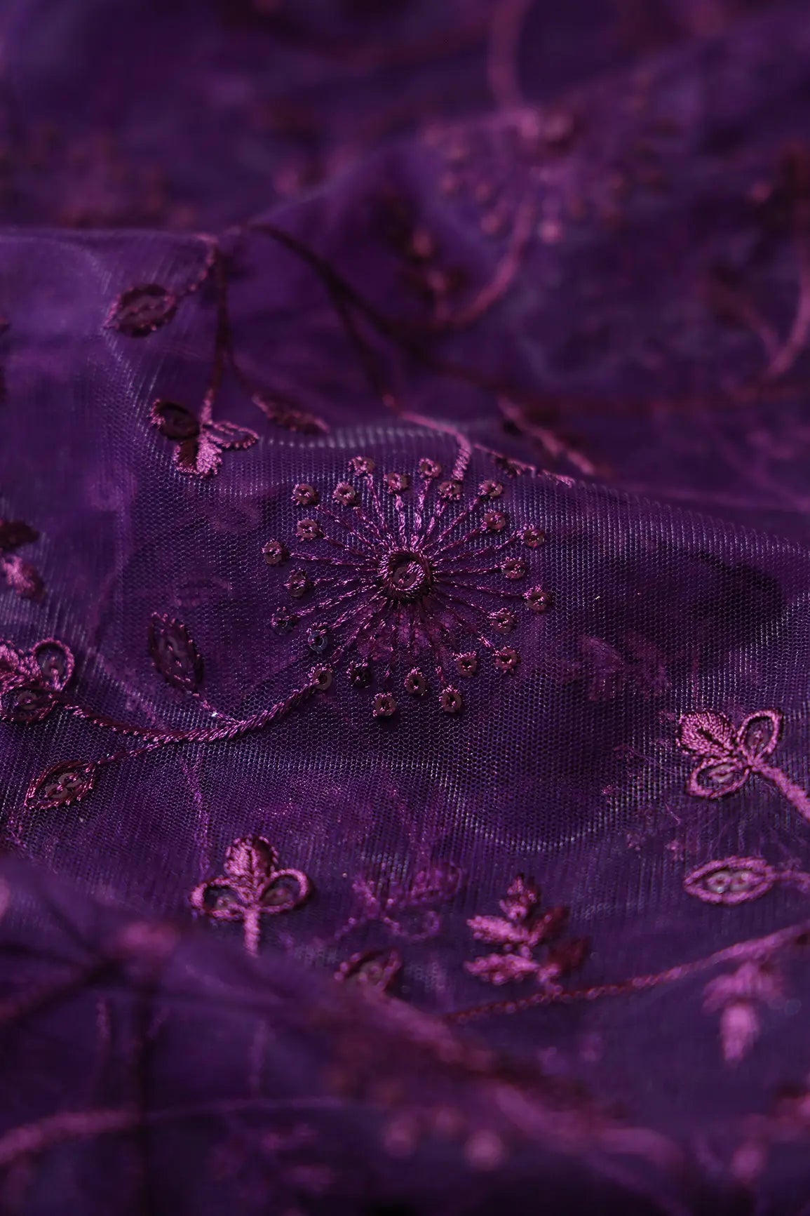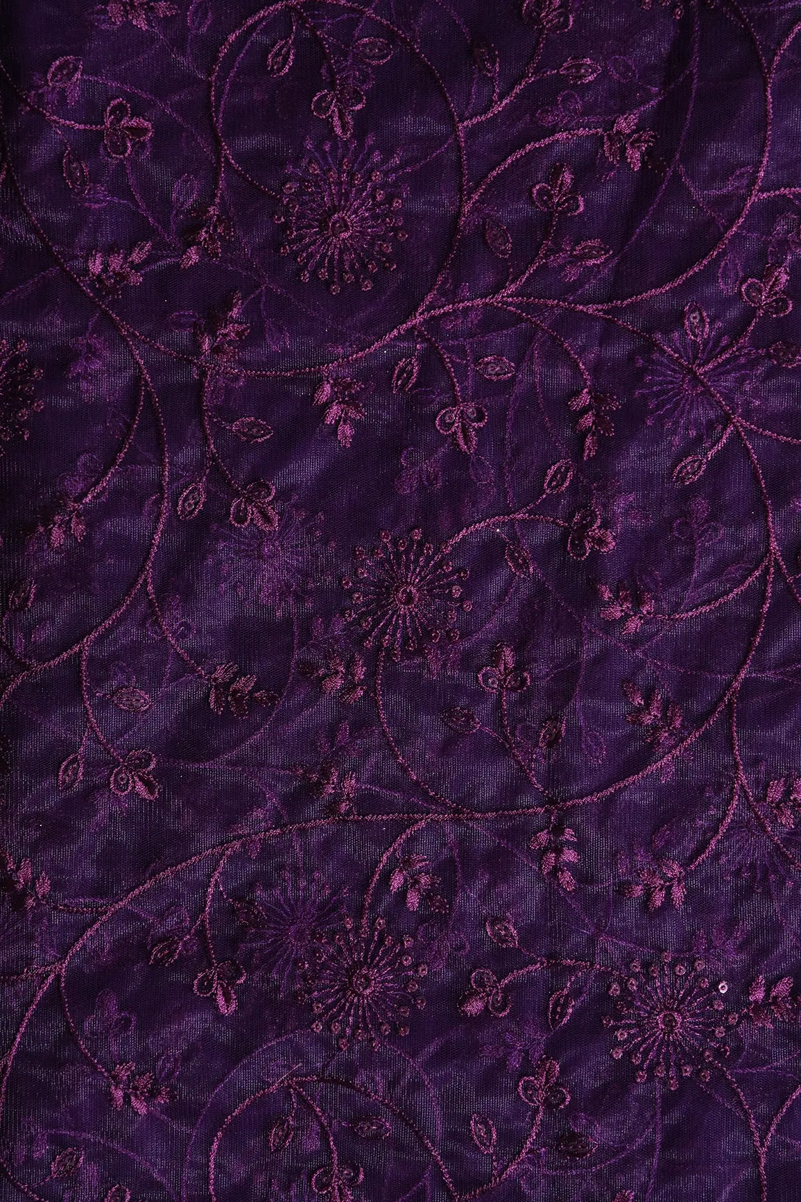 Wine Sequins With Wine Thread Floral Embroidery On Wine Soft Net Fabric