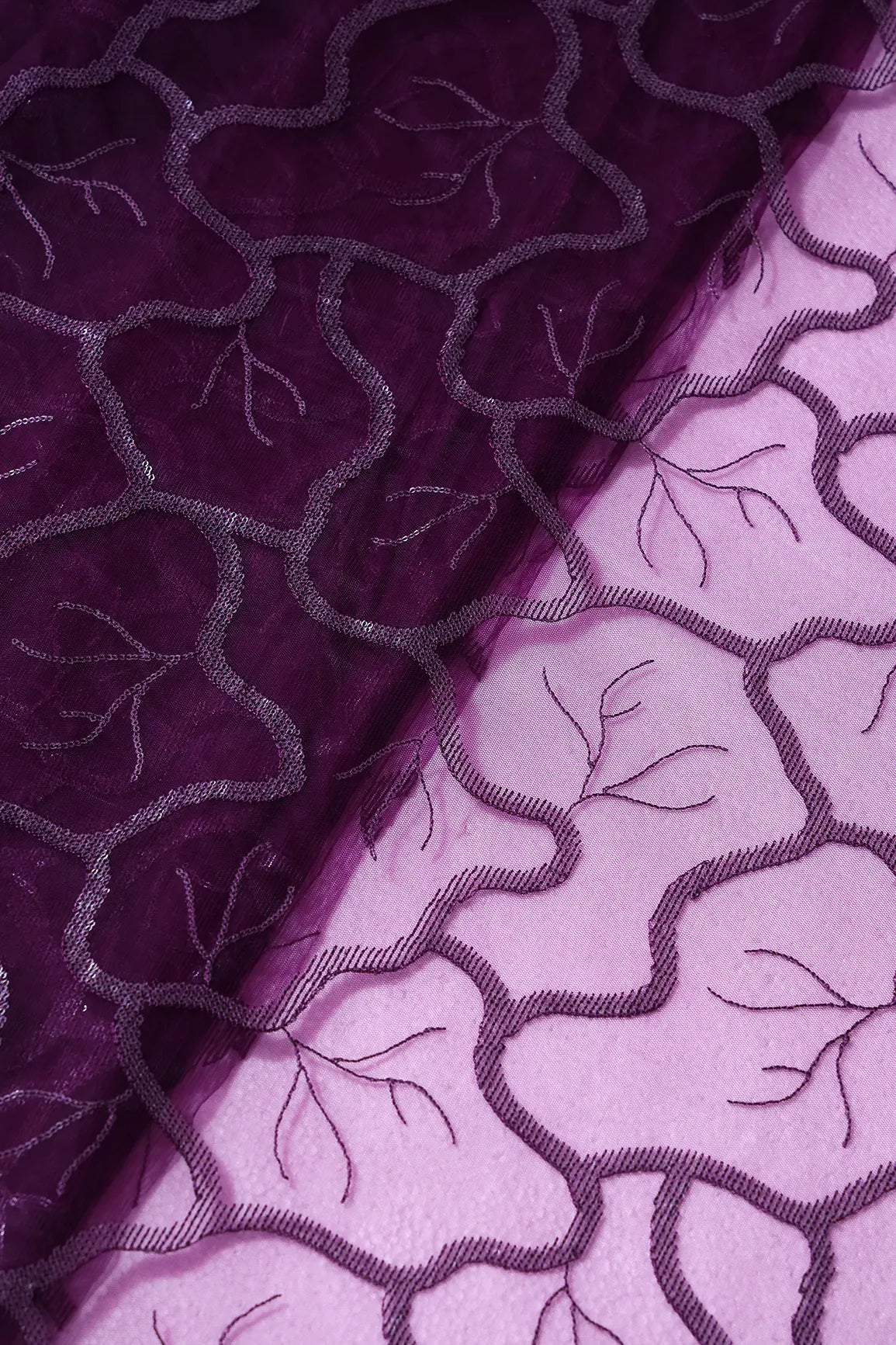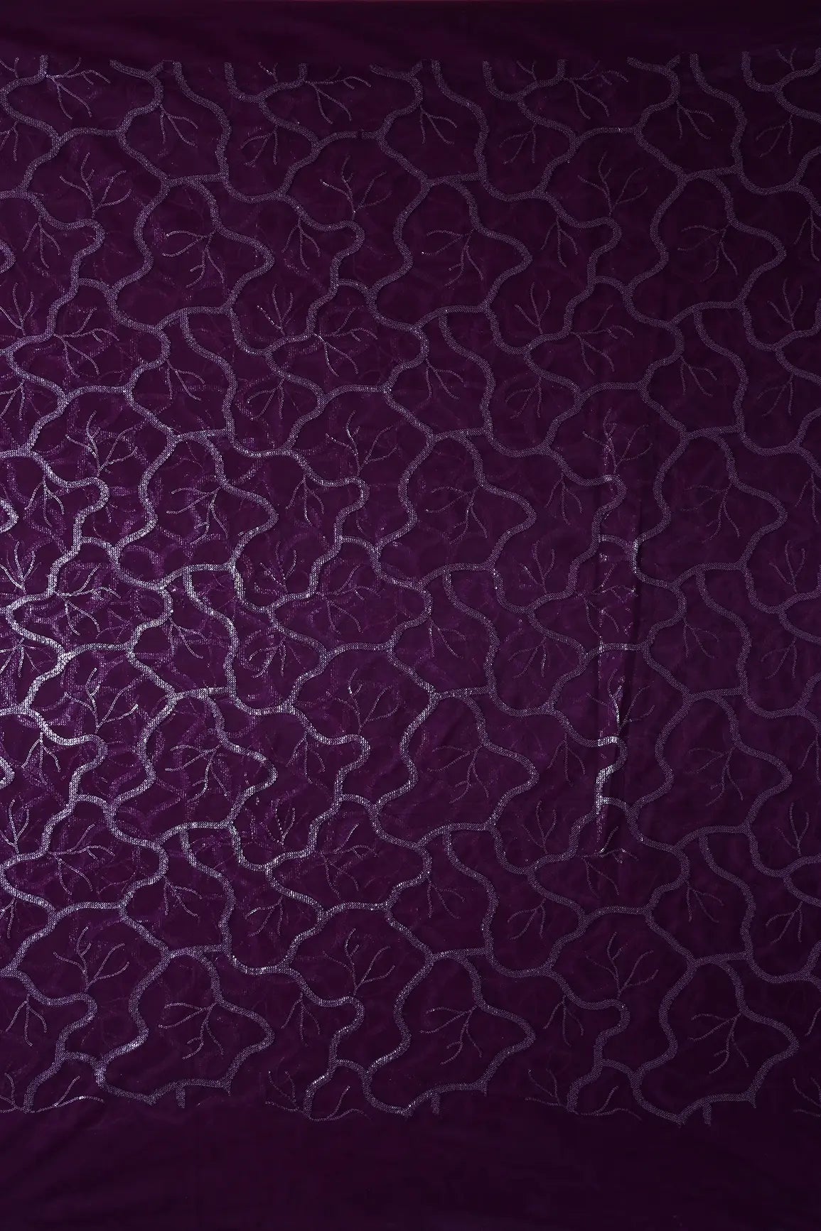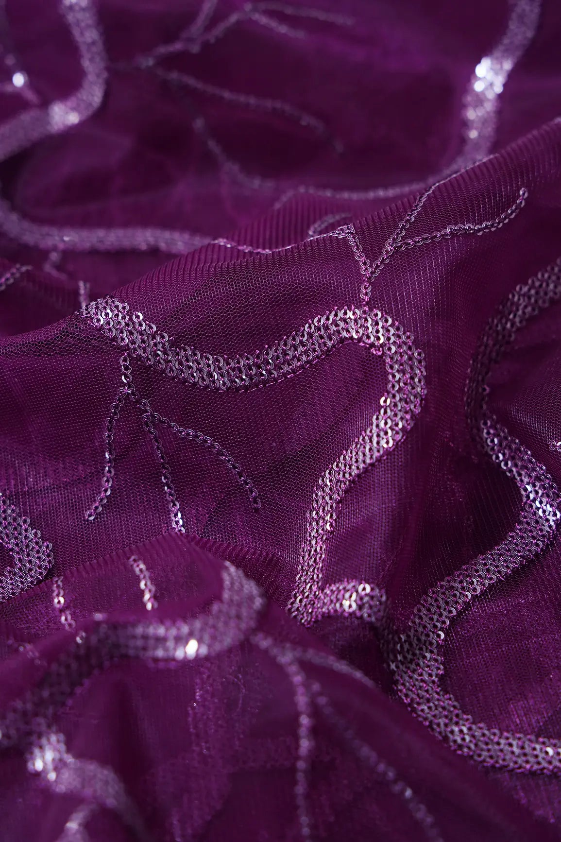 Wine Thread With Water Sequins Abstract Embroidery Work On Wine Soft Net Fabric