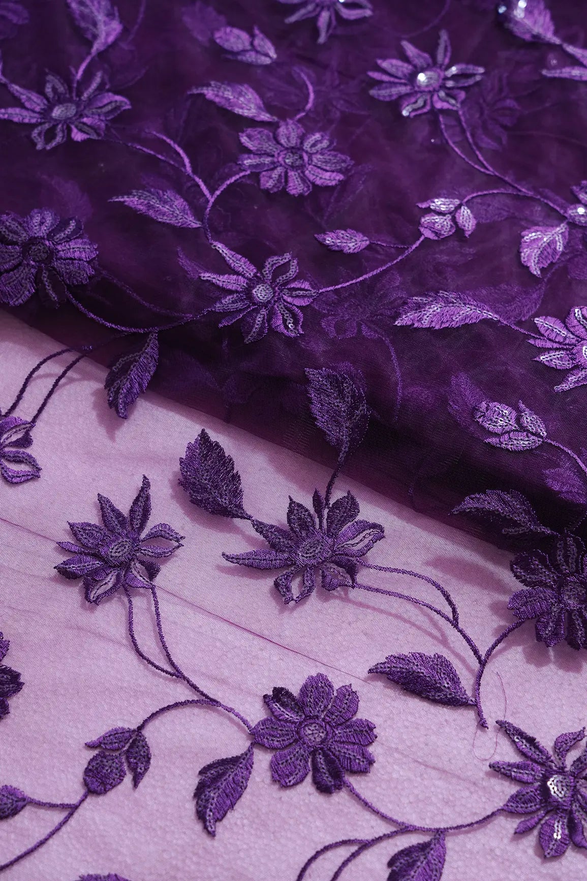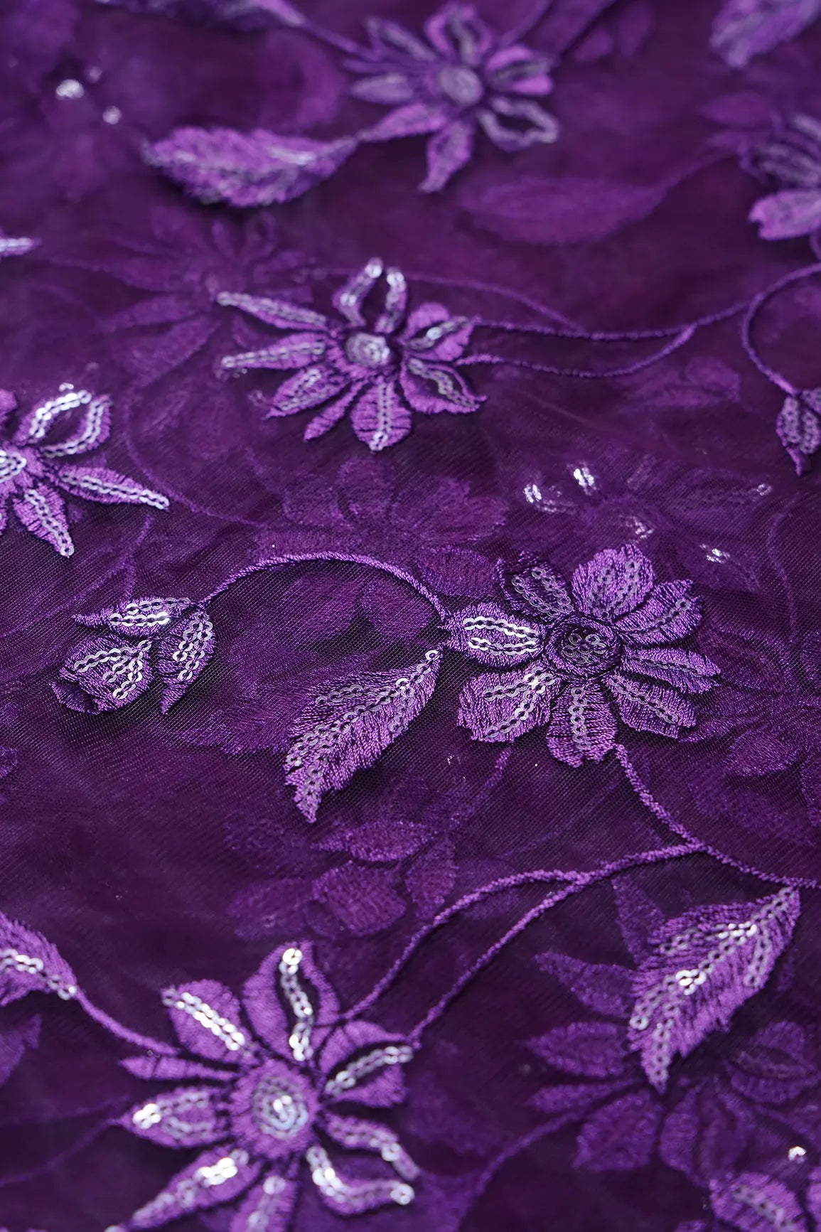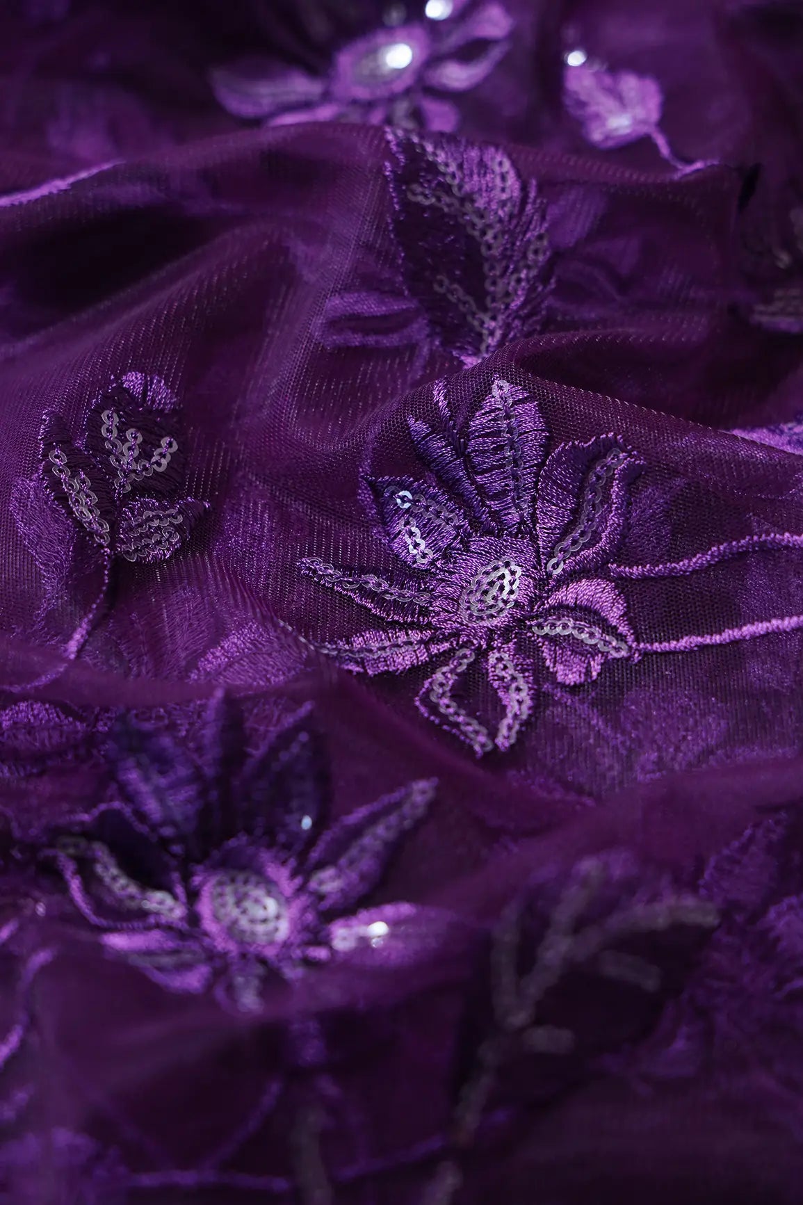 Wine Thread With Water Sequins Floral Embroidery On Wine Soft Net Fabric