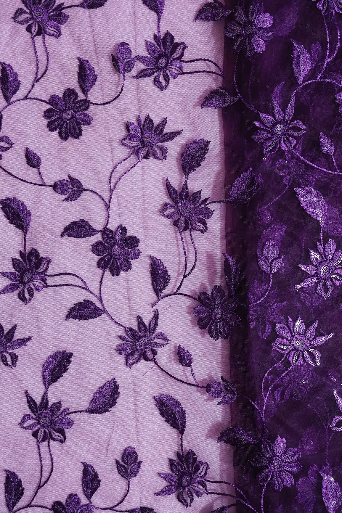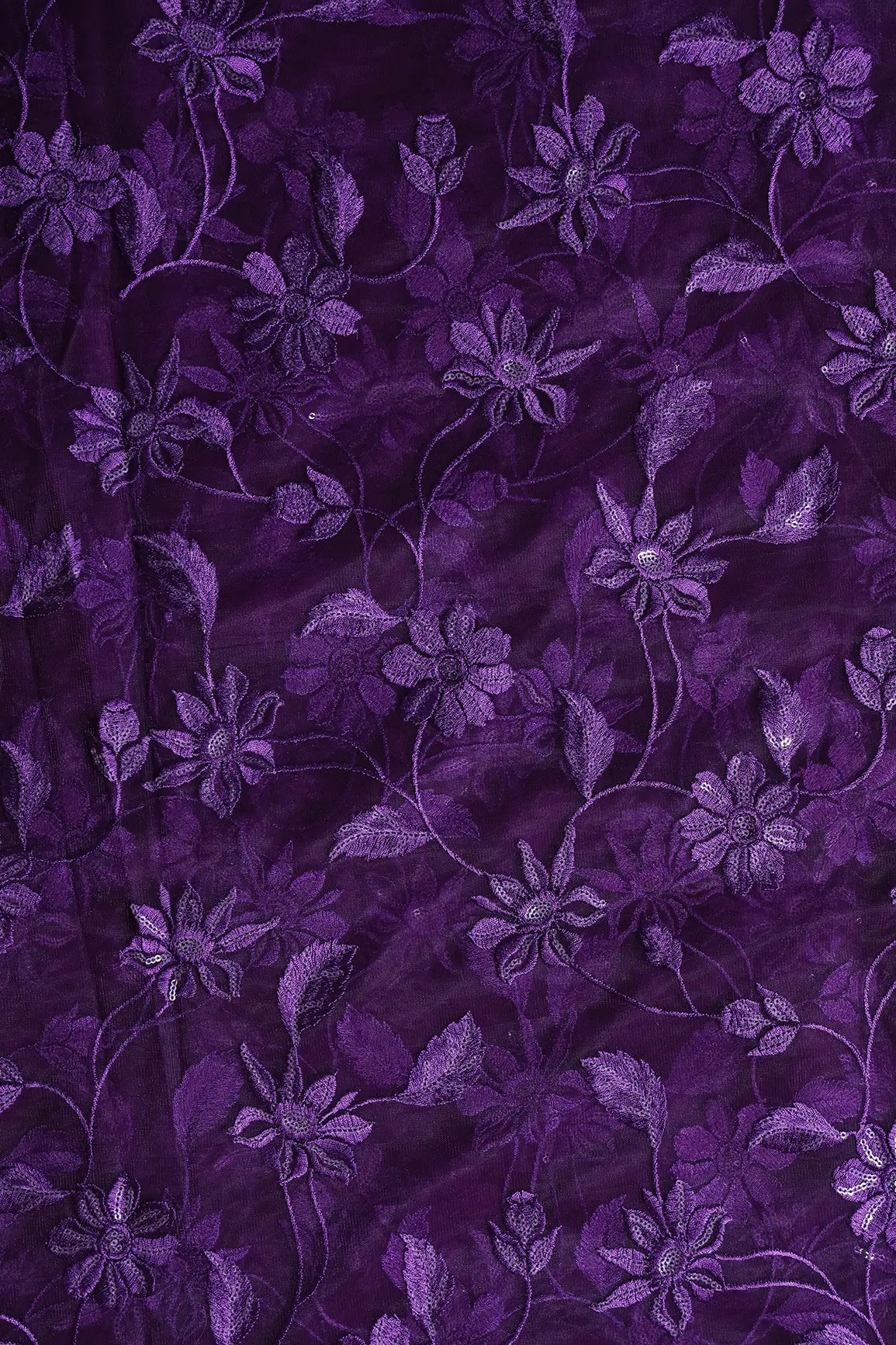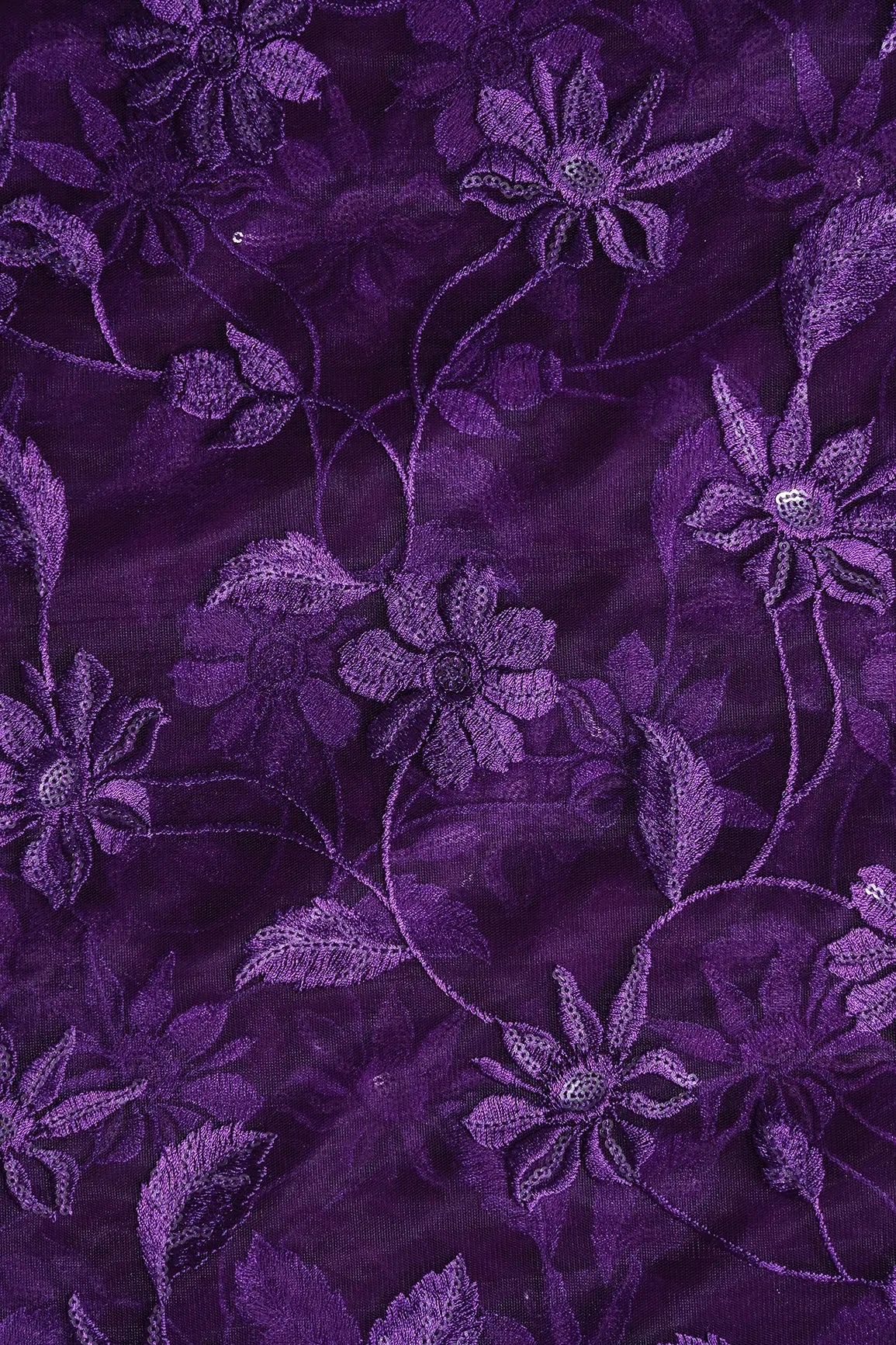 Wine Thread With Water Sequins Floral Embroidery On Wine Soft Net Fabric