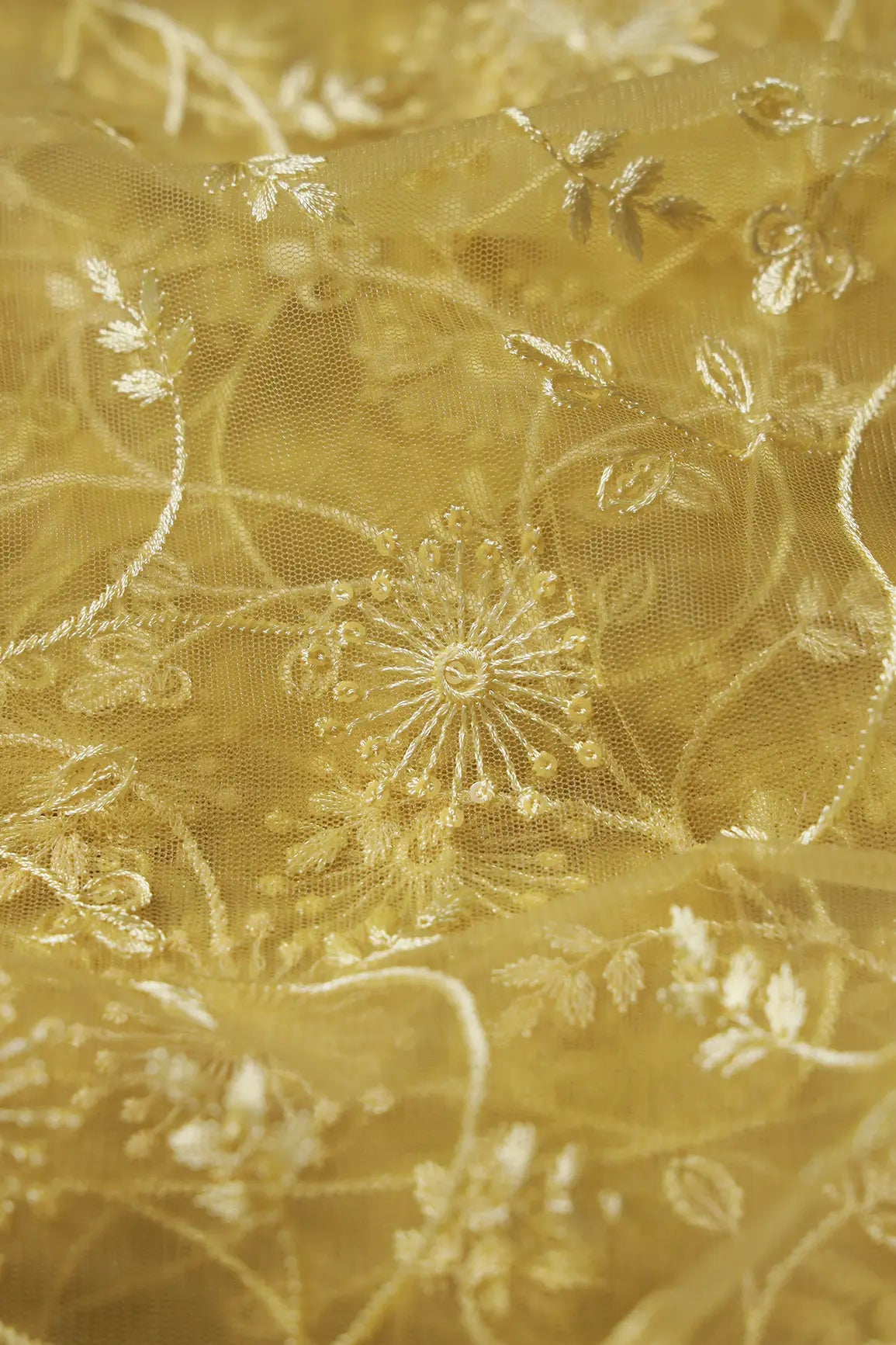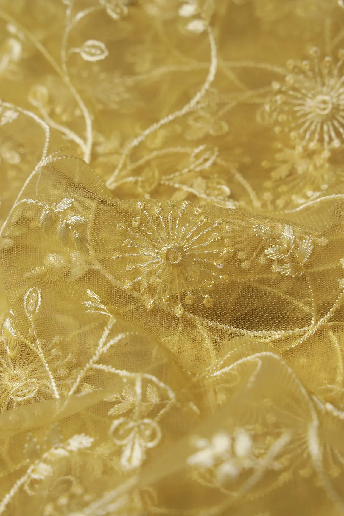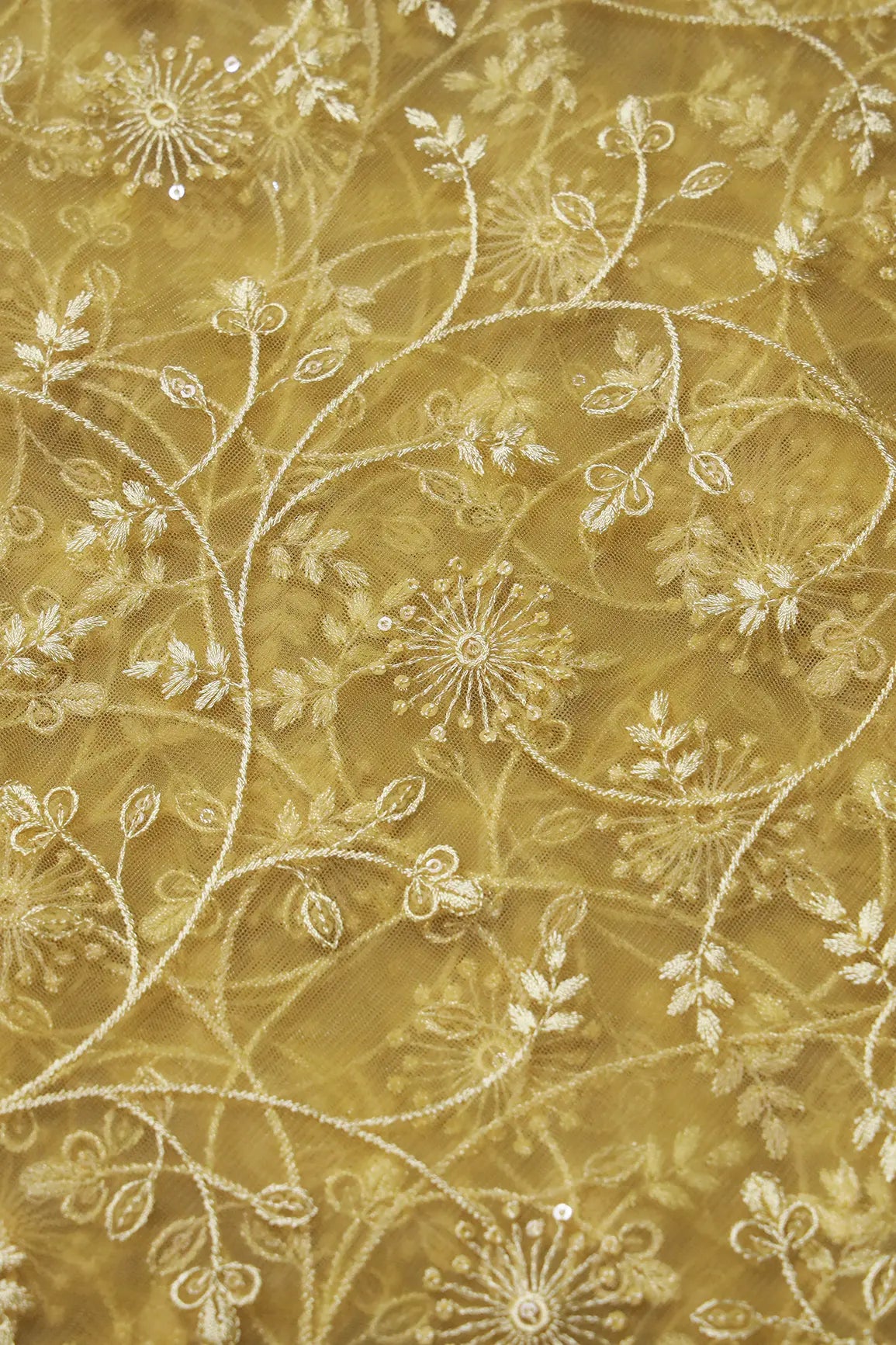 Yellow Sequins With Yellow Thread Floral Embroidery On Yellow Soft Net Fabric