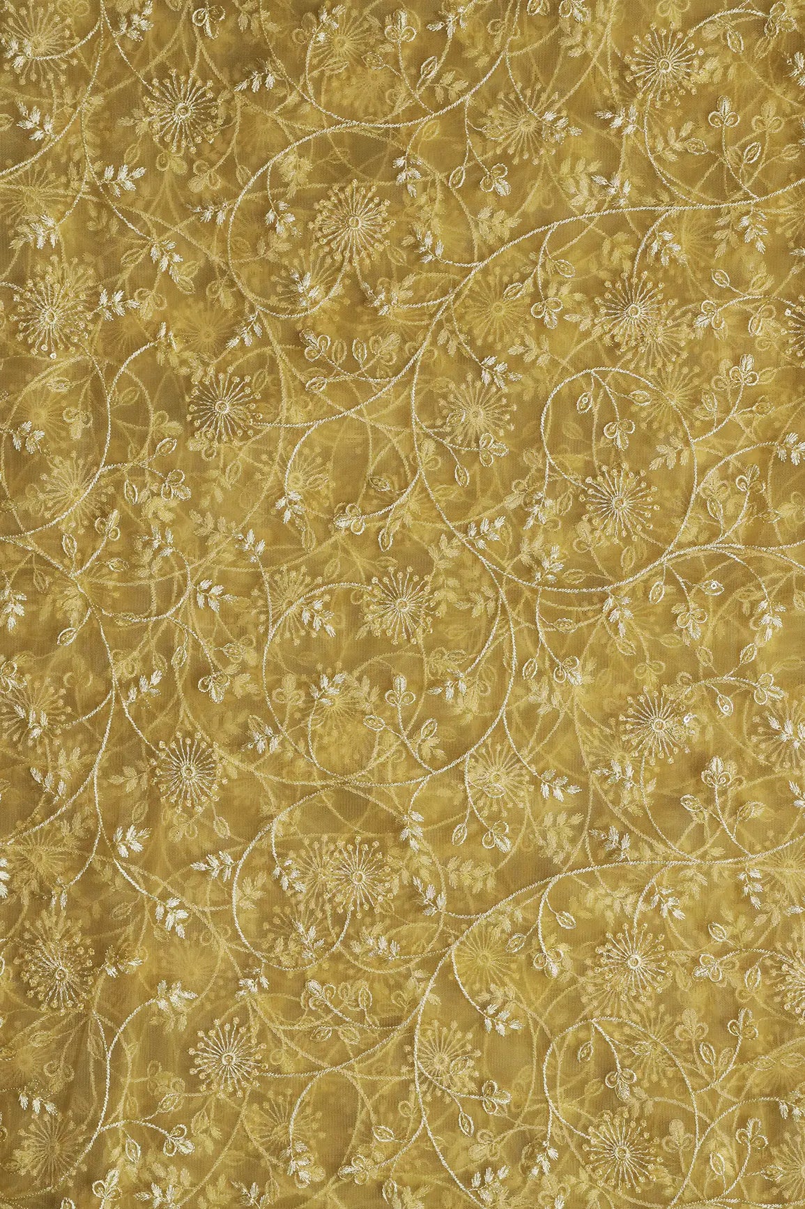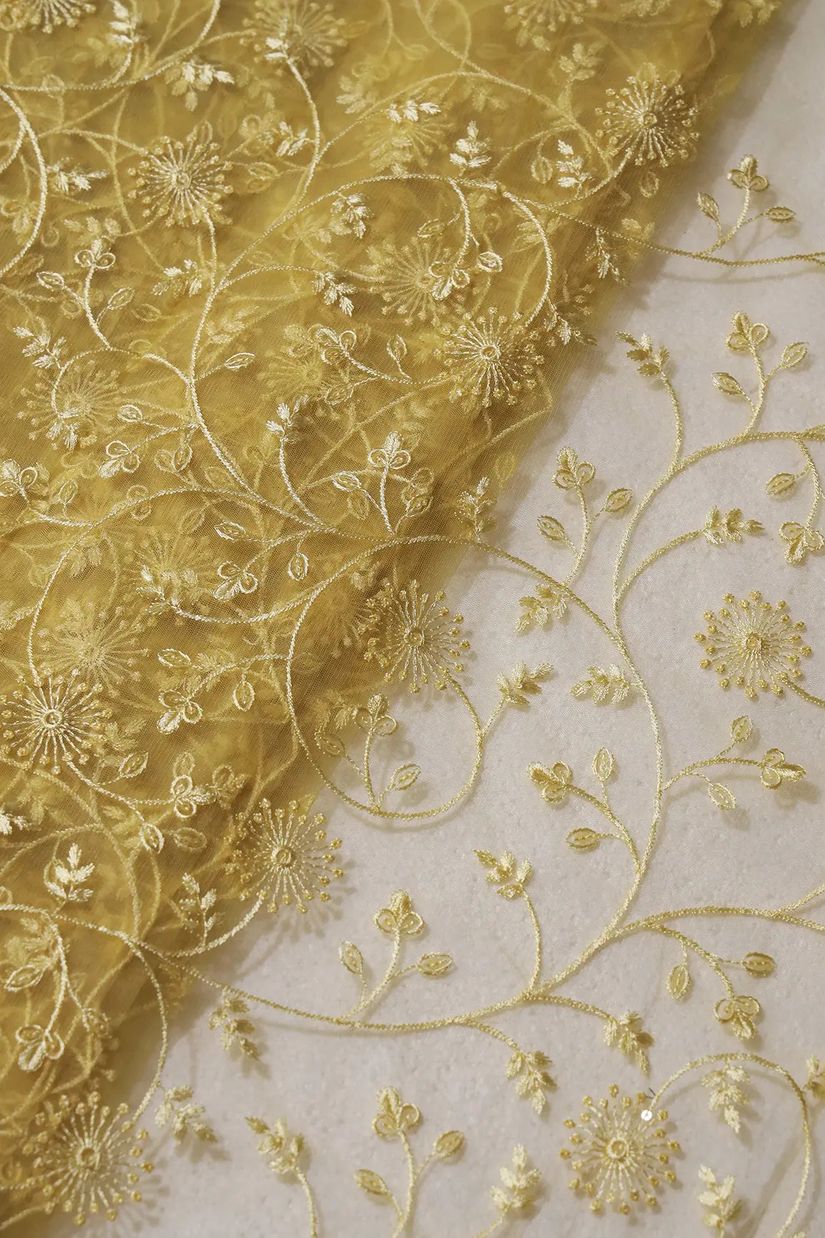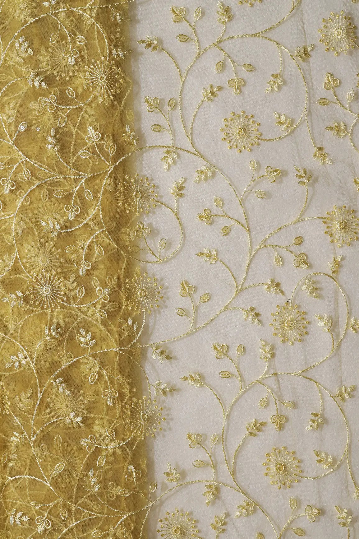 Yellow Sequins With Yellow Thread Floral Embroidery On Yellow Soft Net Fabric