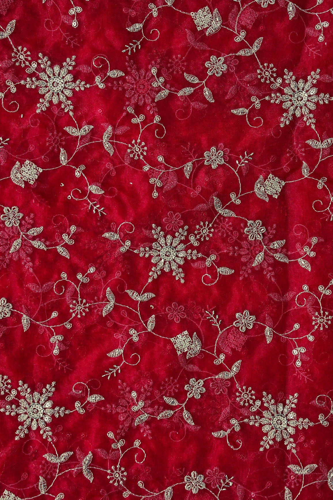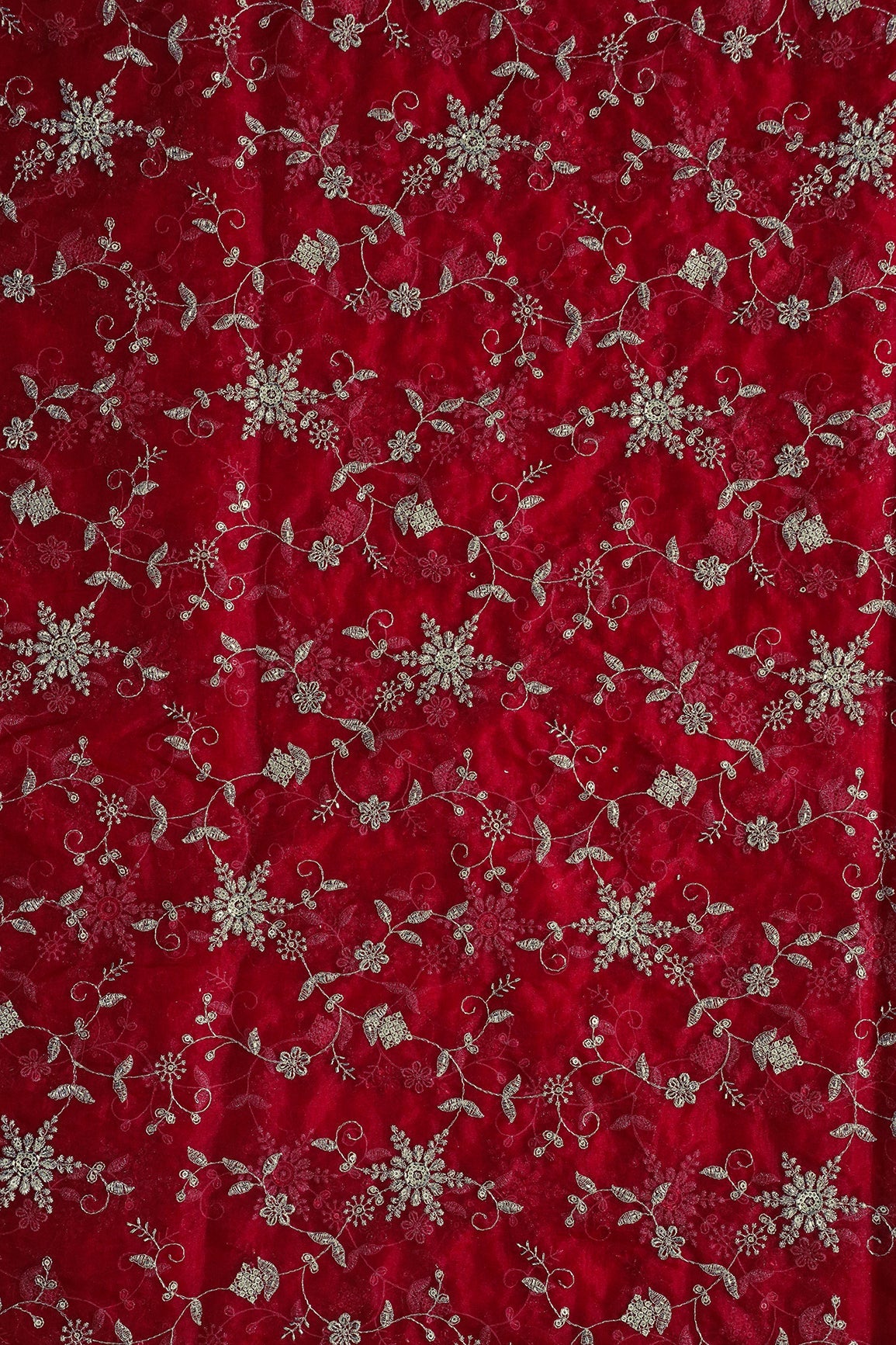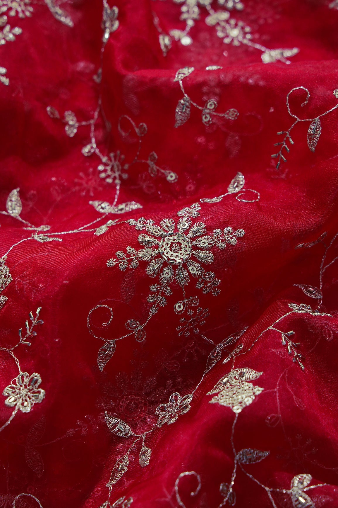 Zari Thread With Beads Floral Embroidery On Red Organza Fabric