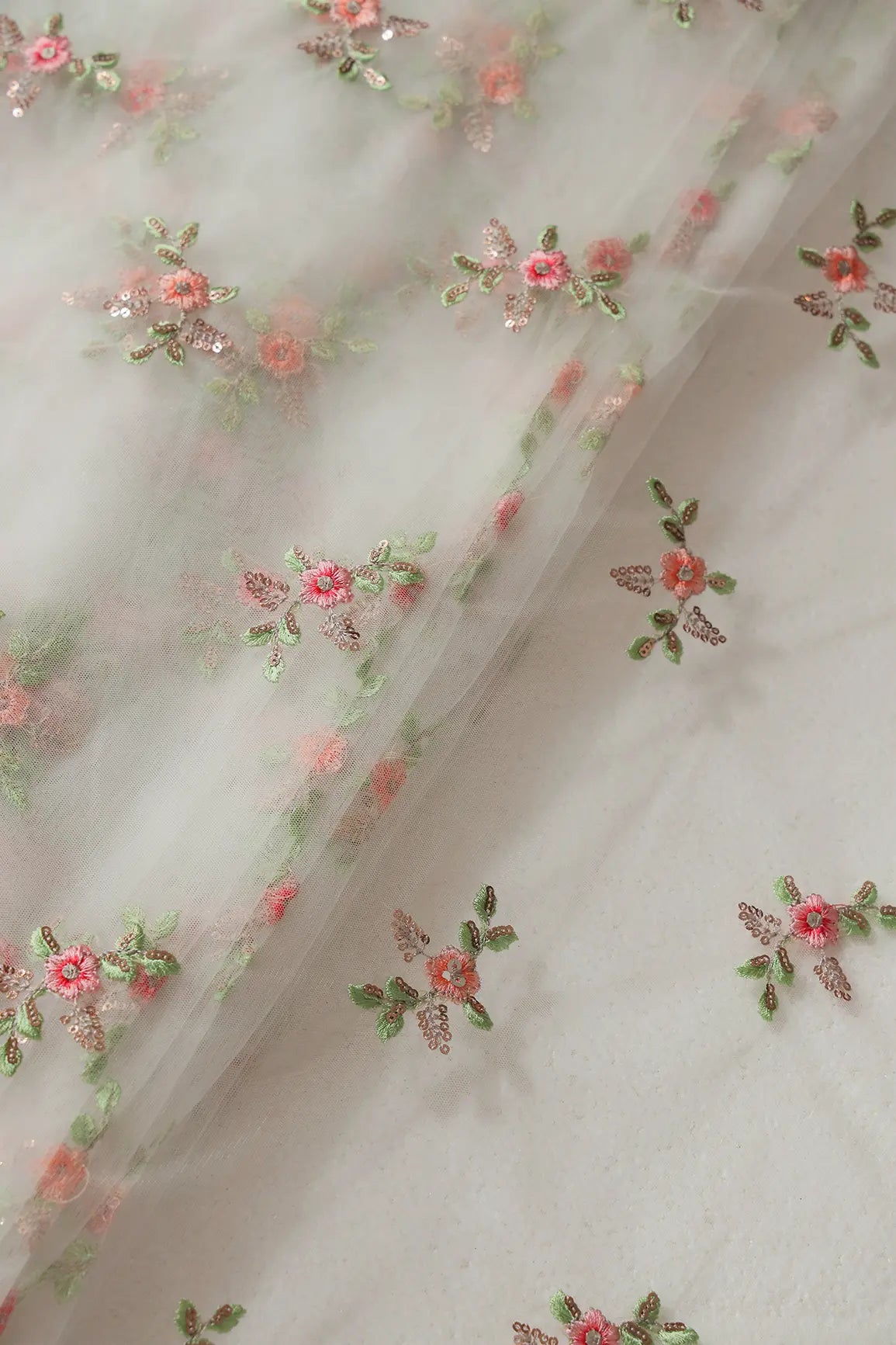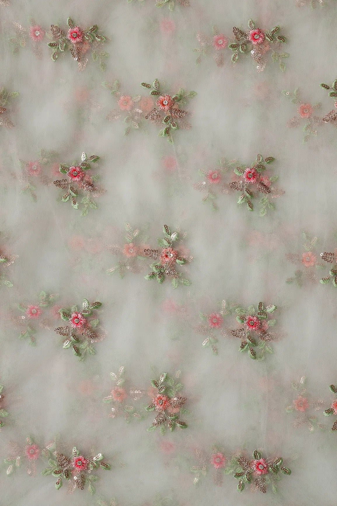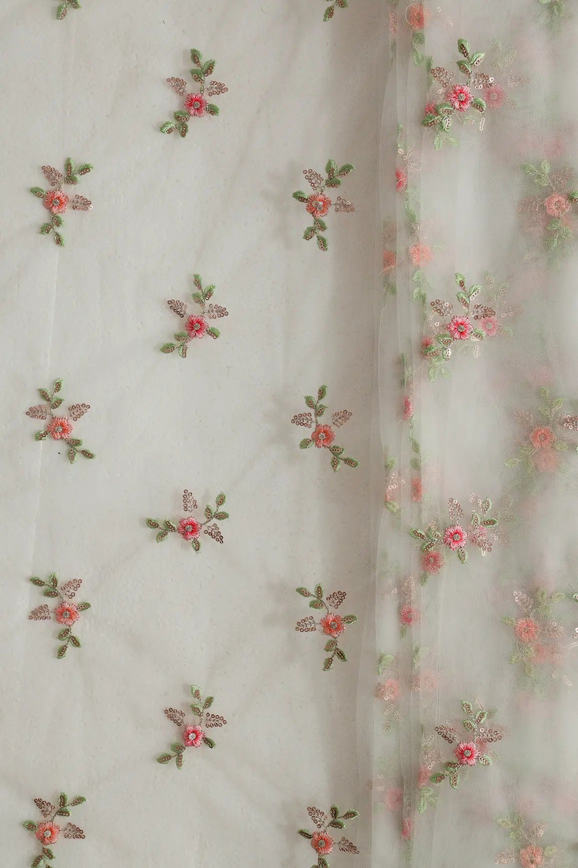 Olive And Pink Thread With Gold Sequins Floral Butta Embroidery On Dyeable White Soft Net Fabric