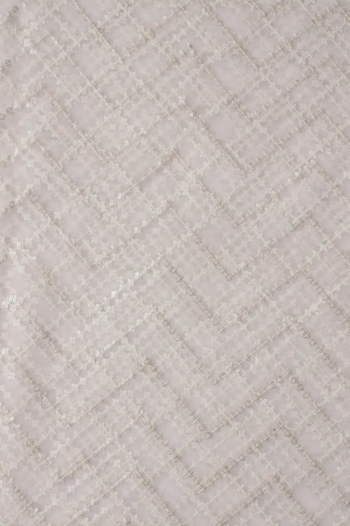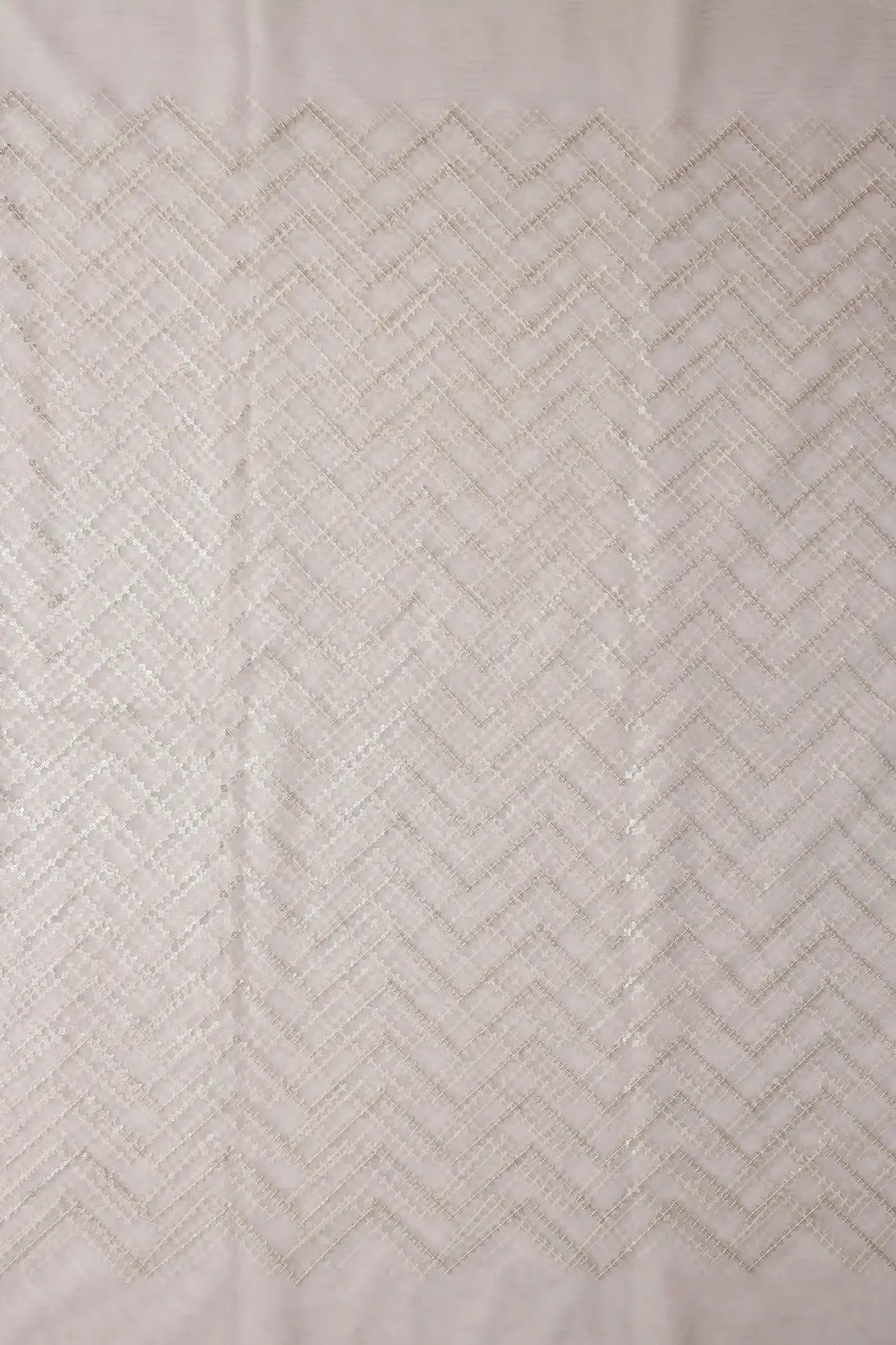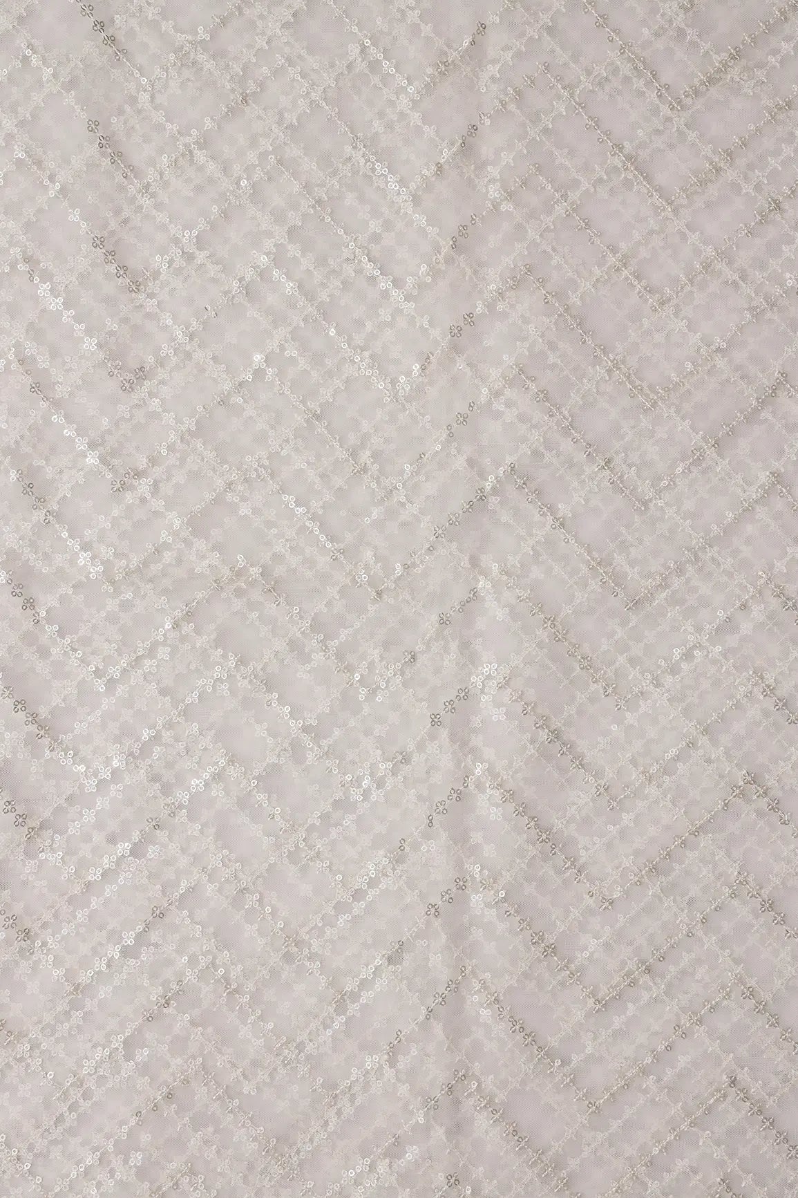 Silver Sequins Chevron Embroidery Work On White Dyeable Soft Net Fabric