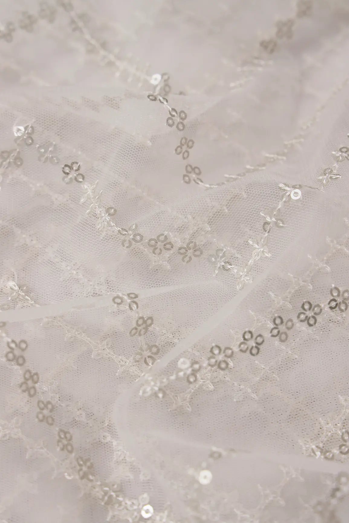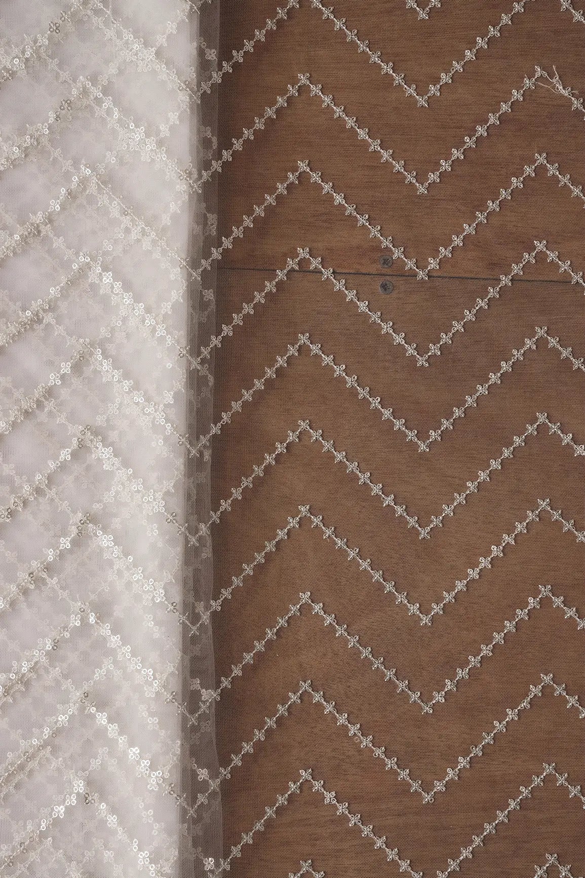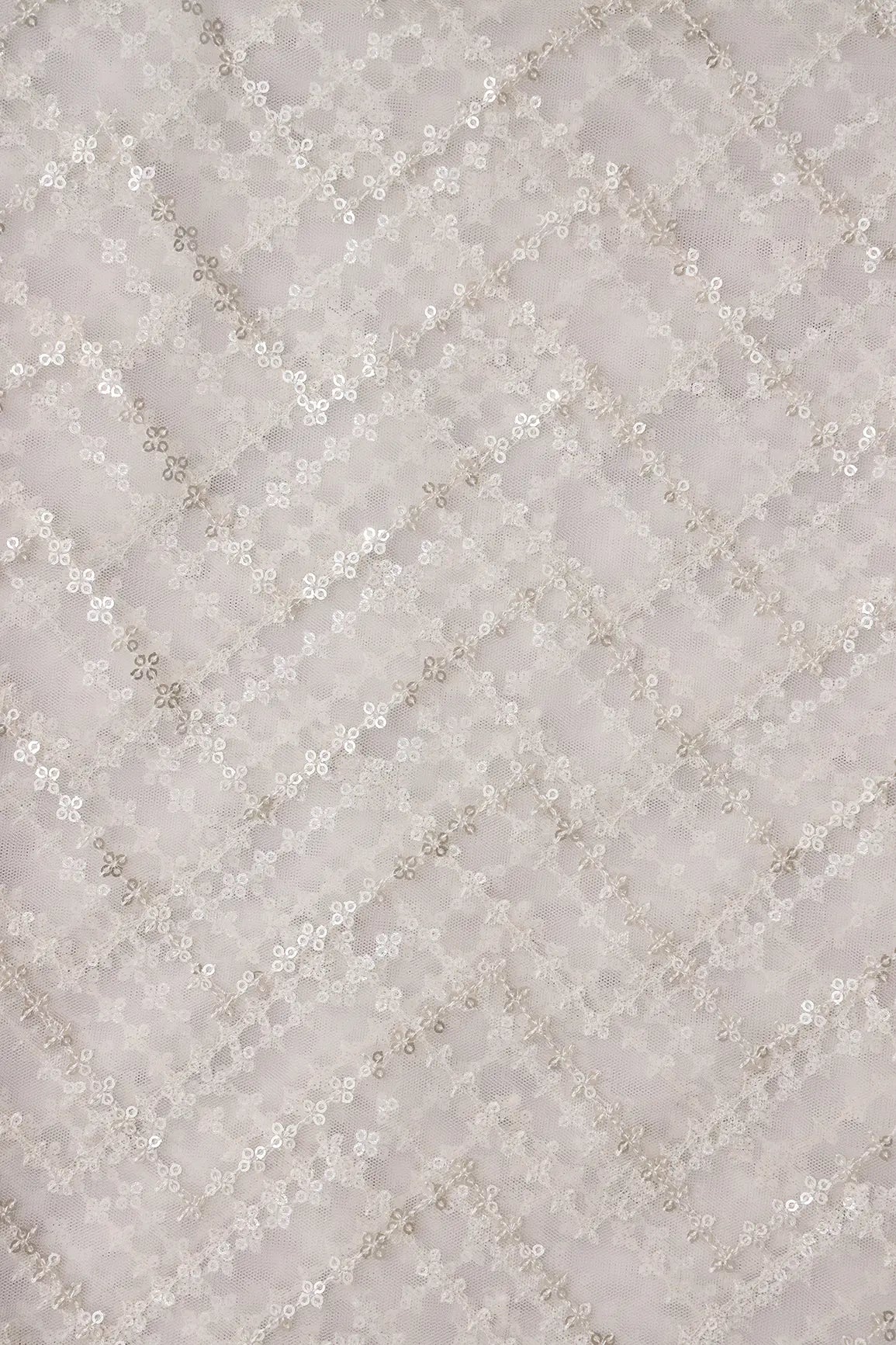 Silver Sequins Chevron Embroidery Work On White Dyeable Soft Net Fabric