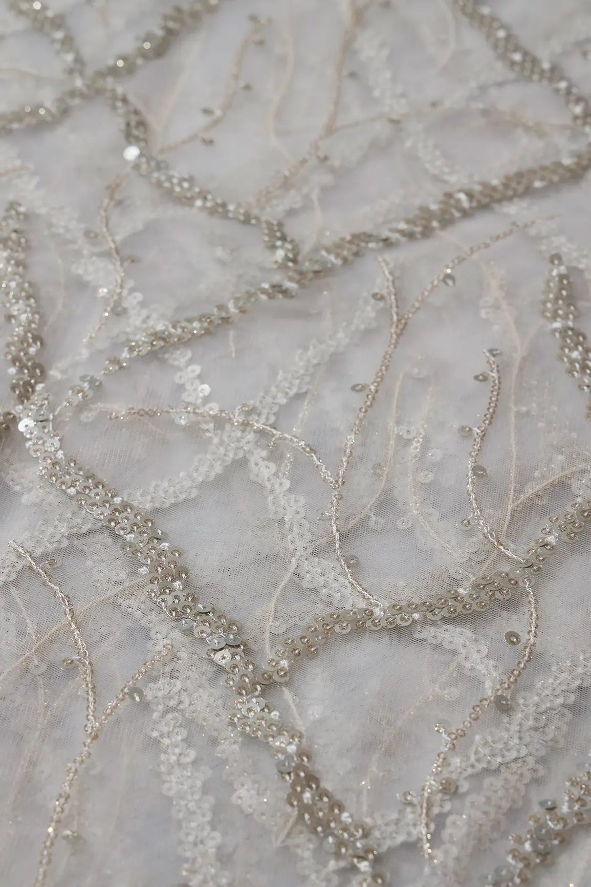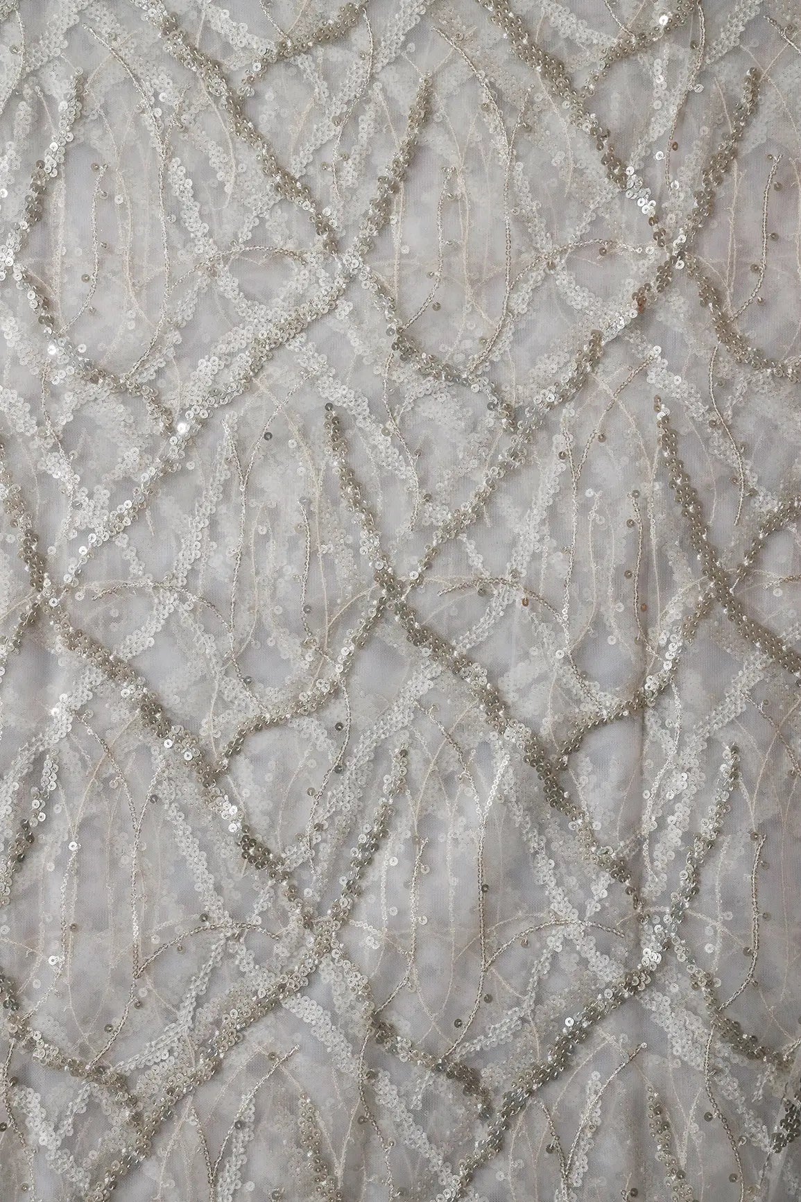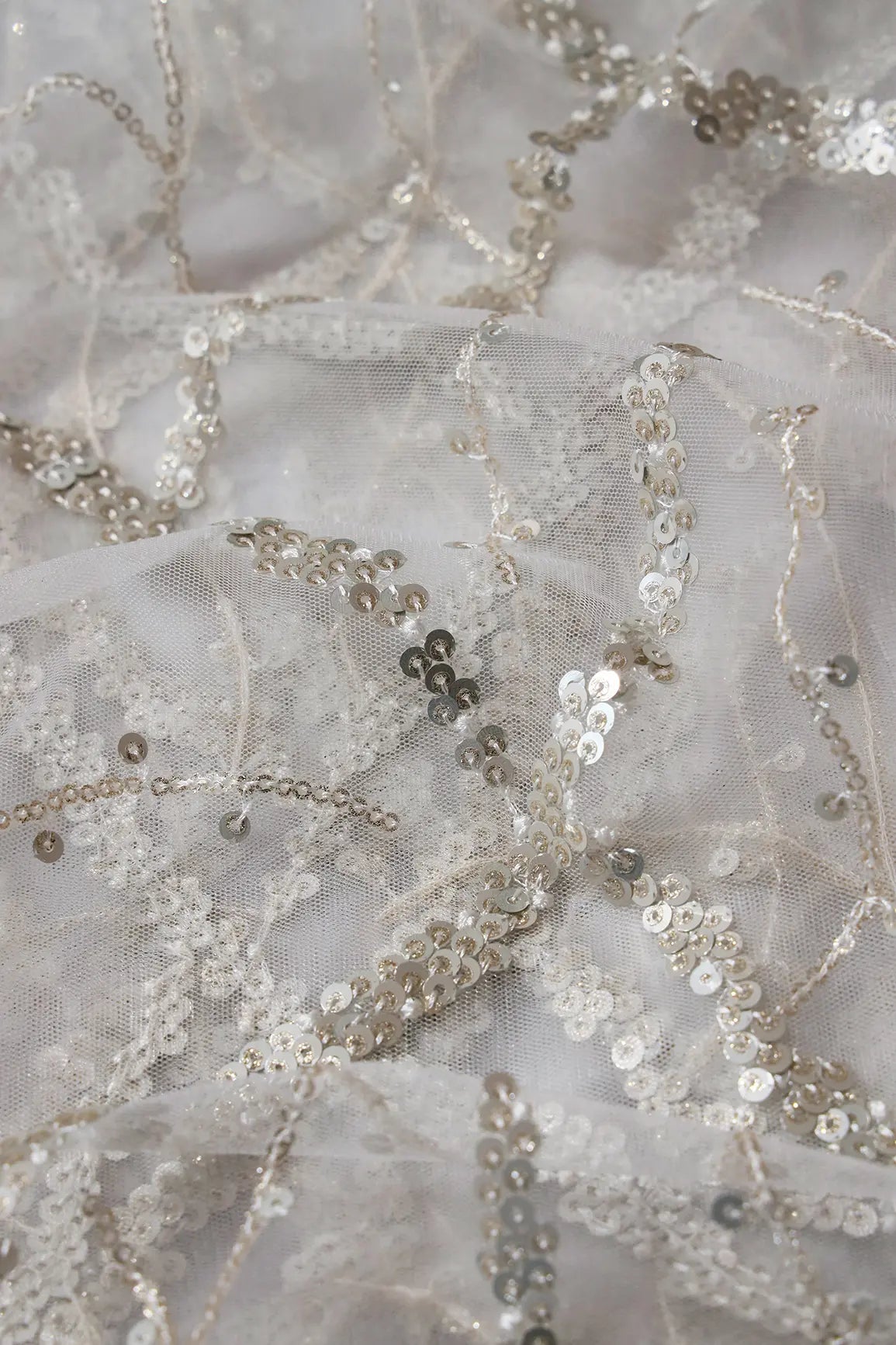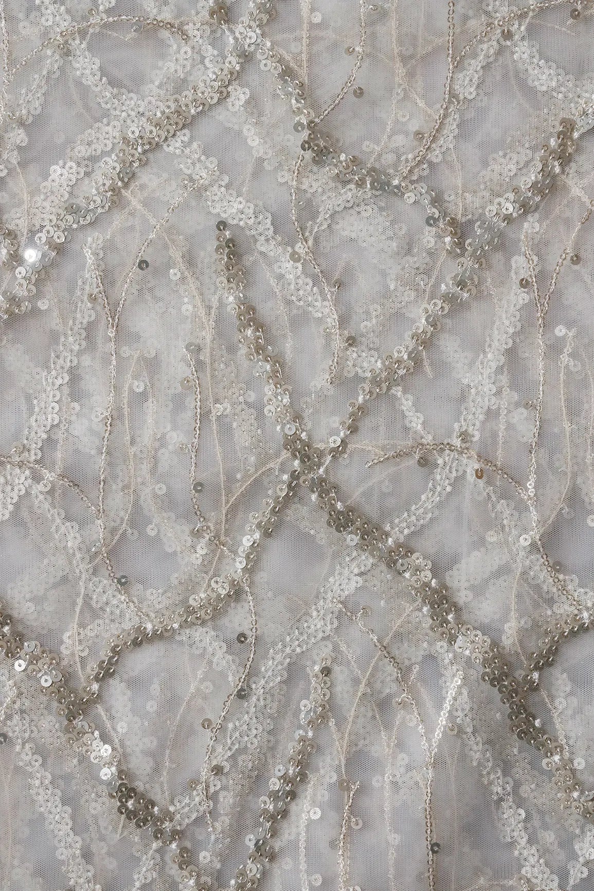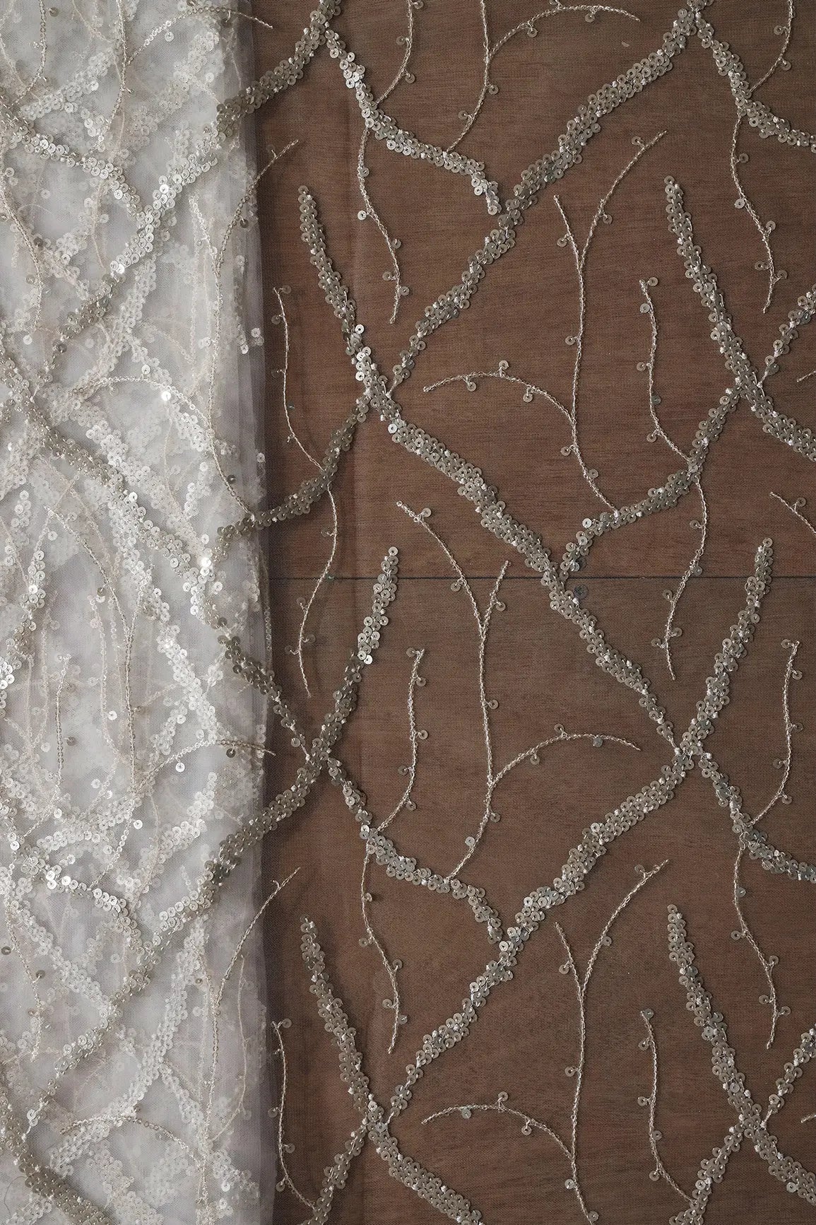 Silver Sequins Geometric Embroidery On White Dyeable Soft Net Fabric