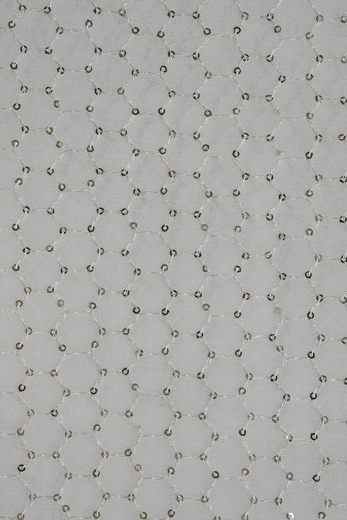 Small Trellis Gold Sequins Embroidery Work On White Dyeable Chinnon Chiffon Fabric