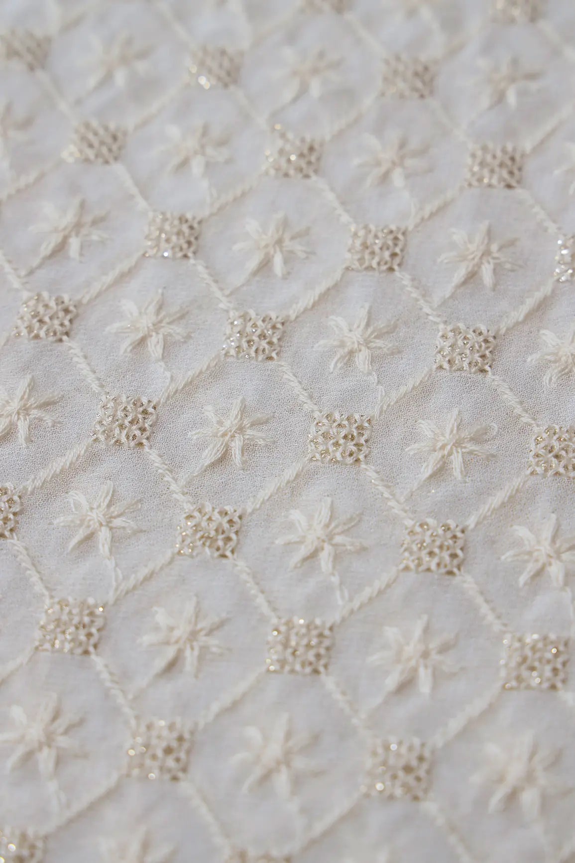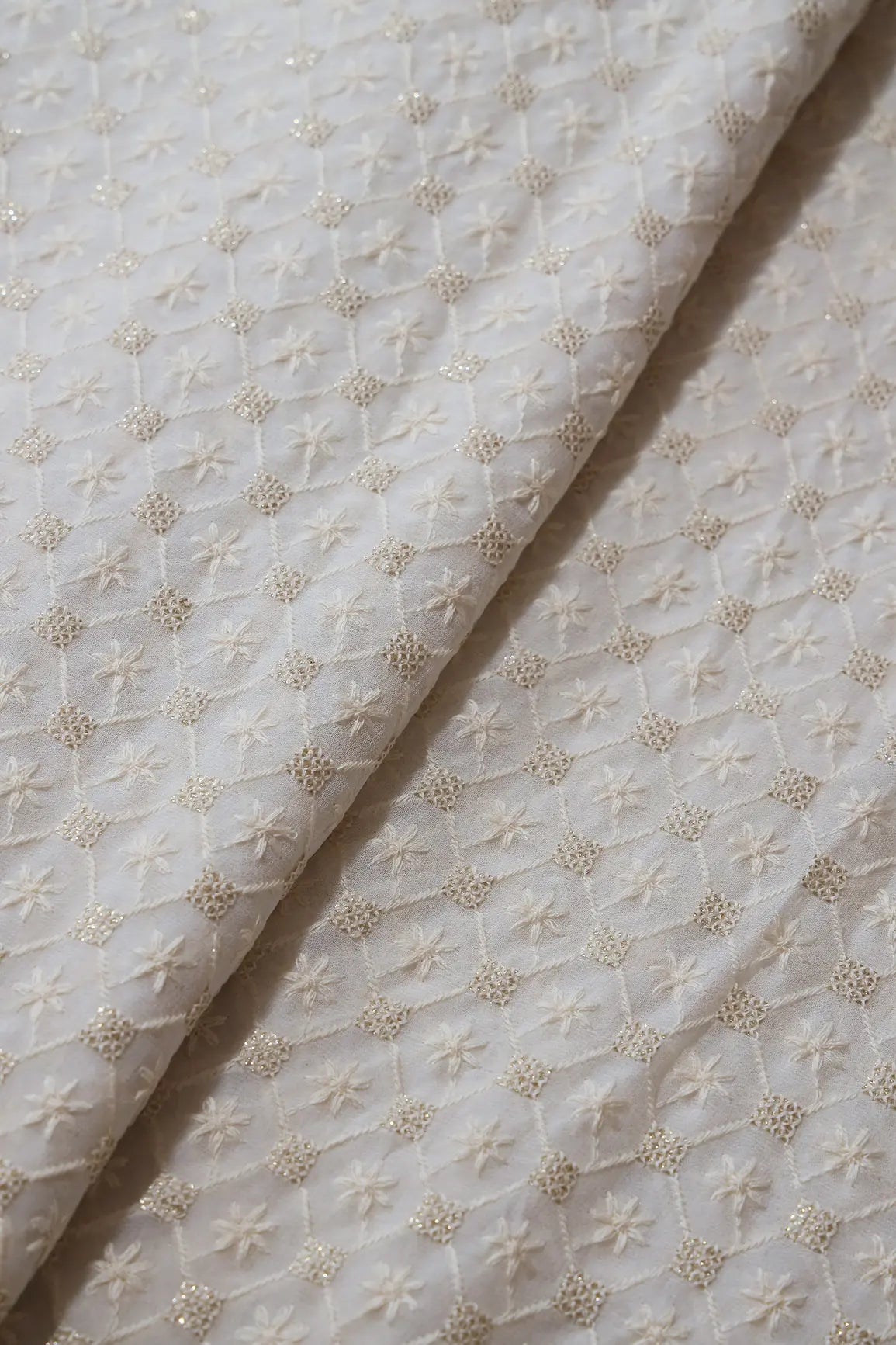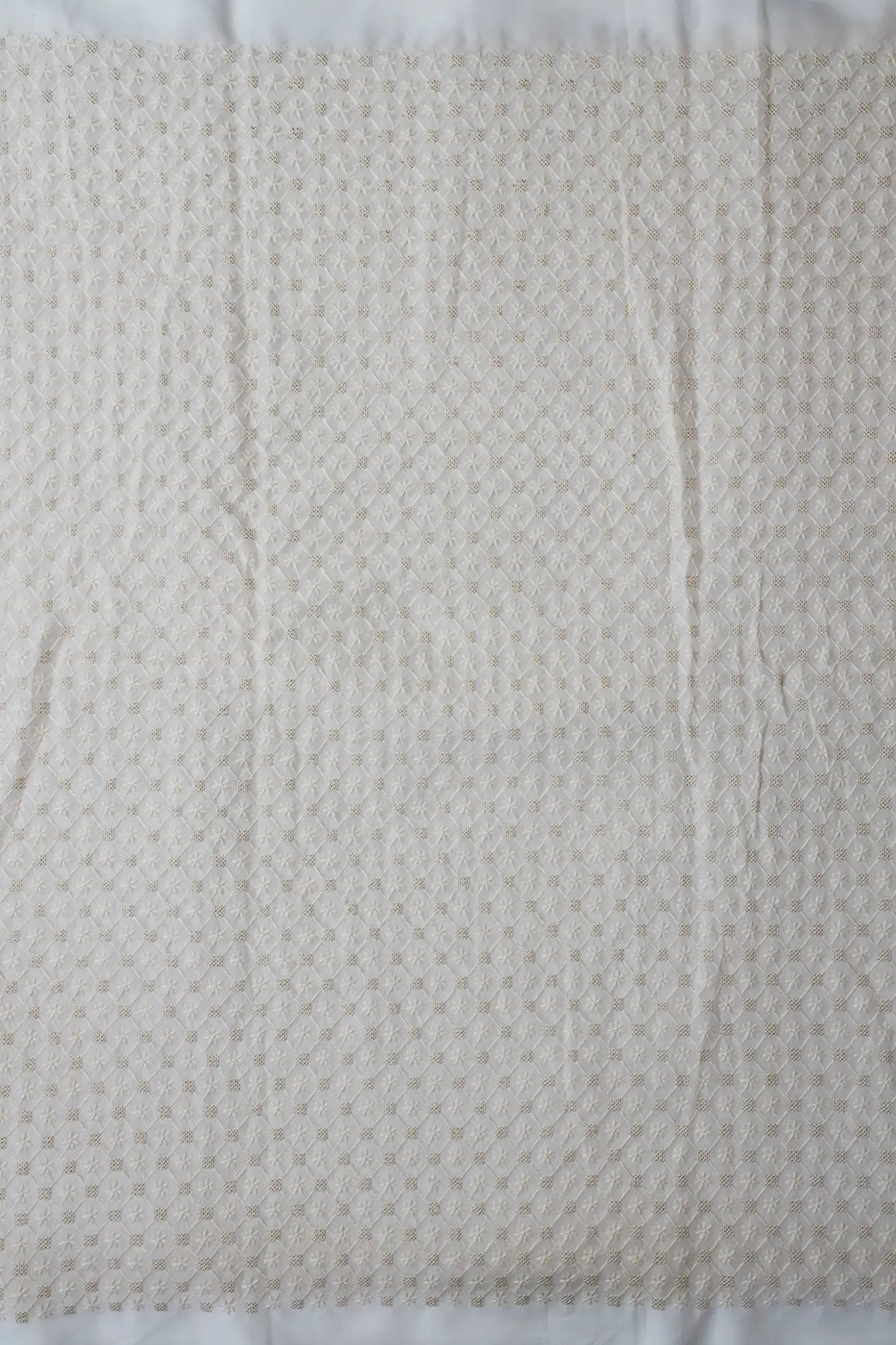 White Thread With Gold Glitter Sequins Checks Lucknowi Embroidery On Dyeable Viscose Georgette Fabric