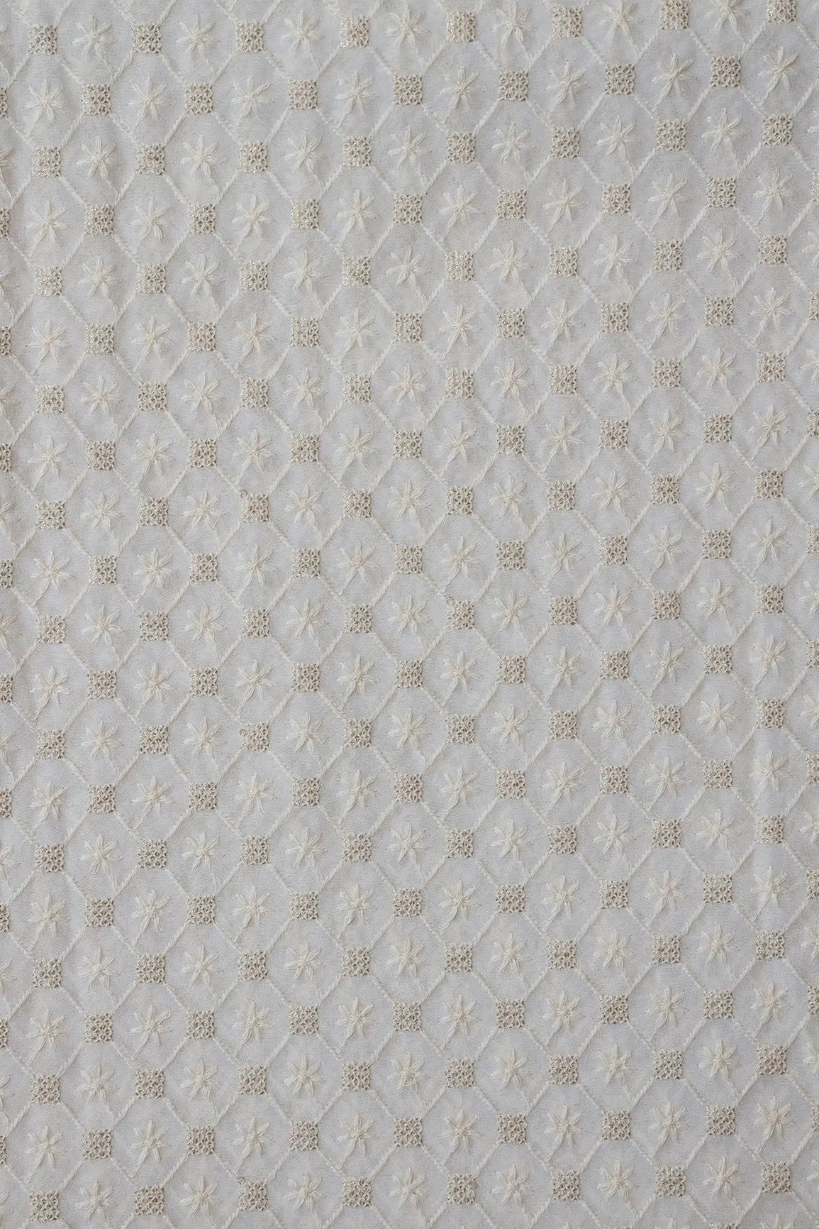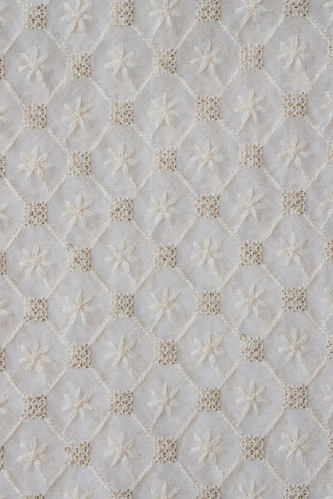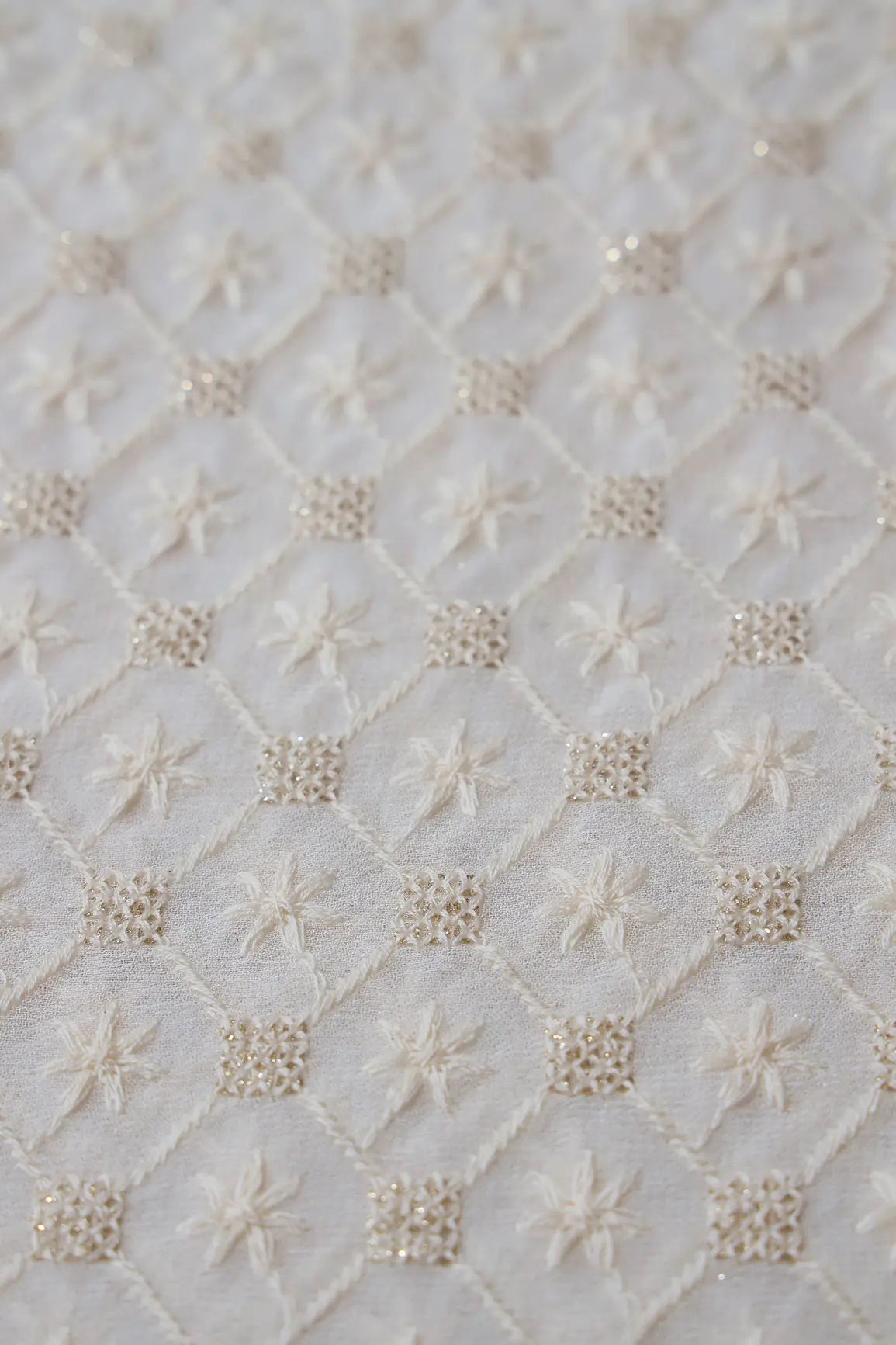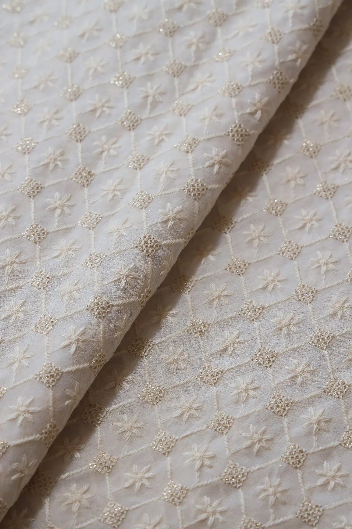 White Thread With Gold Glitter Sequins Checks Lucknowi Embroidery On Dyeable Viscose Georgette Fabric
