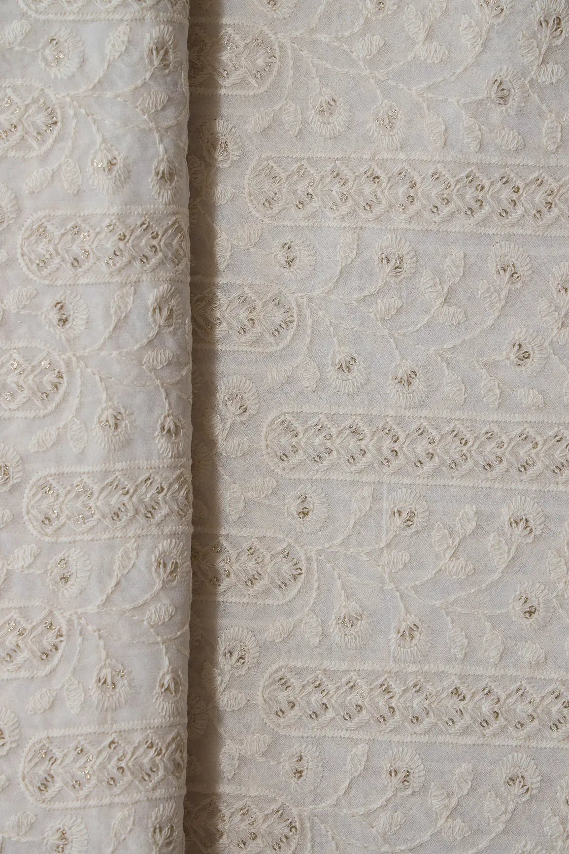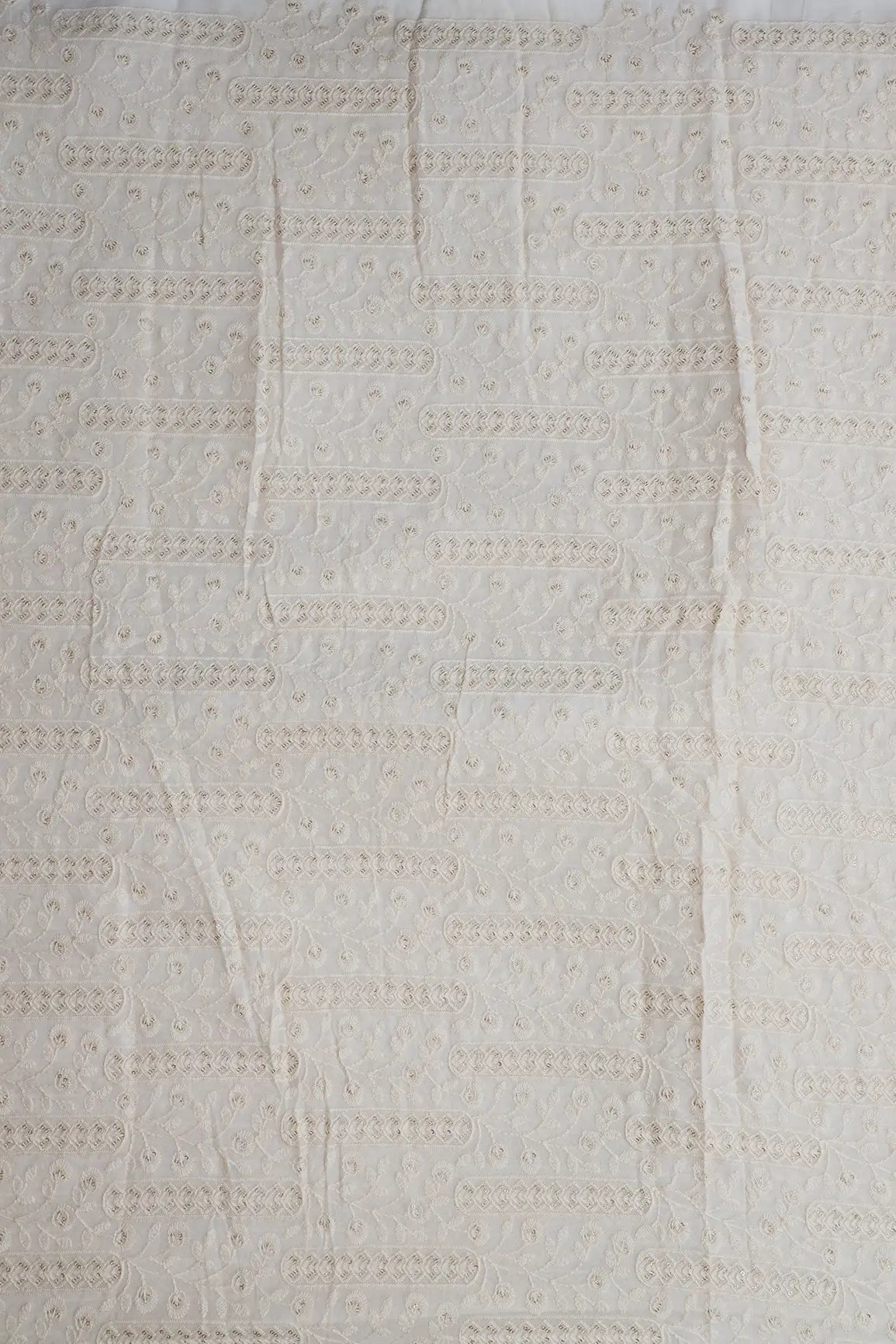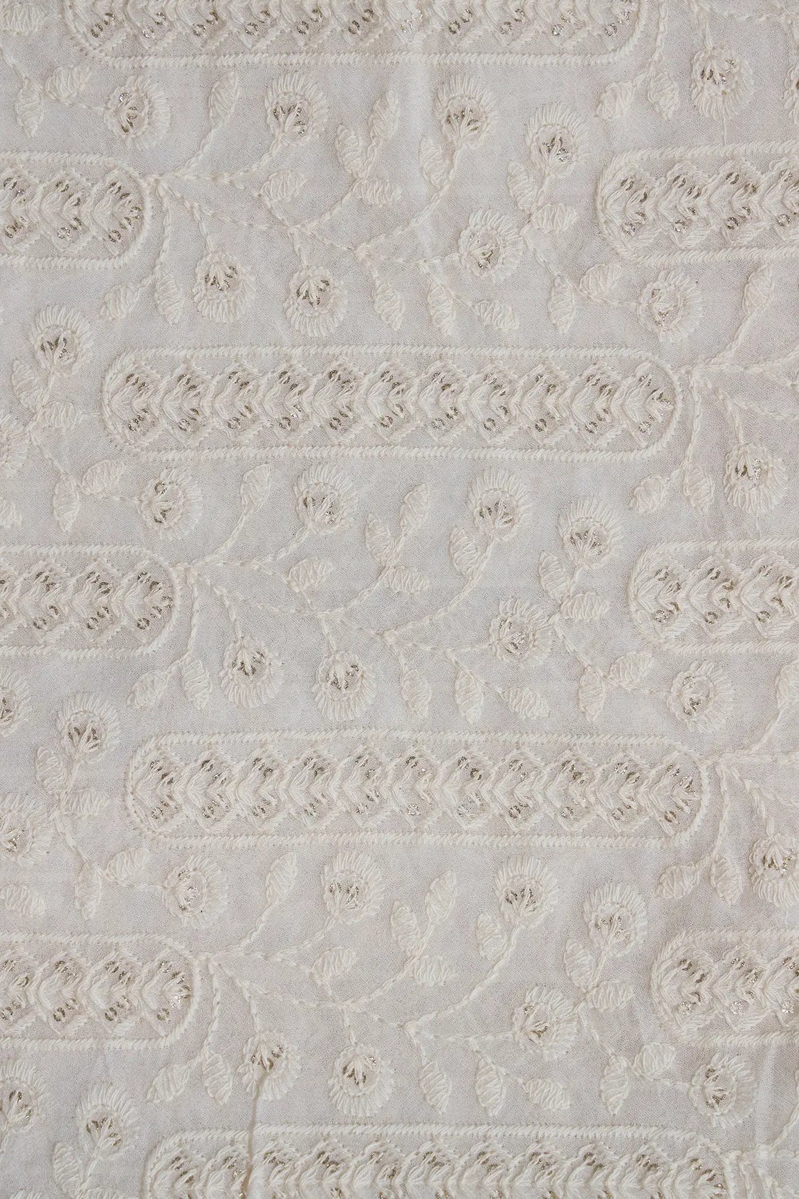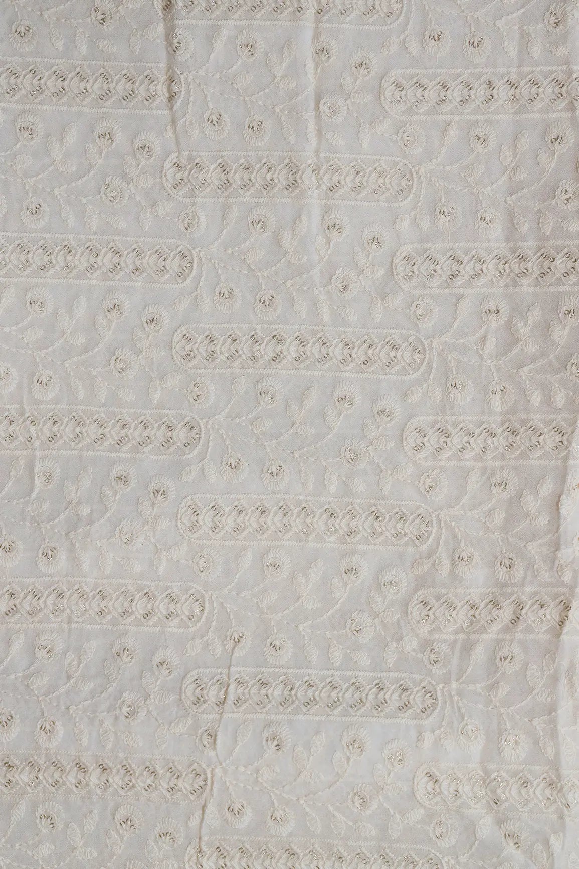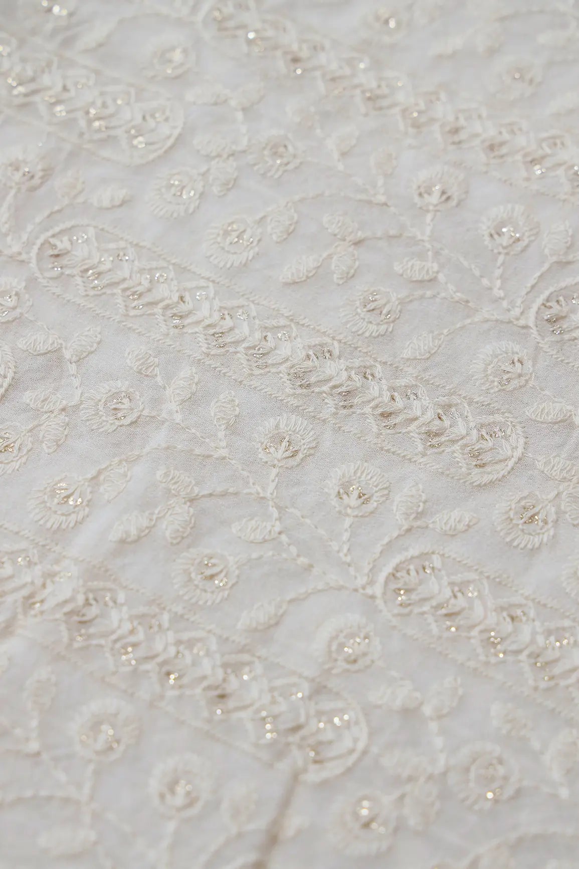 White Thread With Gold Glitter Sequins Floral Lucknowi Embroidery On Dyeable Viscose Georgette Fabric