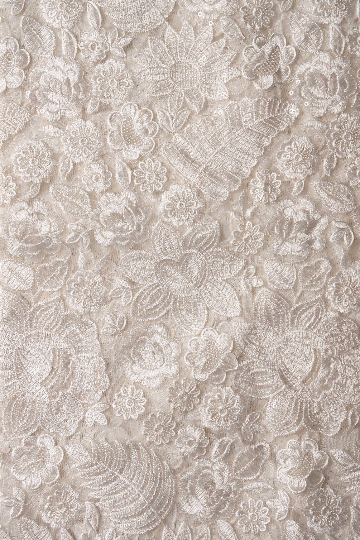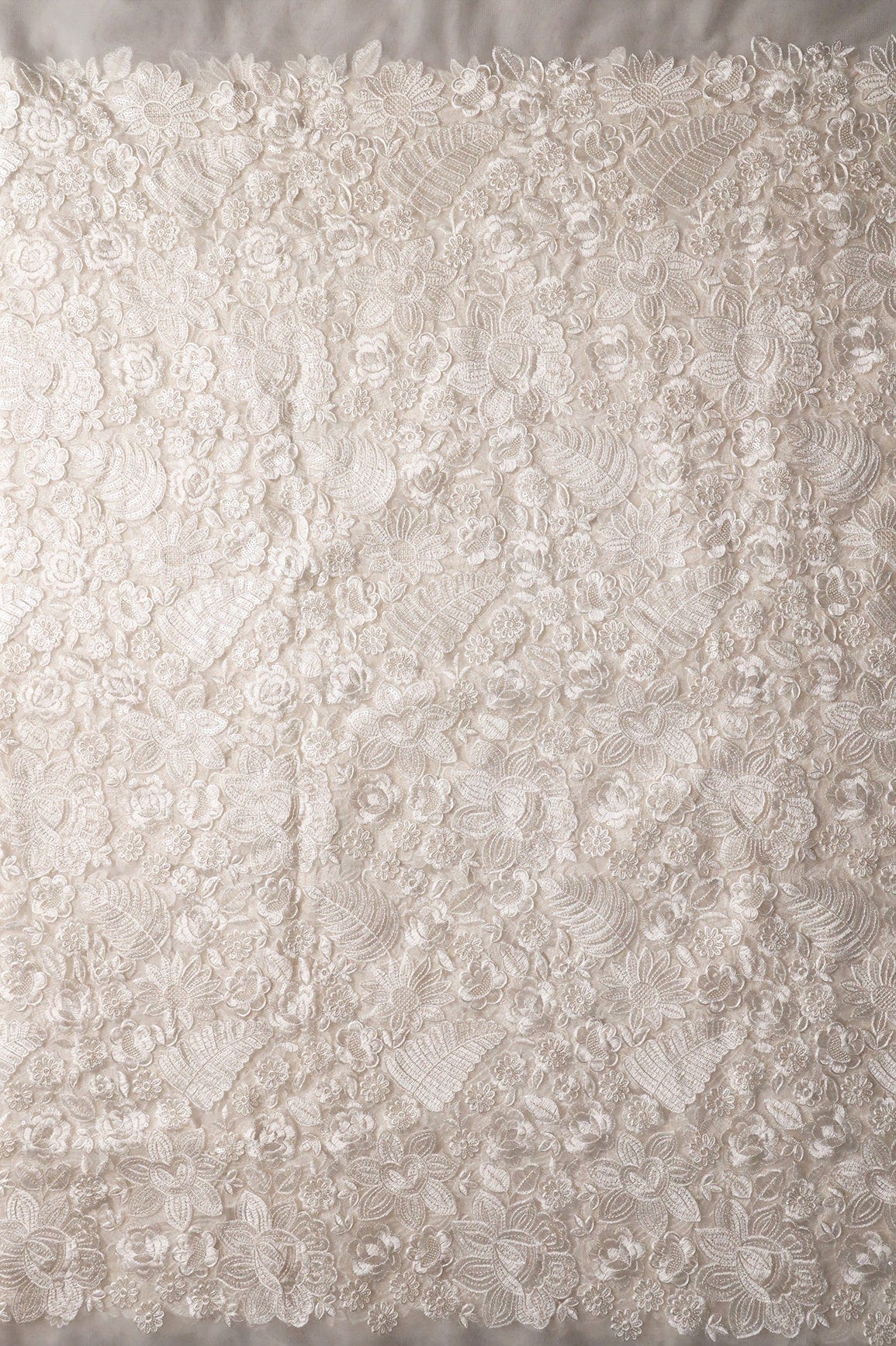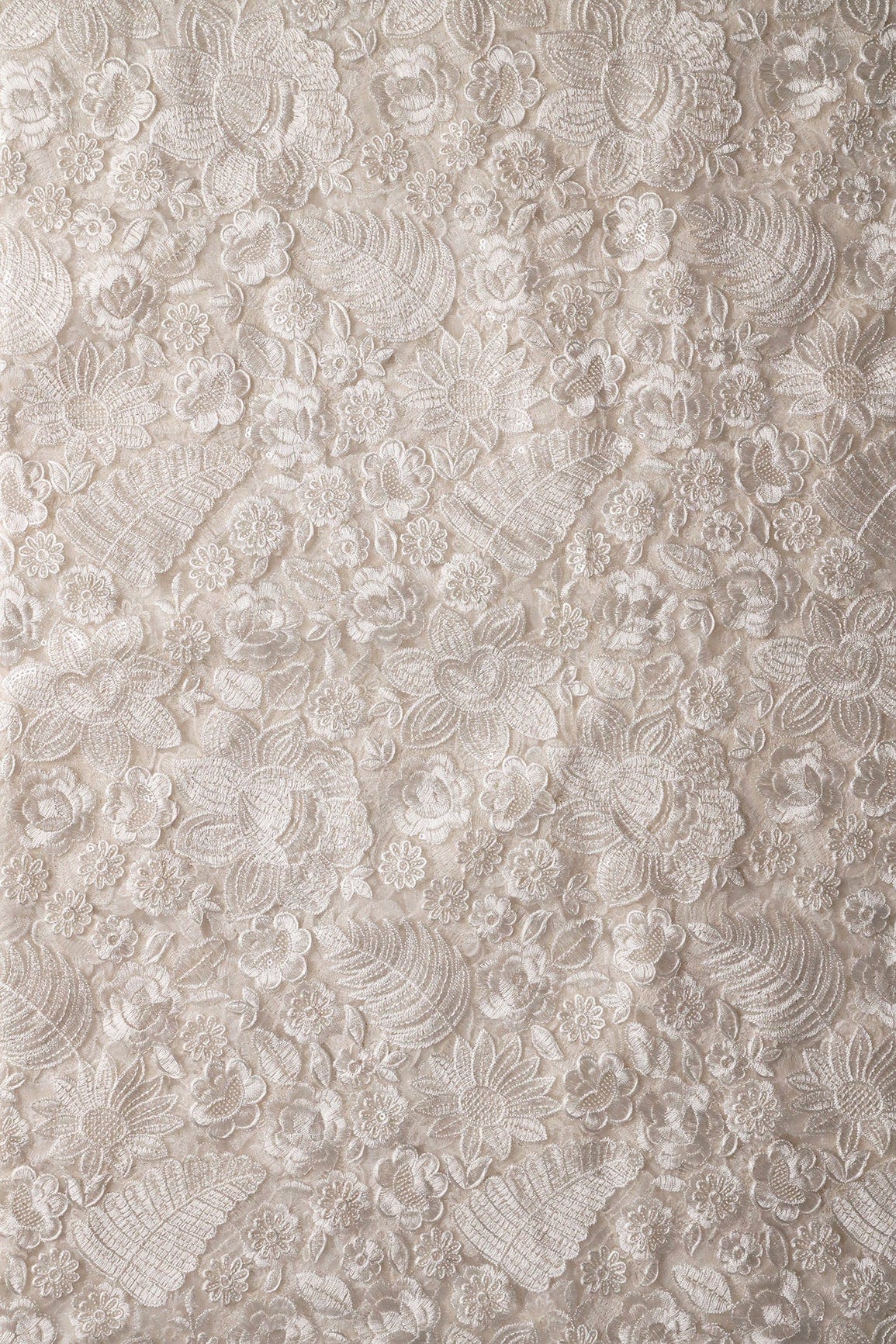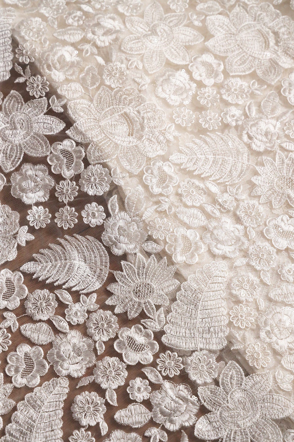 White Thread With Sequins Heavy Floral Embroidery On White Dyeable Soft Net Fabric