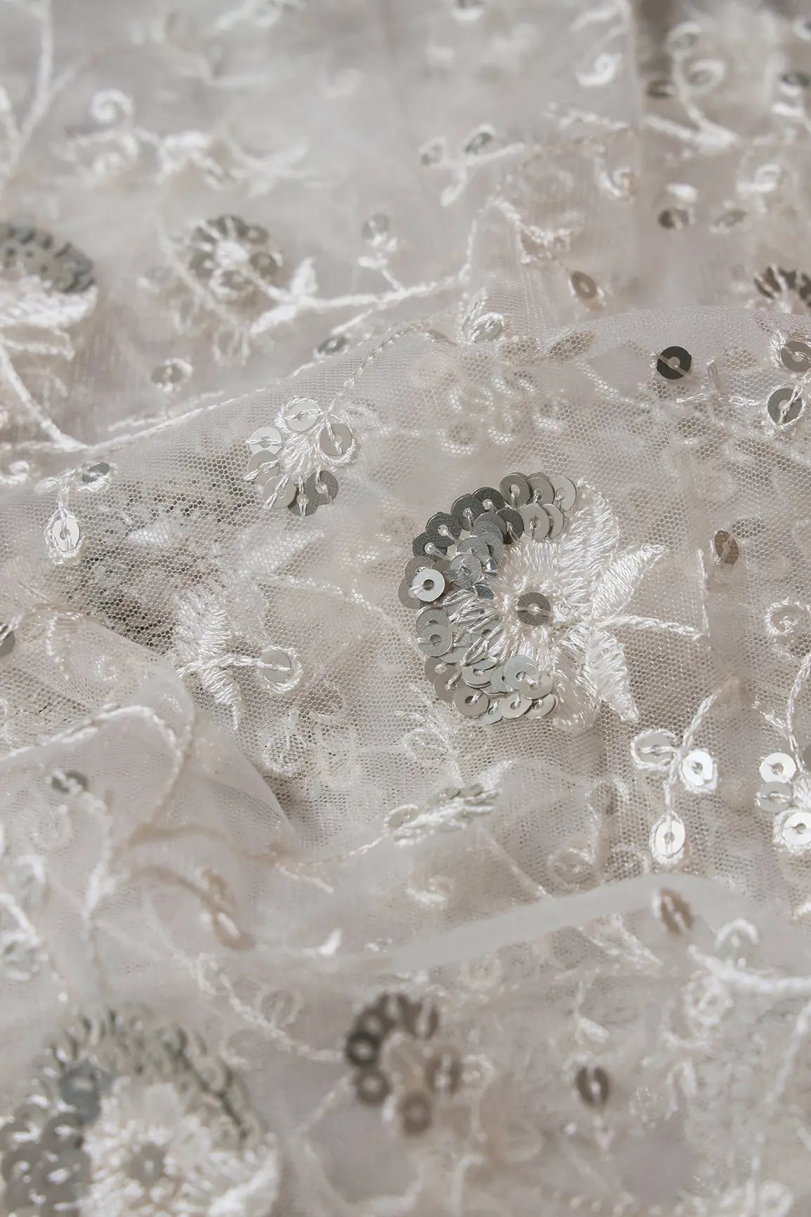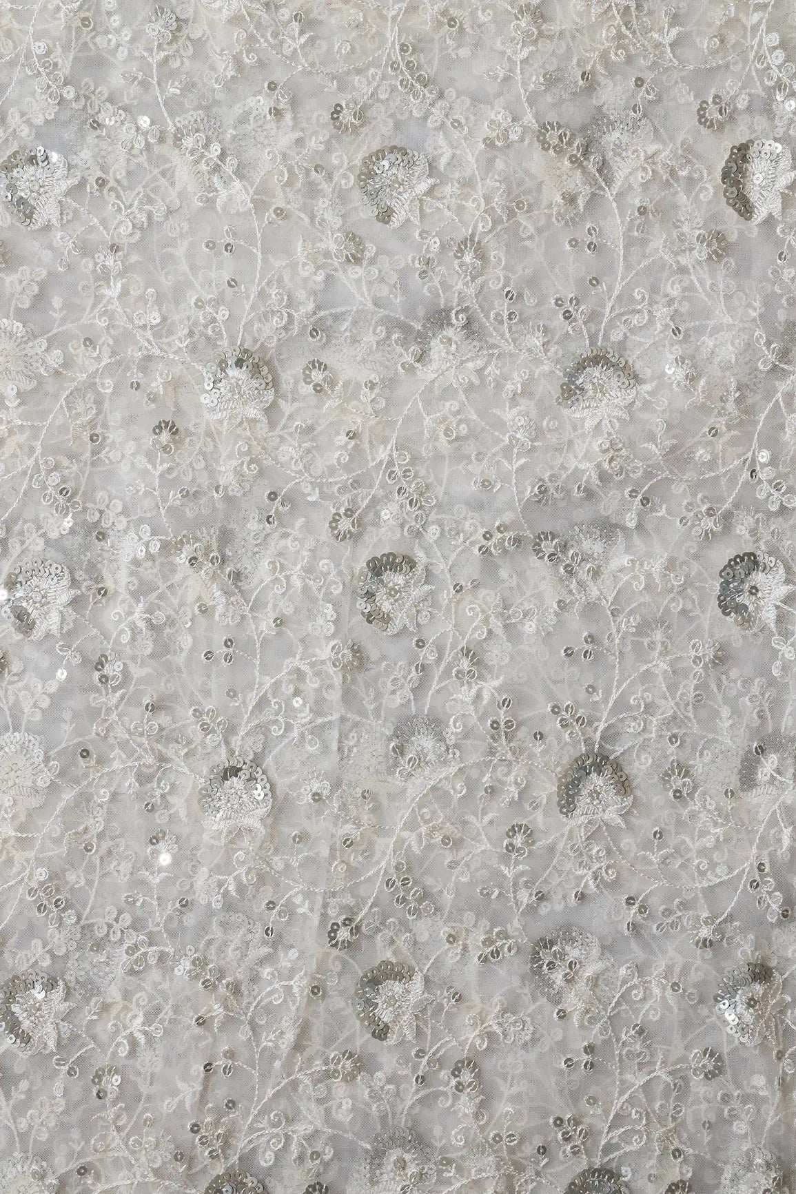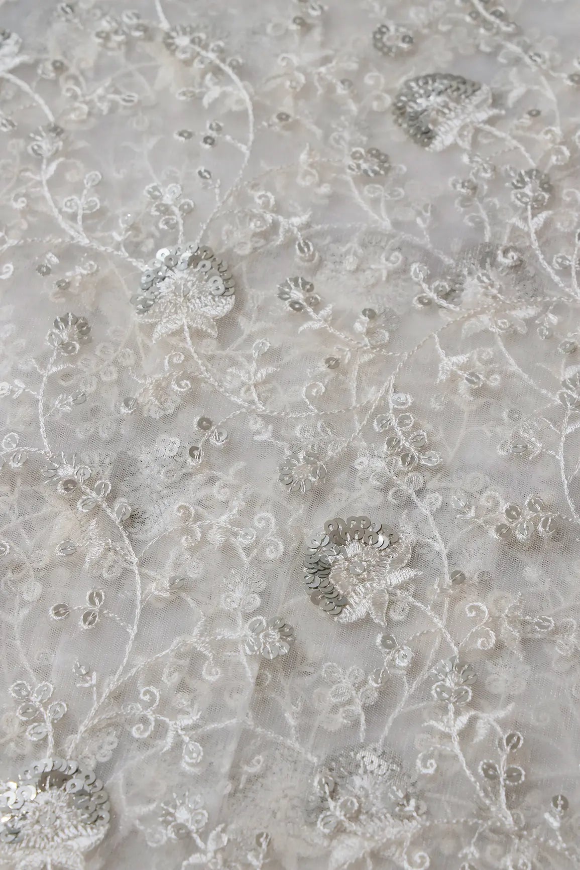 White Thread With Silver Sequins Floral Embroidery On White Dyeable Soft Net Fabric