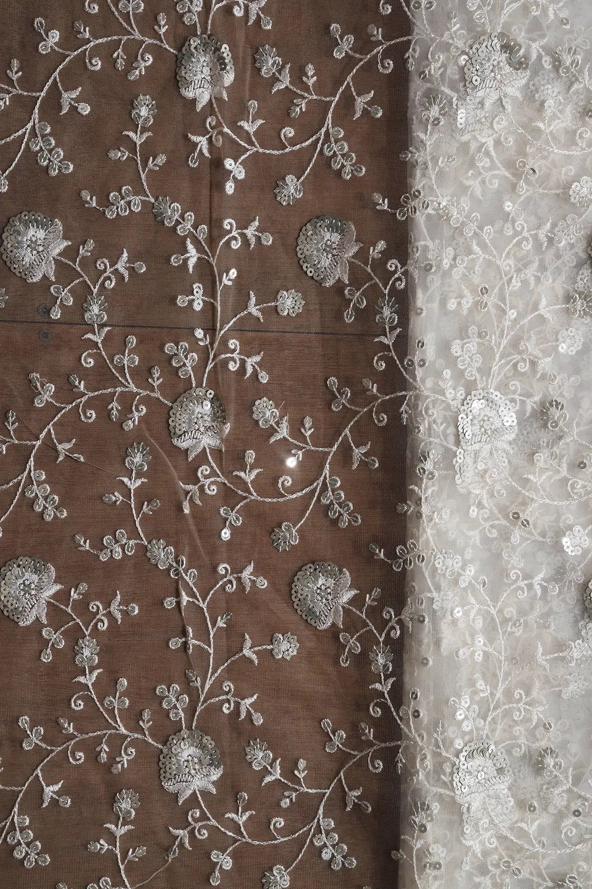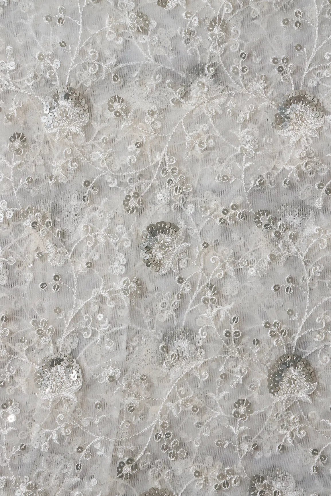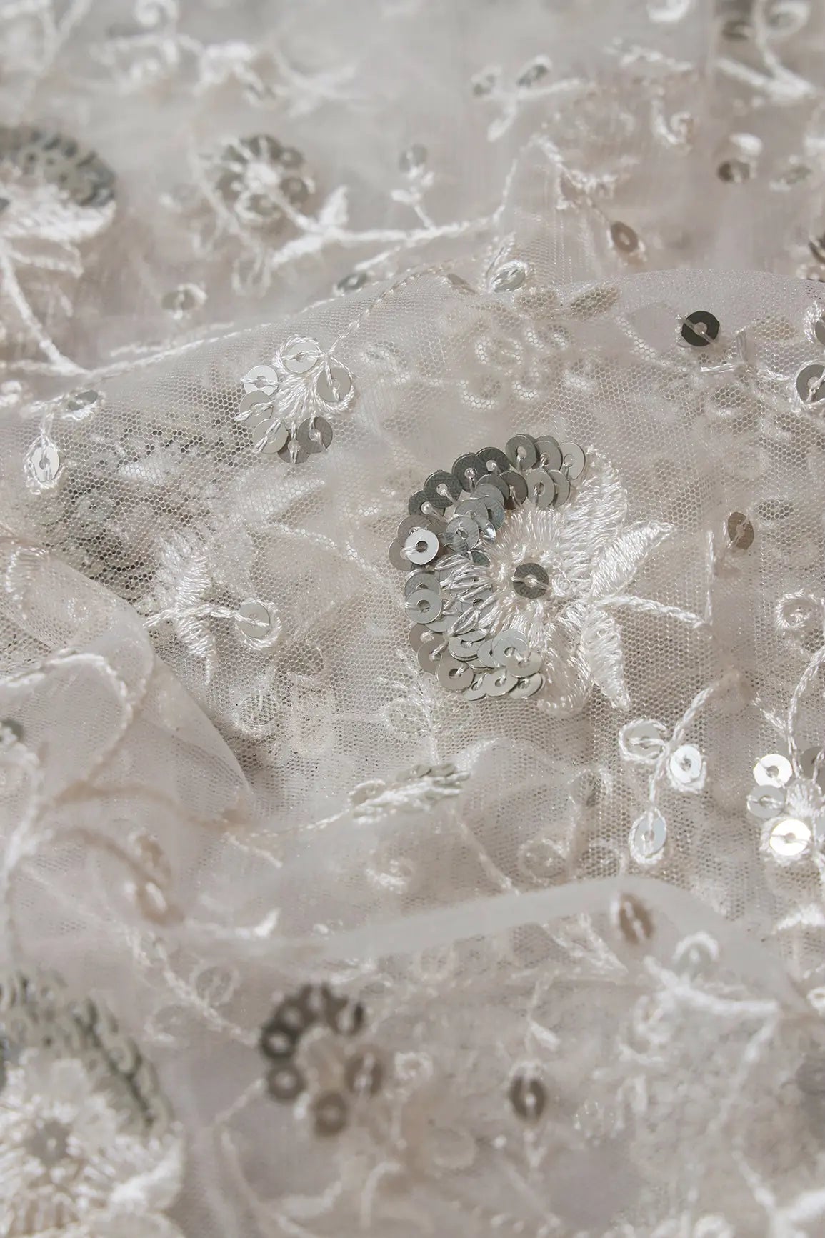 White Thread With Silver Sequins Floral Embroidery On White Dyeable Soft Net Fabric