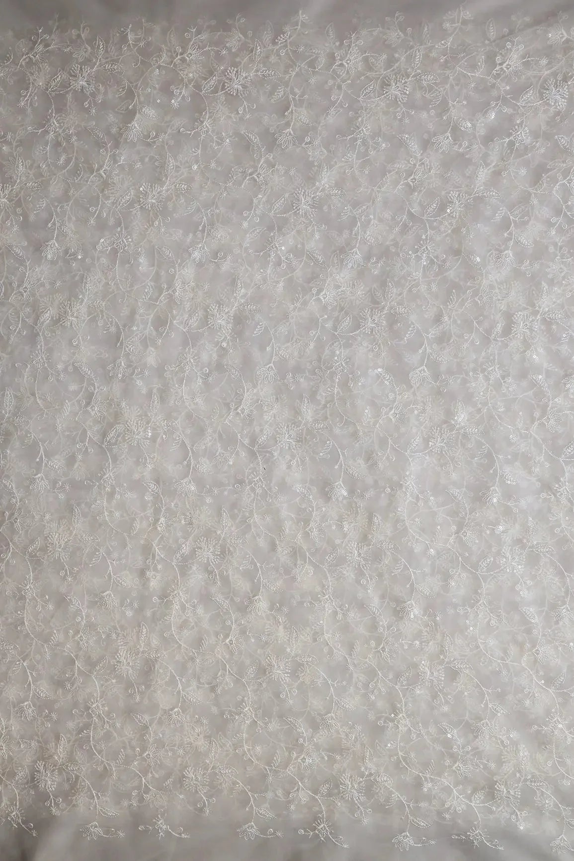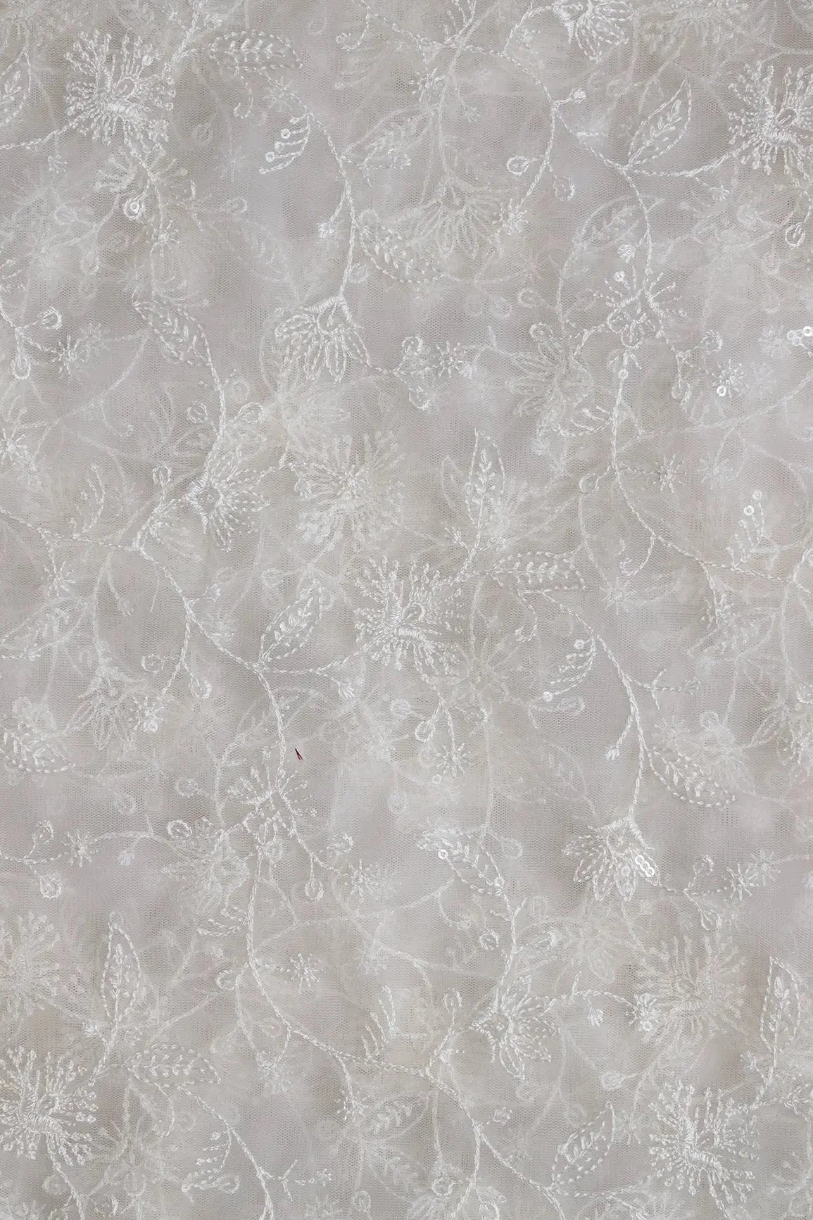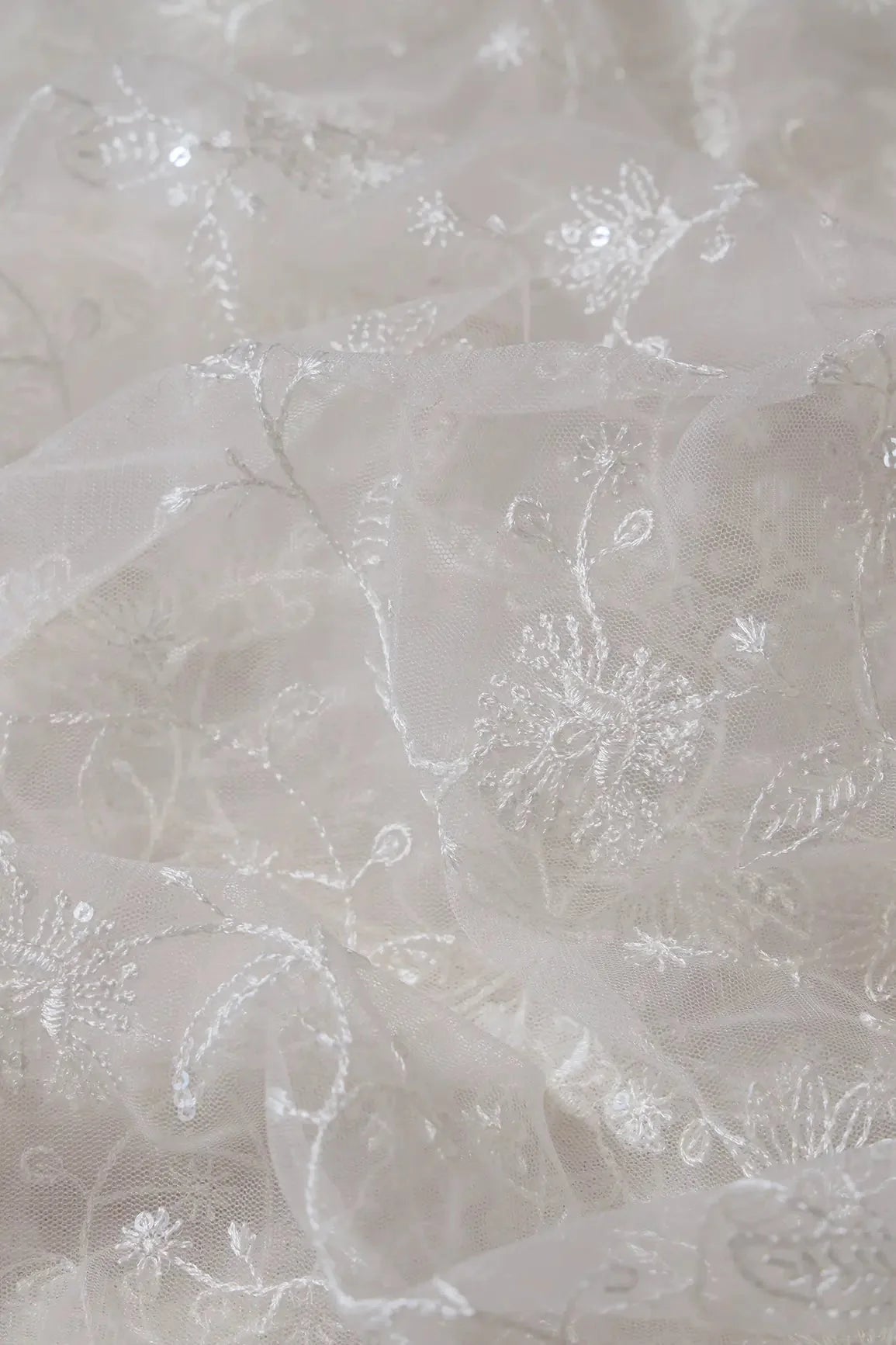 White Thread With Water Sequins Floral Embroidery On Dyeable White Soft Net Fabric