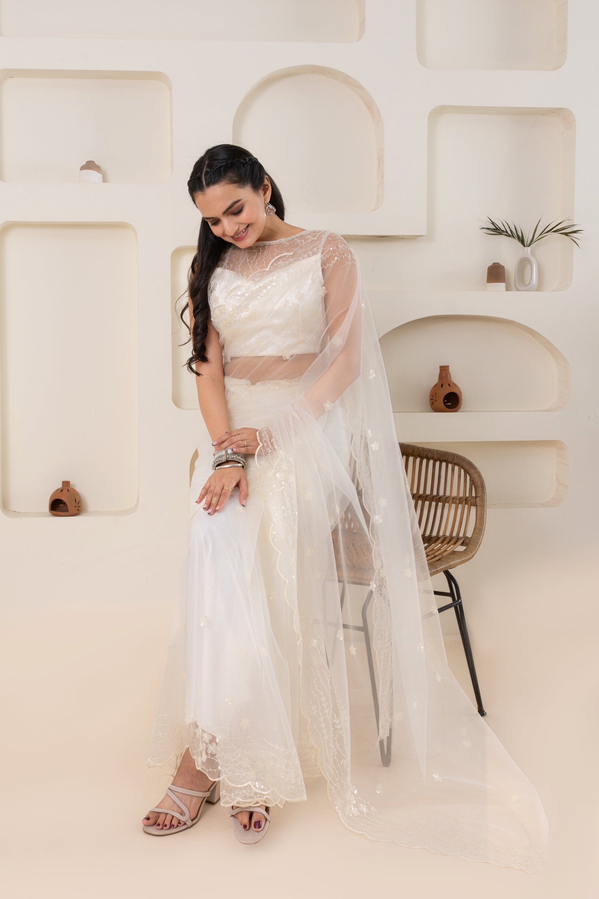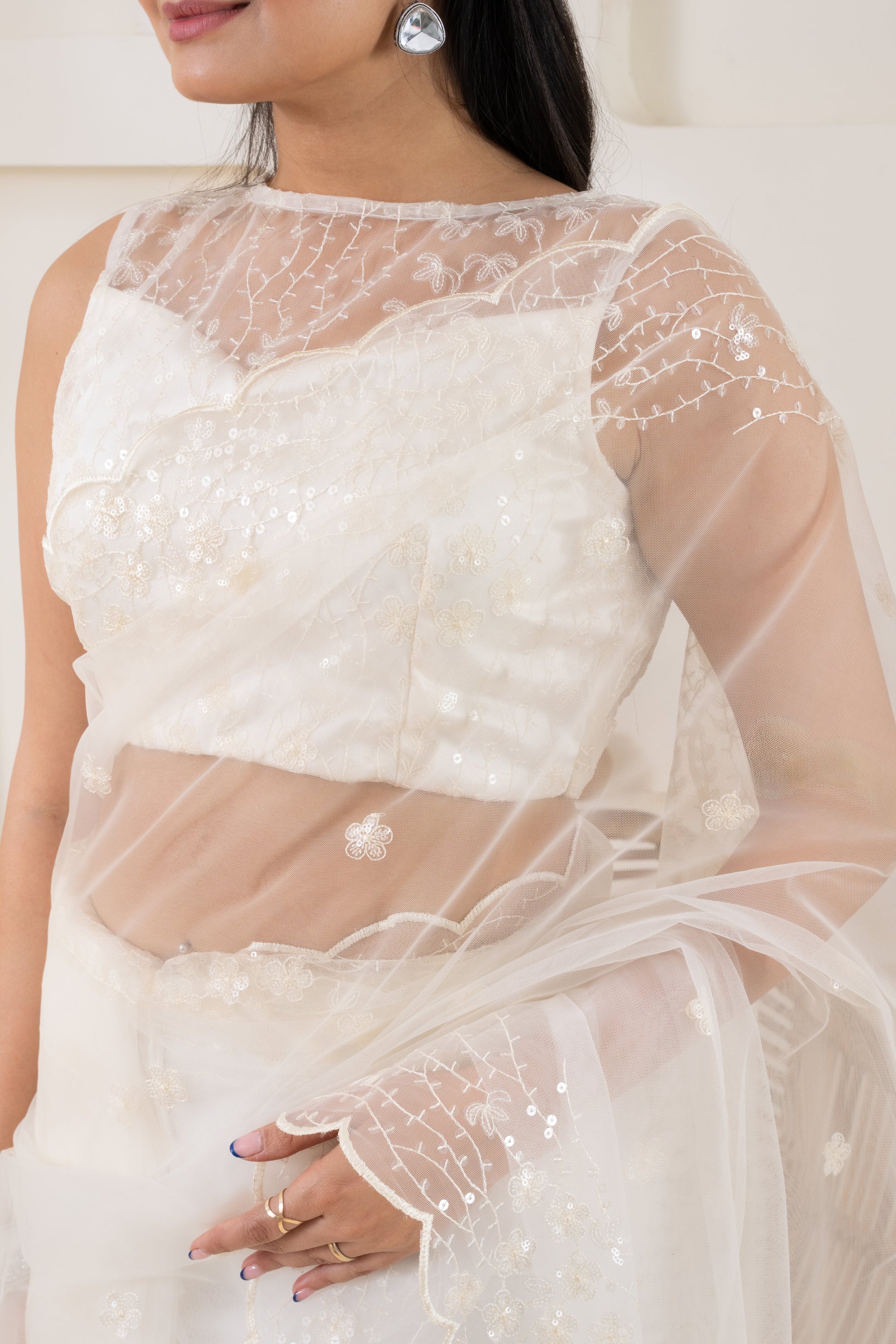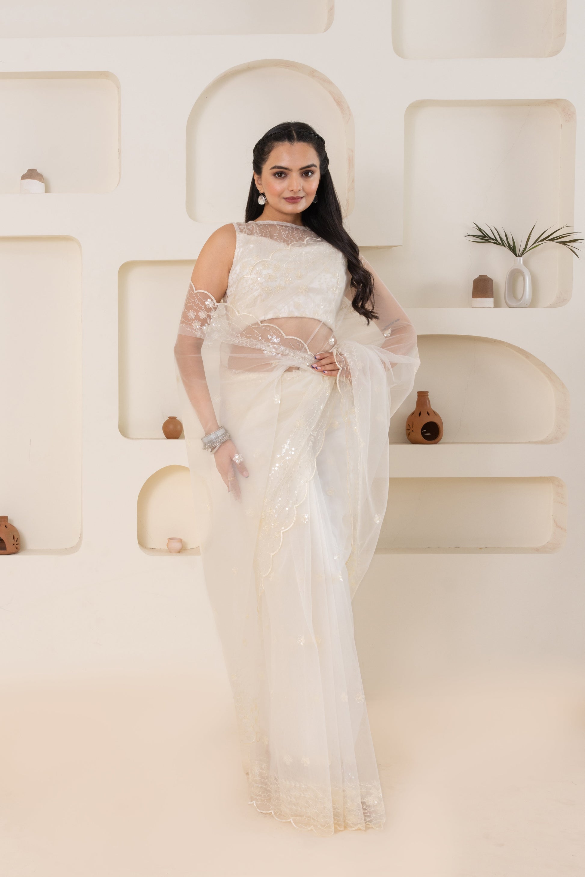 Dyed Fabric 1/ Saree : Sequins With Thread Work Floral Embroidery On Off White Soft Net Fabric