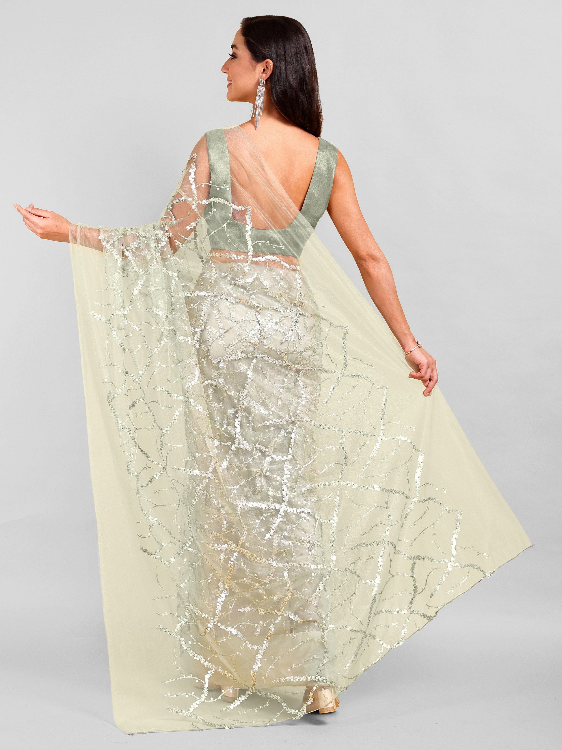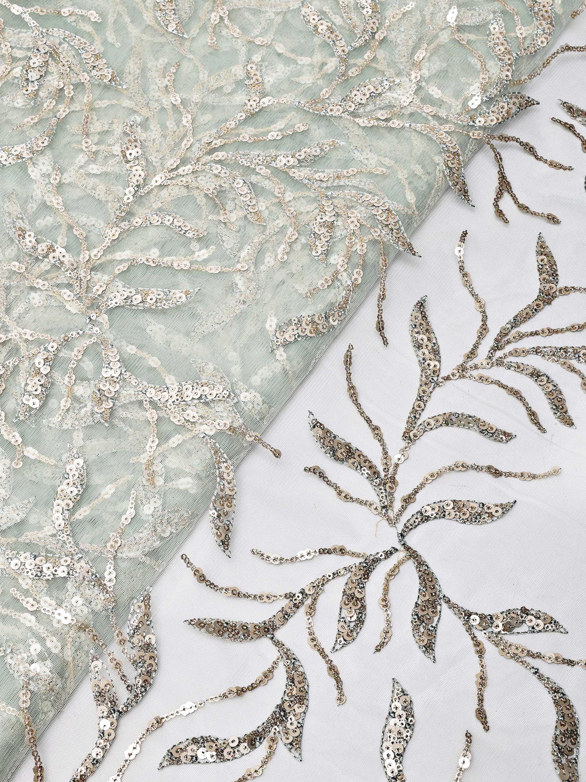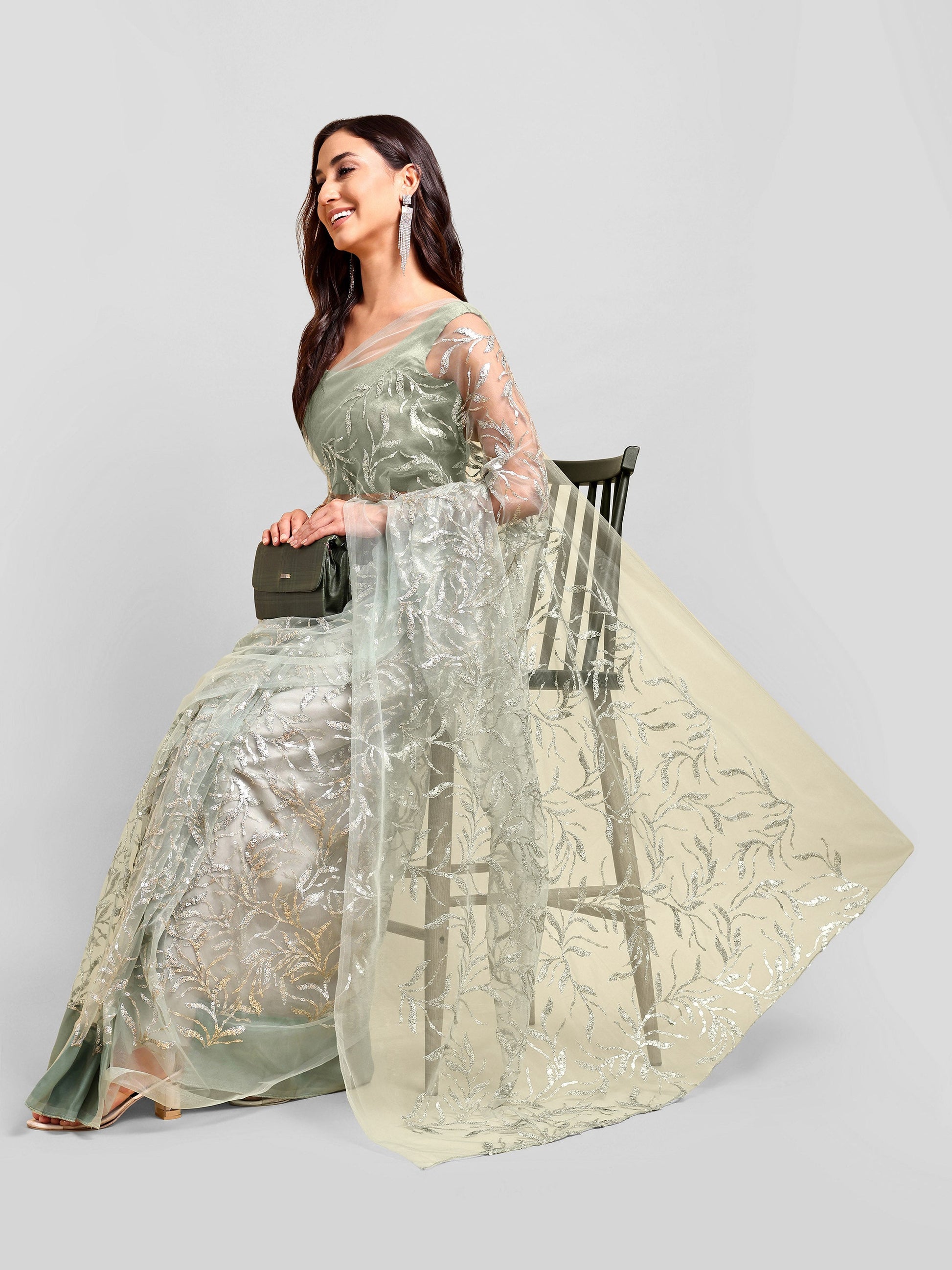 Fabric 1/ Saree : Gold And Silver Sequins Leafy Embroidery Work On Olive Soft Net Fabric
