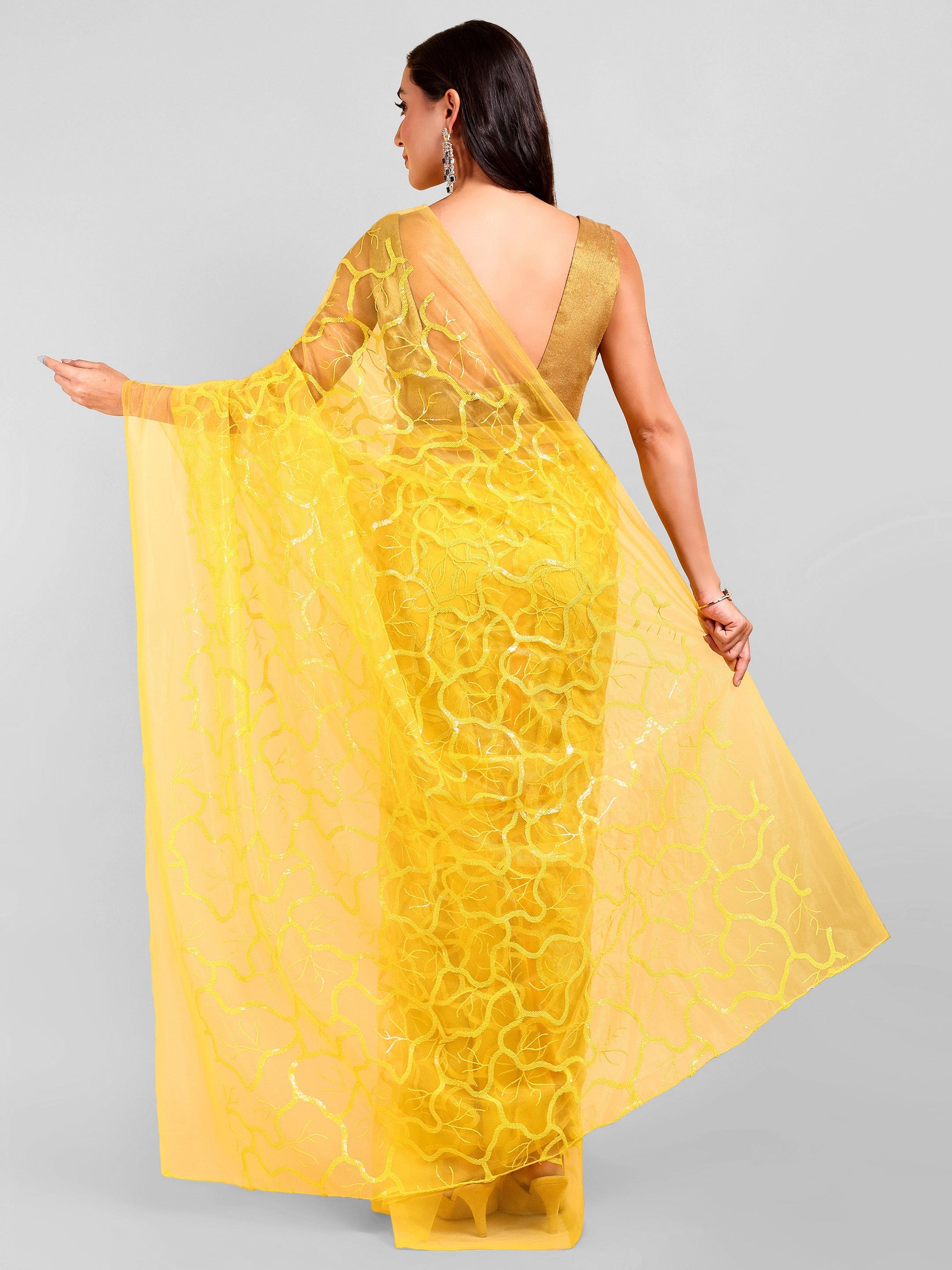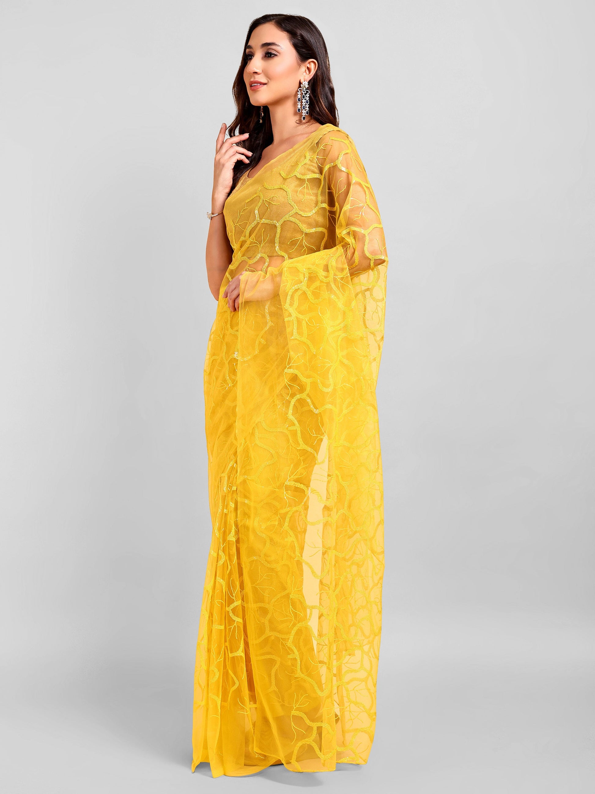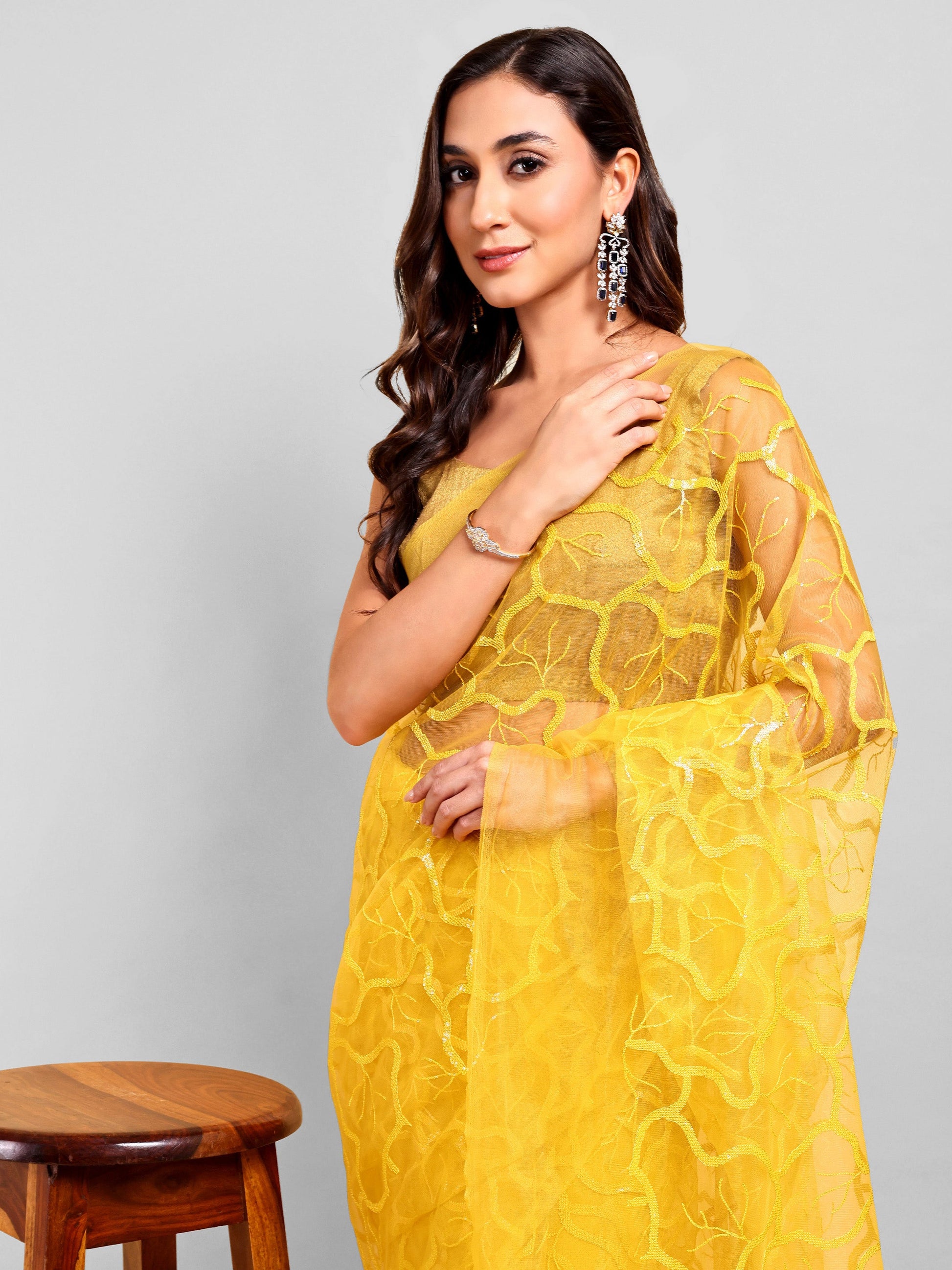 Fabric 1/ Saree : Yellow Thread With Sequins Abstract Embroidery Work On Yellow Soft Net Fabric