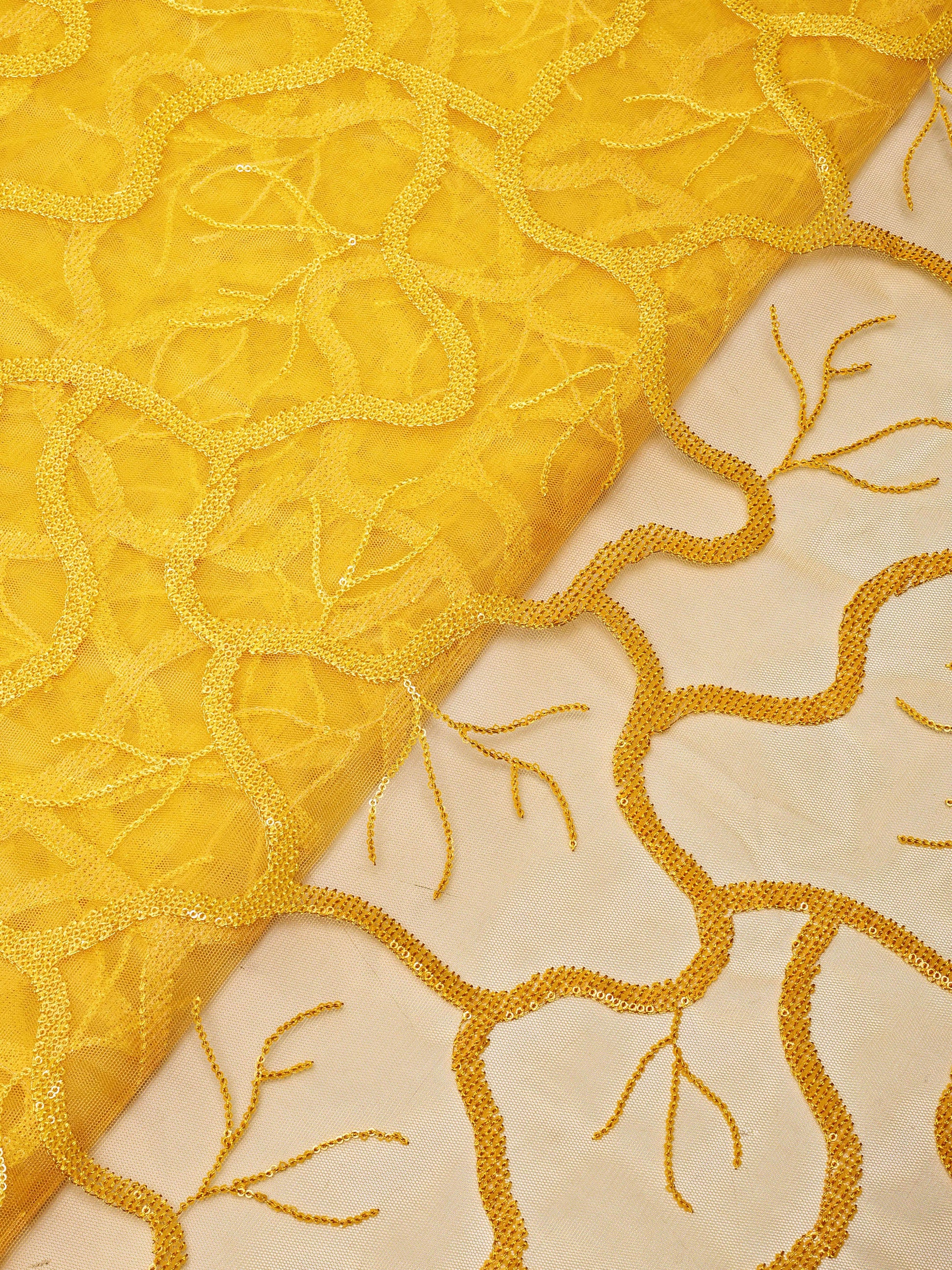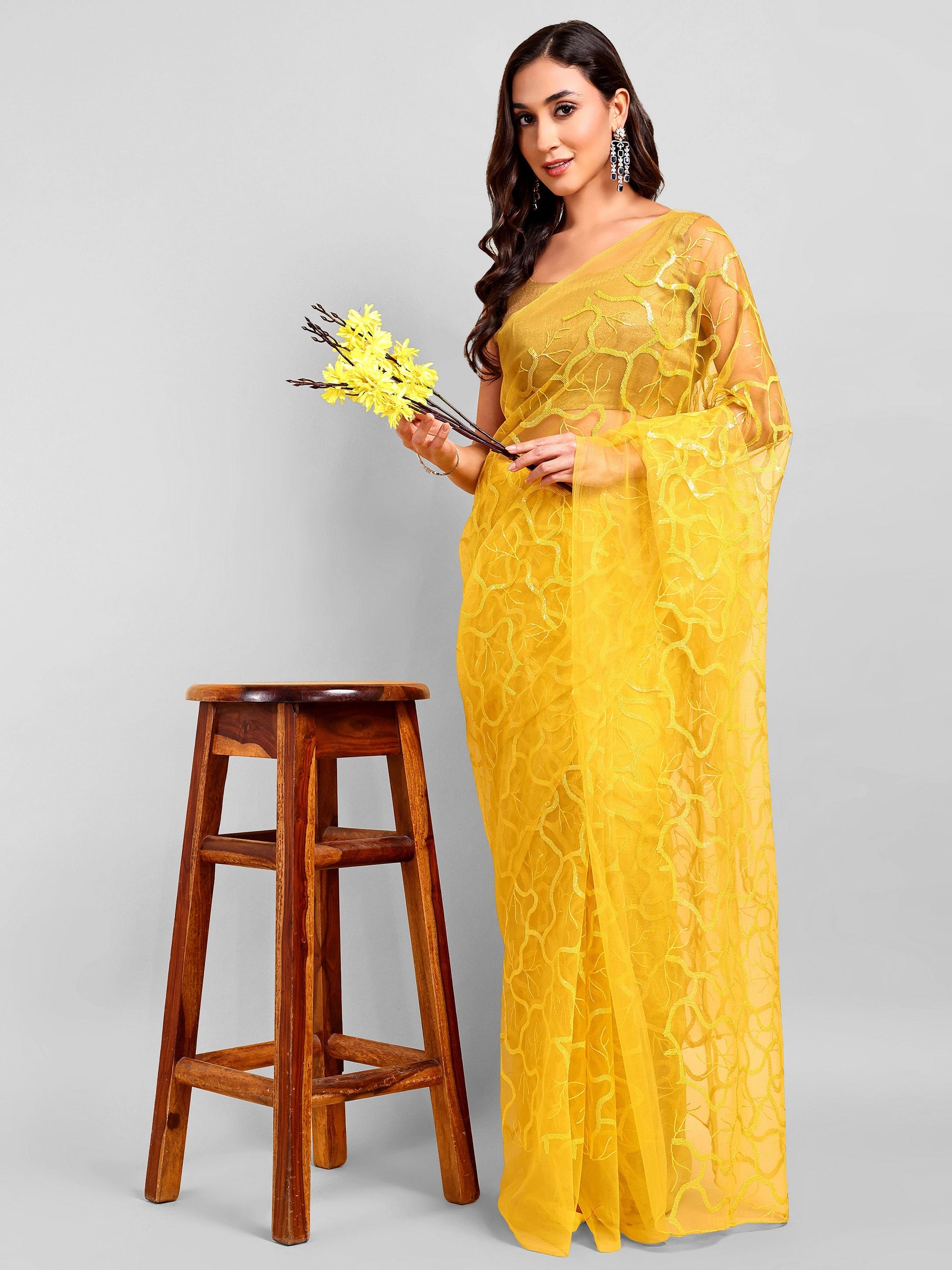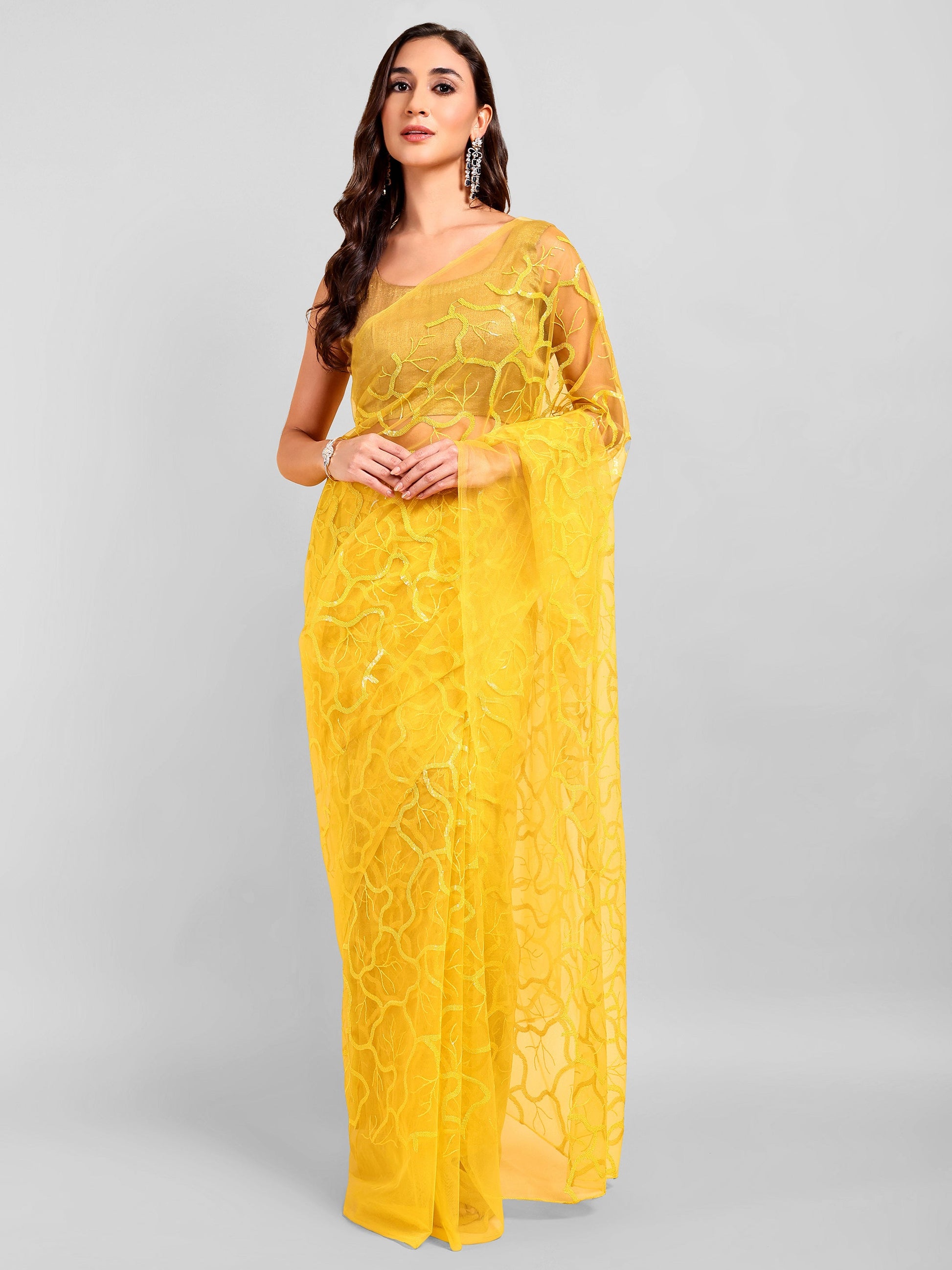 Fabric 1/ Saree : Yellow Thread With Sequins Abstract Embroidery Work On Yellow Soft Net Fabric