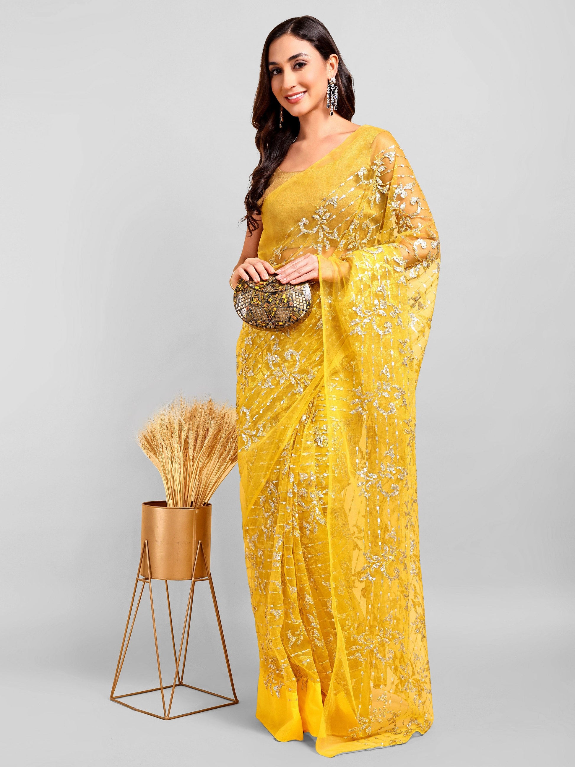 Fabric 1/ Saree : Gold And Silver Sequins With Yellow Thread Abstract Embroidery Work On Yellow Soft Net Fabric