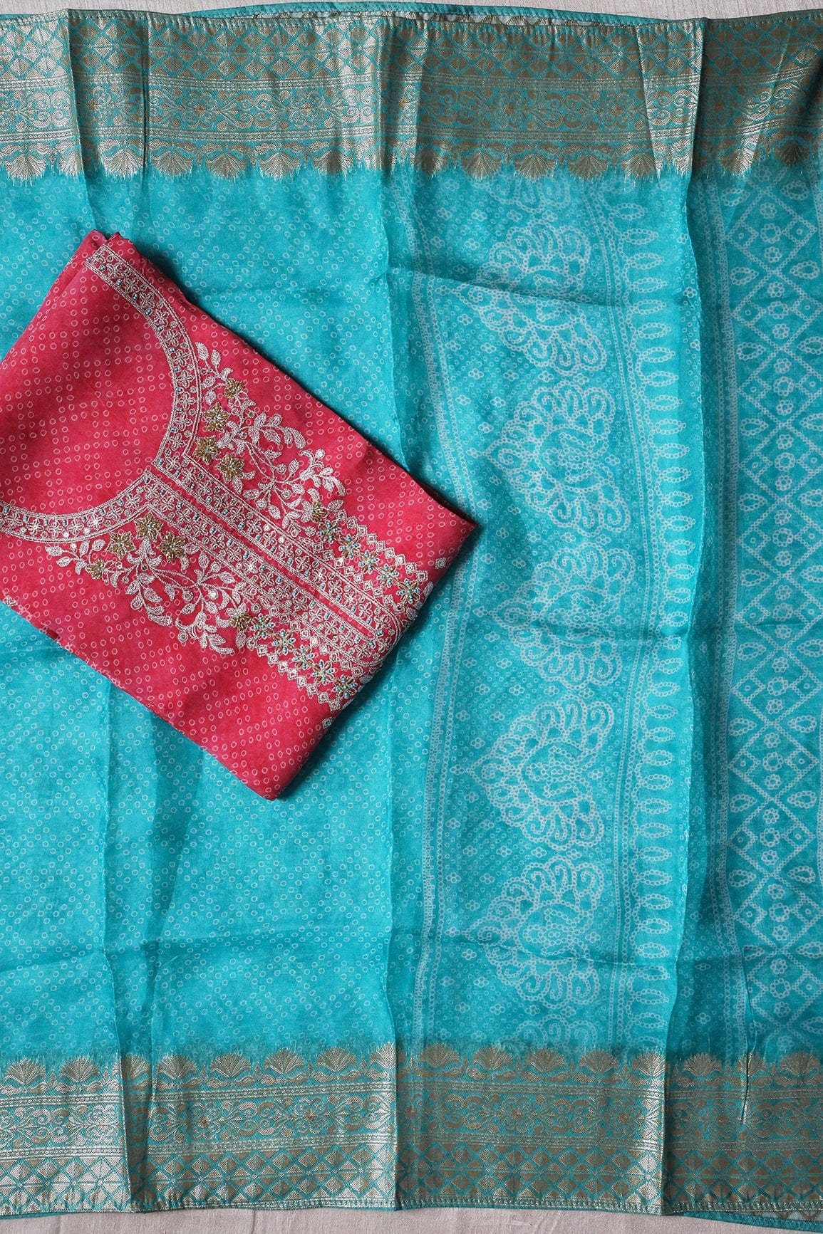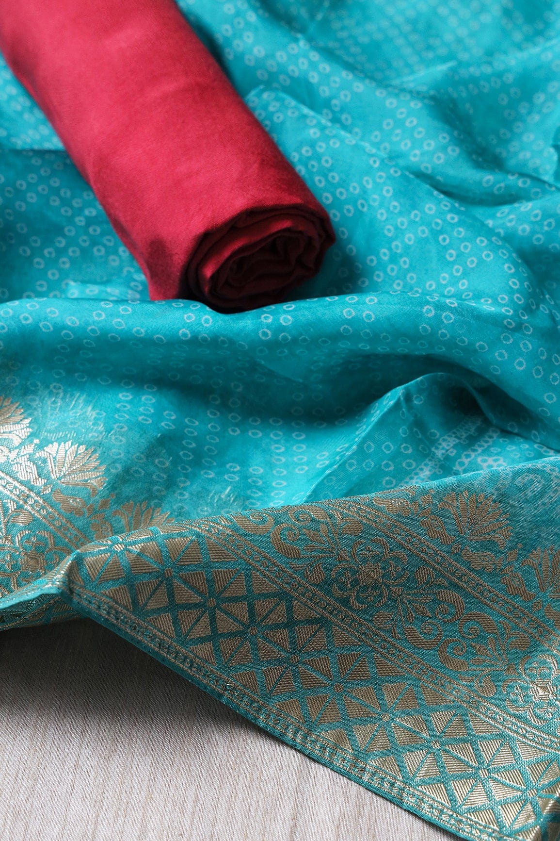 Fabric 3/ Dupatta : Turquoise Blue Printed Zari Jacquard On Pure Organza Dupatta With Border