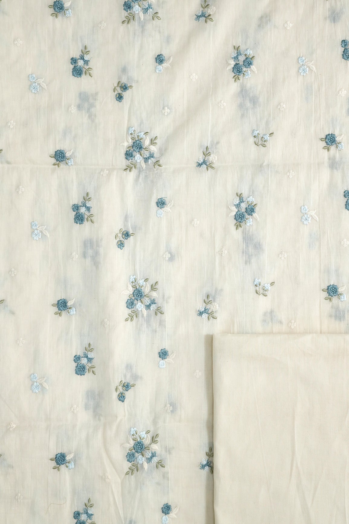Fabric 1/ Top : Sky Blue And Olive Thread Beautiful Floral Embroidery On Off White Organic Cotton Fabric