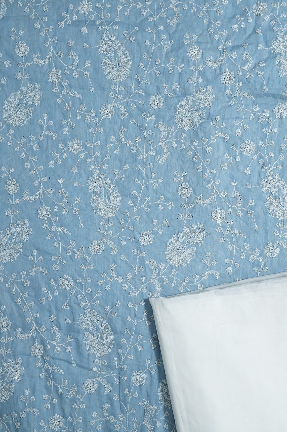 Fabric 1/ Top : Beautiful White Thread Floral Paisley Embroidery On Blue Pure Mul Cotton Fabric