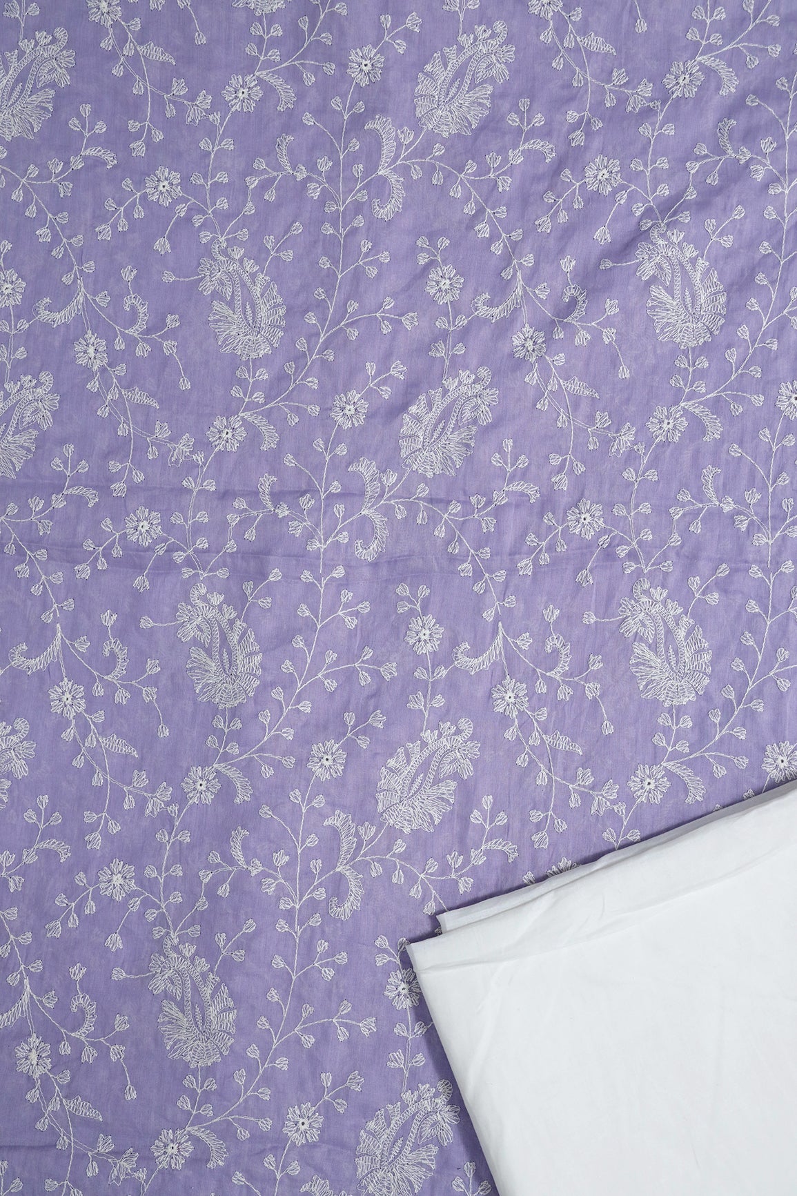 Fabric 1/ Top : Beautiful White Thread Floral Paisley Embroidery On Lavender Pure Mul Cotton Fabric