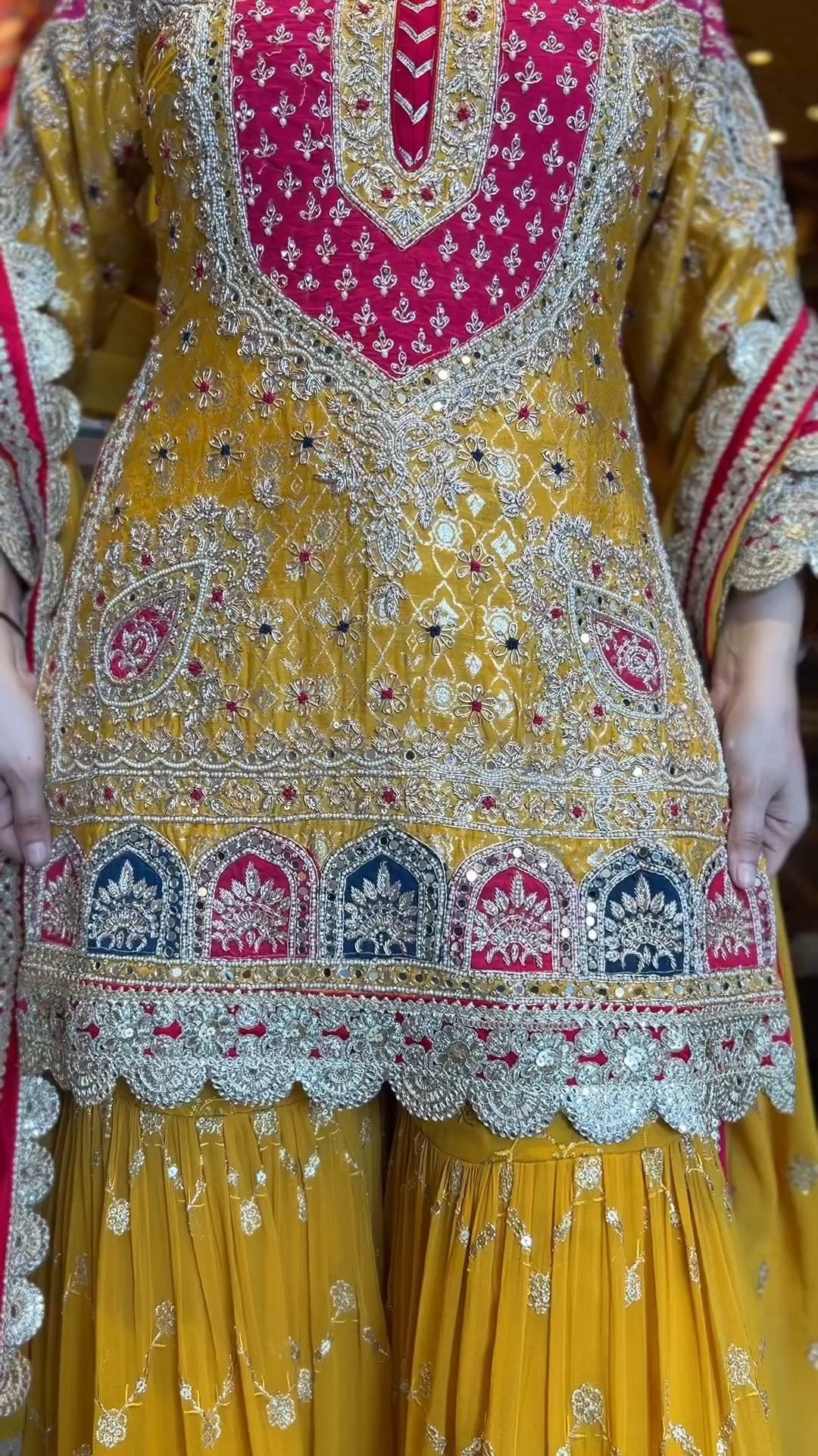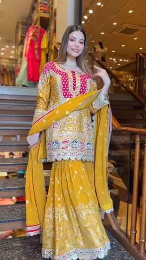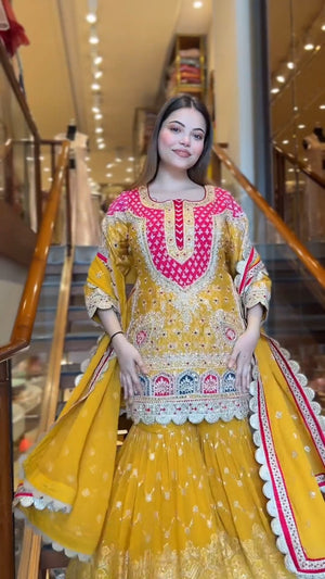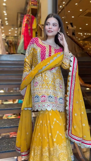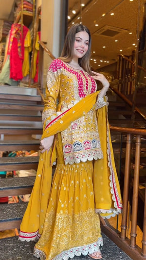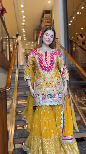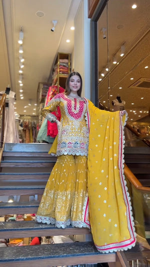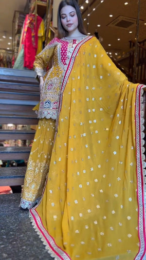 Presenting a premium designer top and sharara set crafted in heavy faux georgette, featuring elegant 5mm embroidery sequence work. This fully stitched, ready-to-wear ensemble is designed to offer graceful movement, festive charm, and all-day comfort—perfect for weddings, parties, and special occasions.