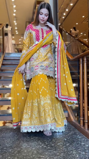 Designer Faux Georgette Embroidered Top Sharara Set with Dupatta