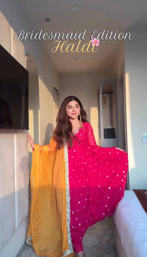 Presenting the new designer collection in faux georgette with embroidery work. Gown and dupatta set, fully stitched and ready to wear.