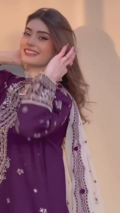 Celebrate the festive season with this elegant designer top, pant, and dupatta set, crafted in premium faux georgette fabric. Featuring refined sequence embroidery work and a graceful silhouette, this ready-to-wear ensemble offers the perfect blend of comfort and festive charm, making it ideal for Eid celebrations, parties, and special occasions.