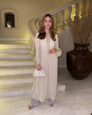 Adorned with over 1700+ original handmade moti work, this outfit radiates charm and sophistication. The soft faux georgette fabric, detailed embroidery, and delicate lace accents make it an ideal choice for weddings, parties, and festive occasions.