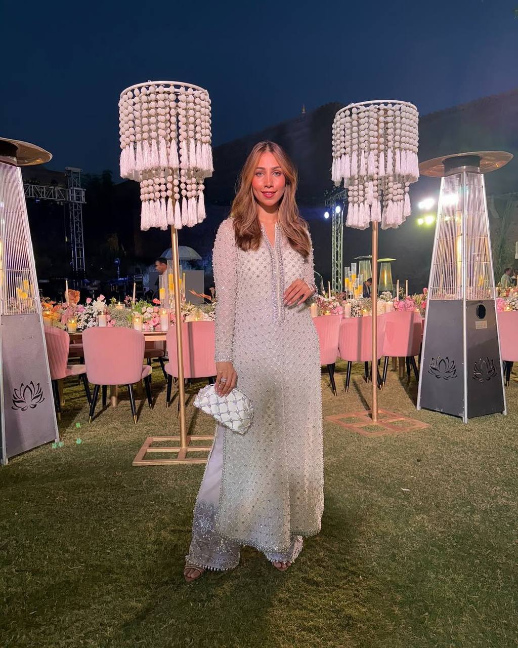 Crafted from premium faux georgette with rich sequin & moti embroidery.