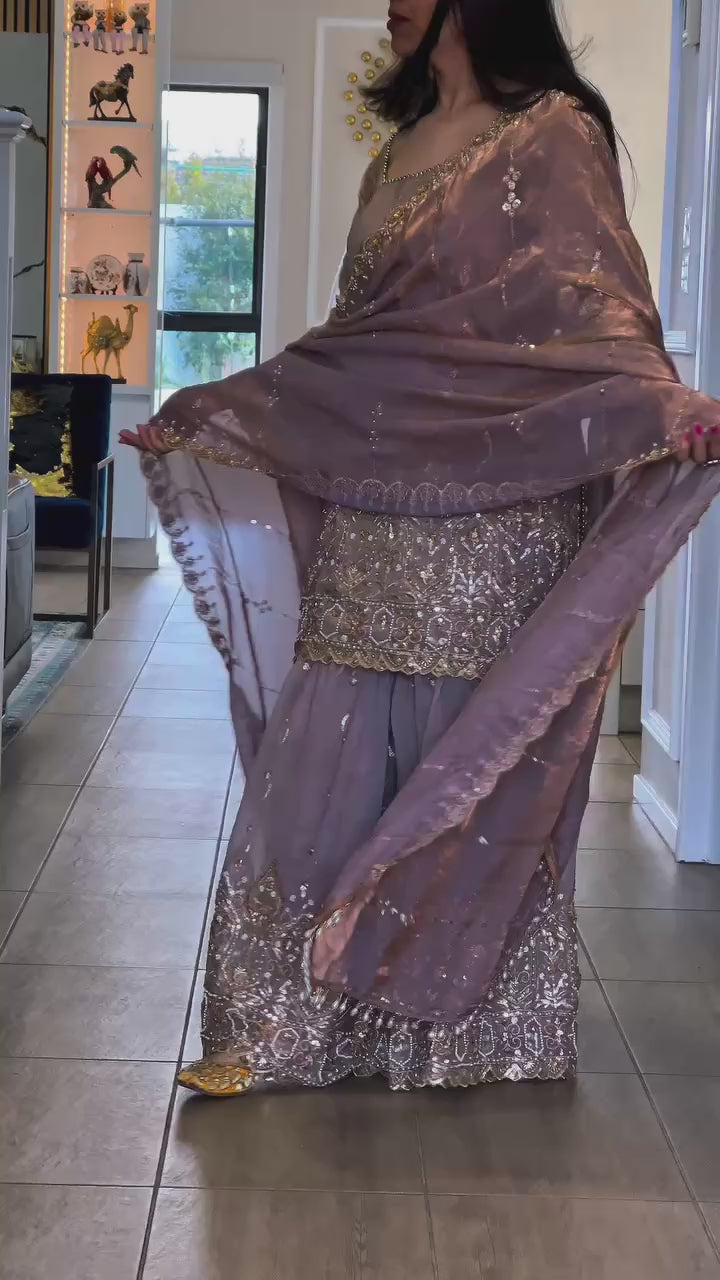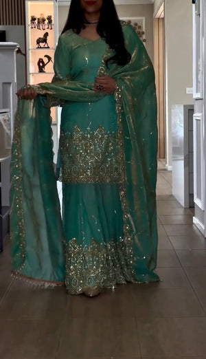 Designer Heavy NC Satin Embroidered Top Sharara Set with Dupatta