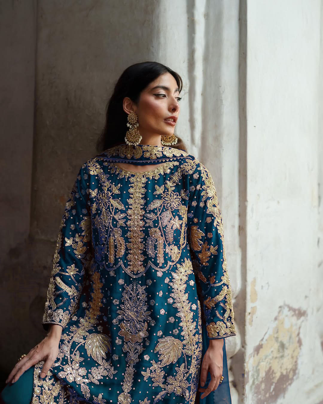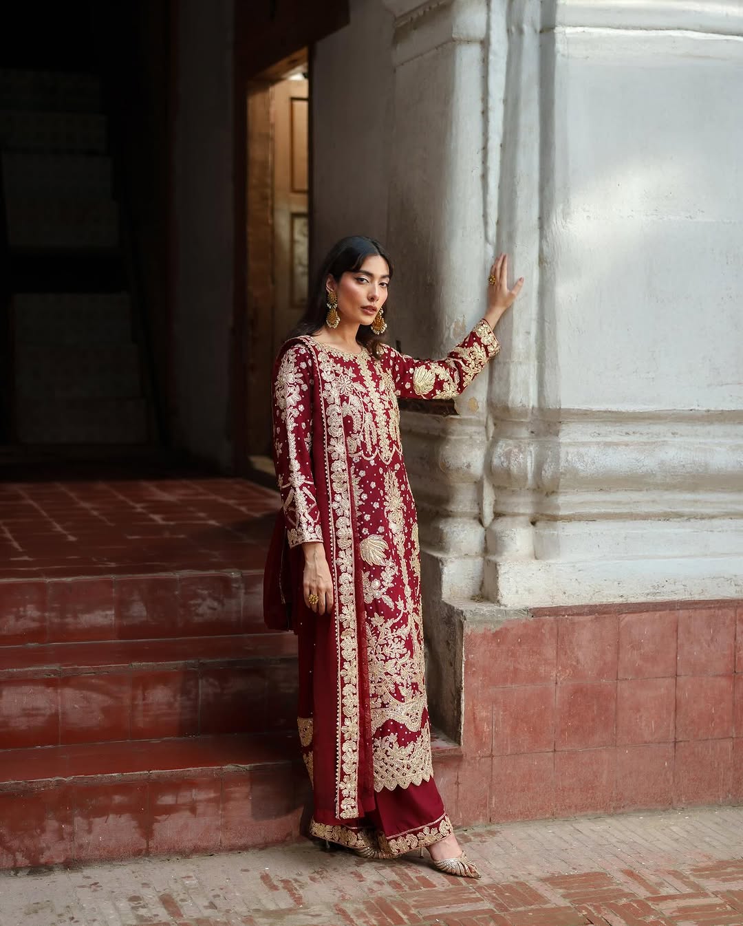 New colour added in this elegant embroidered designer suit set. A premium three-piece outfit featuring intricate chain sequin and moti work, fully stitched and ready to wear.
