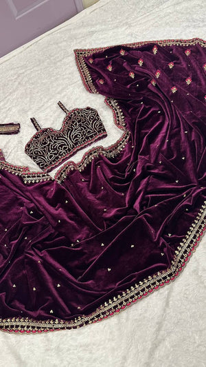 • Look: Premium heavy-work velvet saree with a rich fall and elegant shine