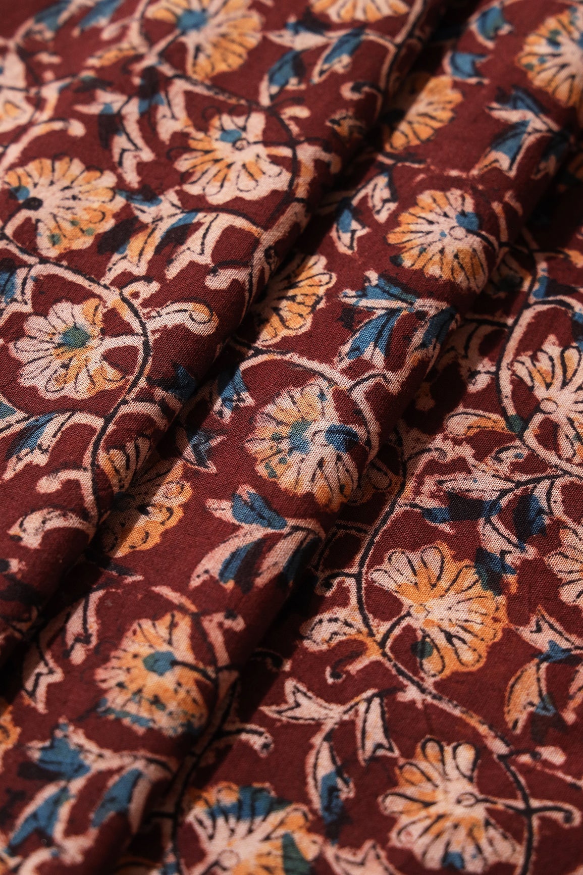 Maroon And Light Beige Floral Pattern Handblock Kalamkari Organic Cotton Fabric