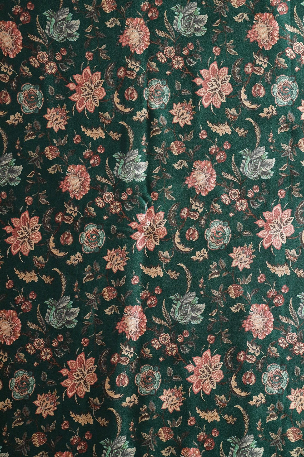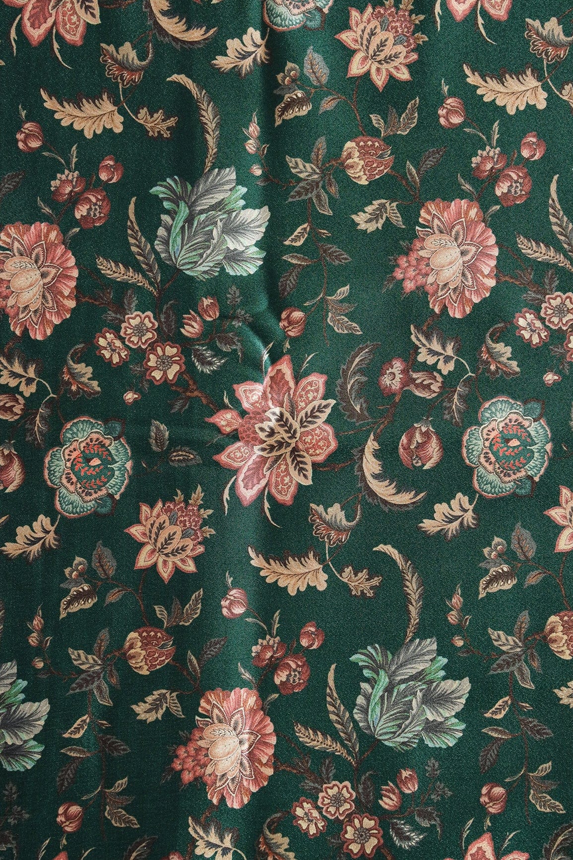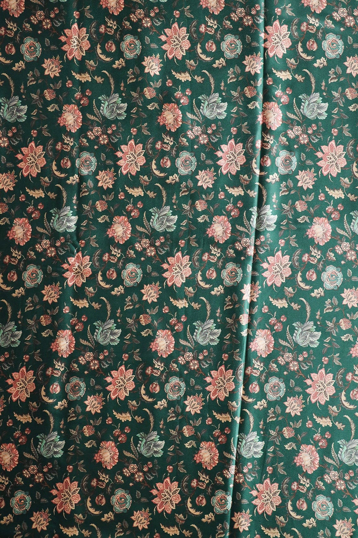Multi Color Floral Pattern Digital Print On Bottle Green Satin Fabric
