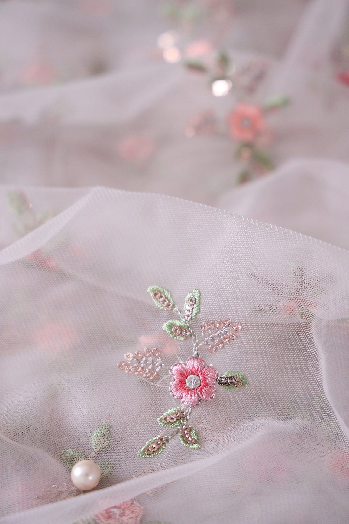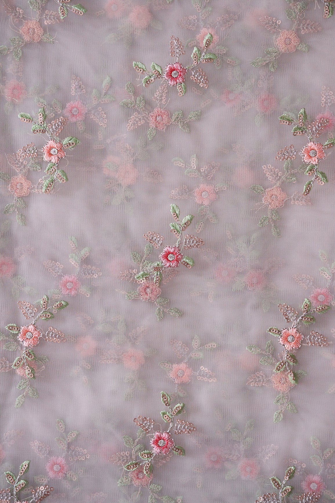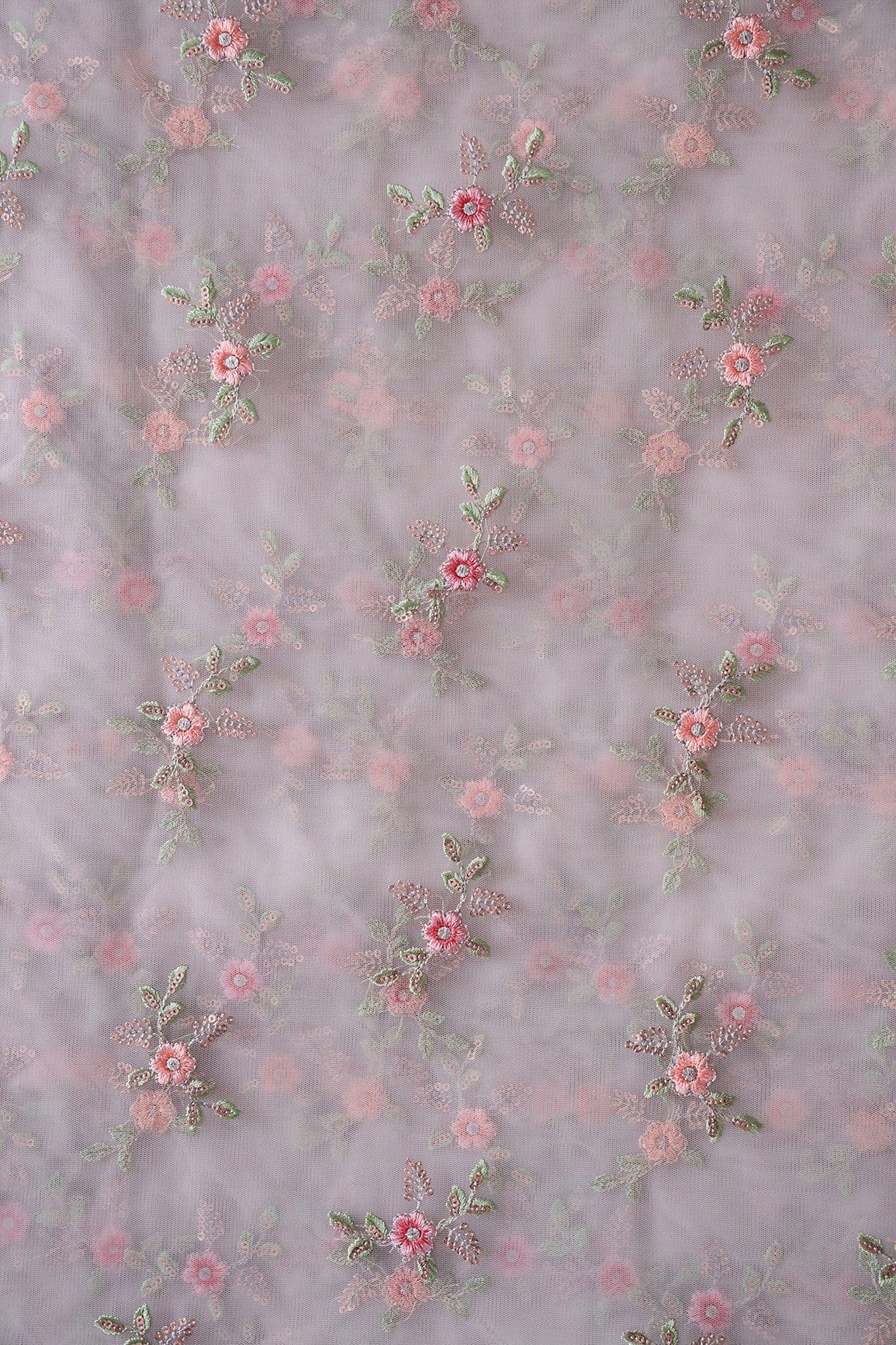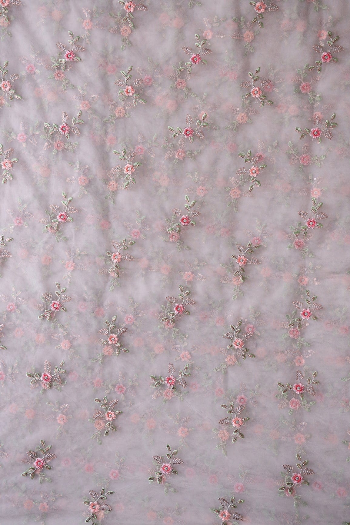 Olive And Pink Thread With Gold Sequins Floral Butta Embroidery On Pastel Grey Soft Net Fabric