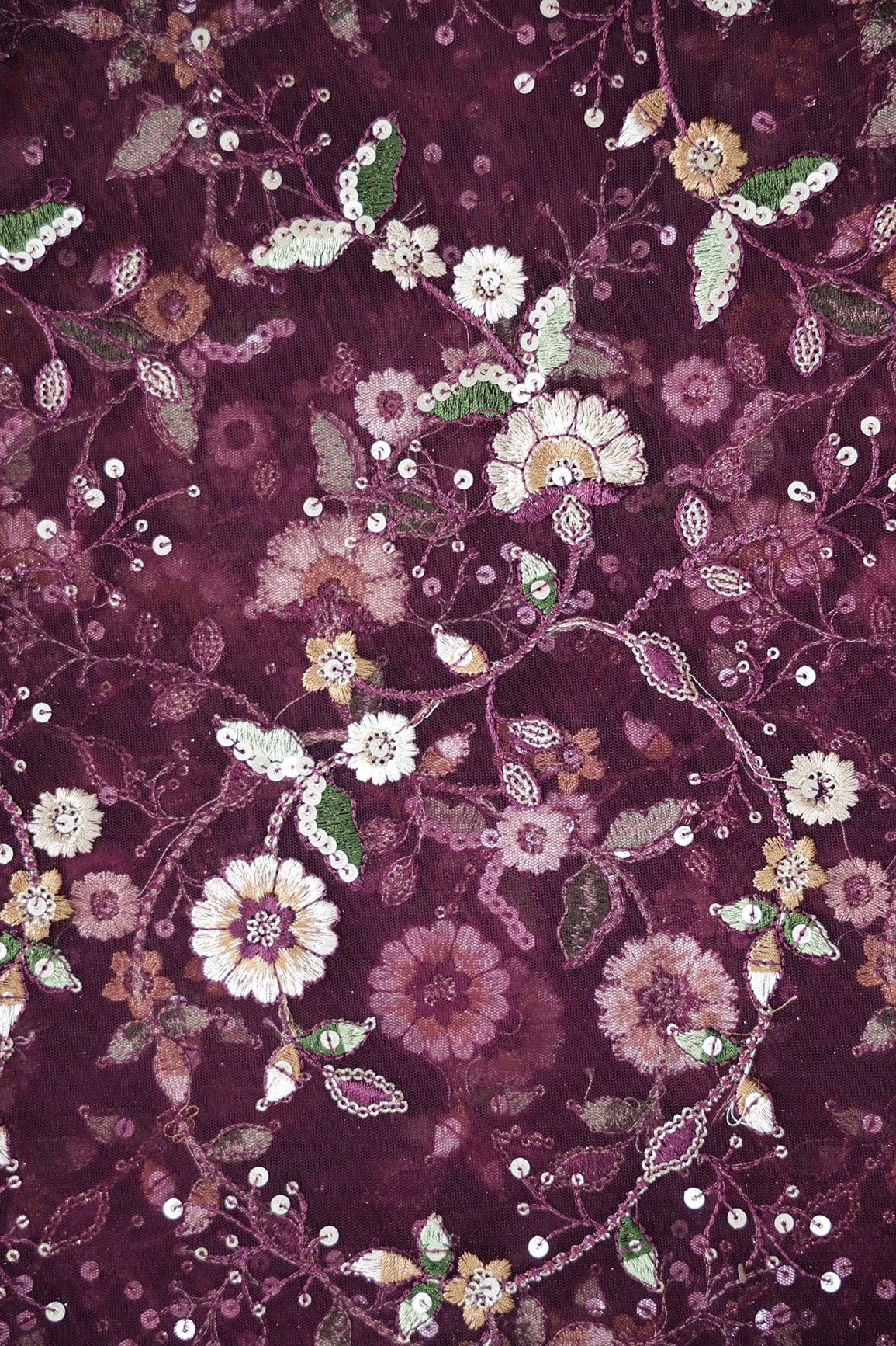 Fabric 2/ Blouse : White And Wine Thread With Gold Sequins Floral Embroidery Work On Wine Soft Net Fabric