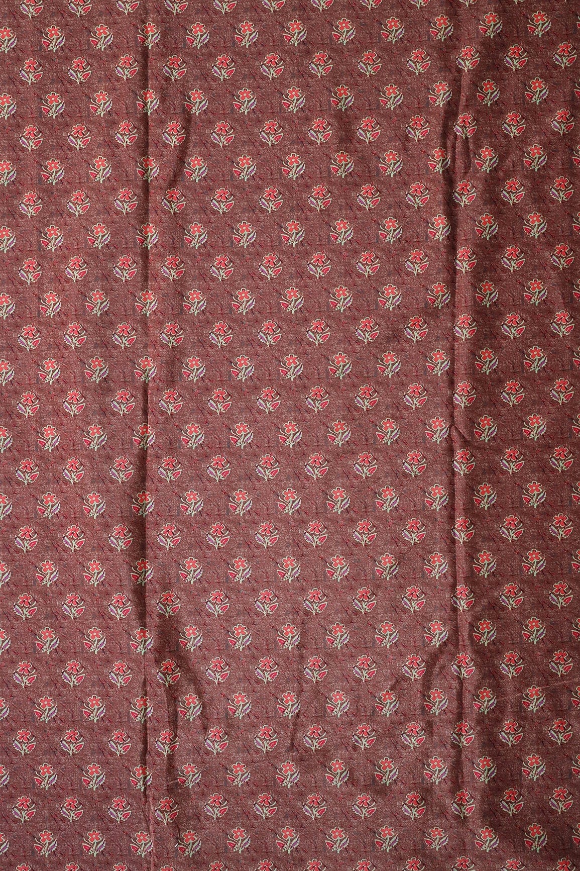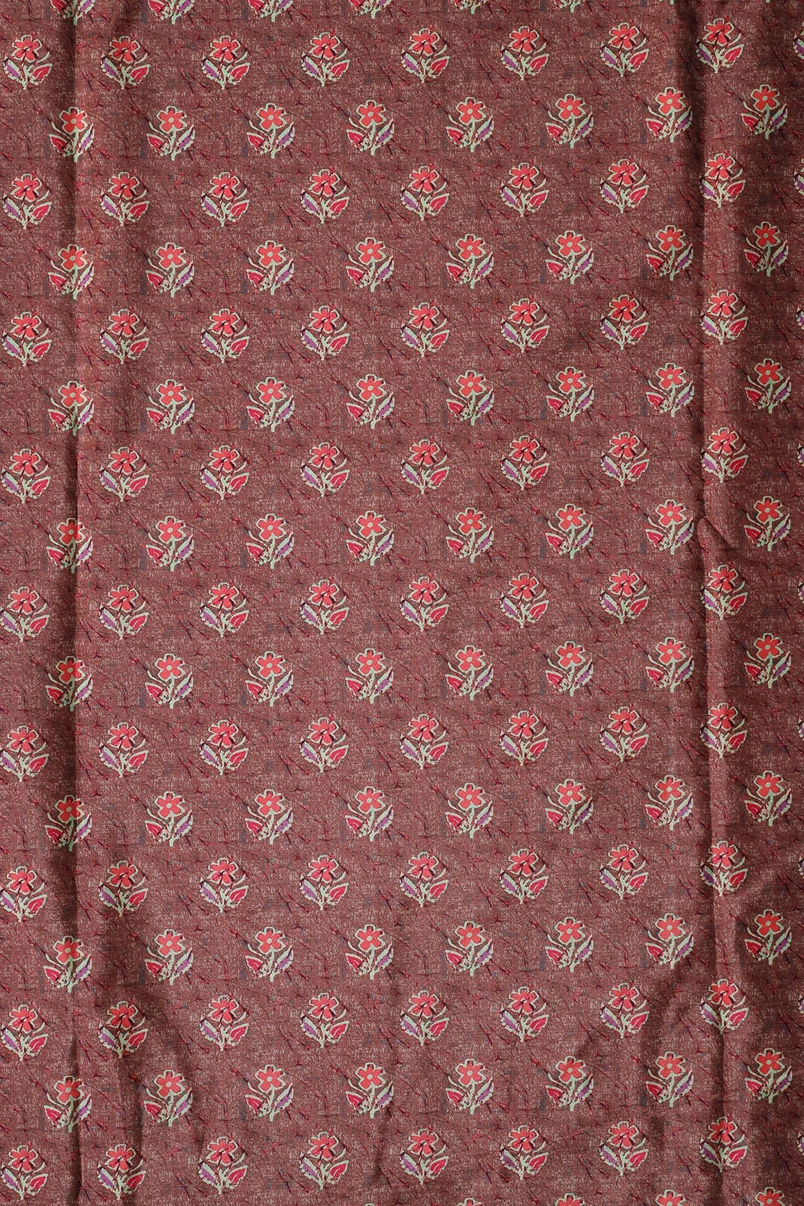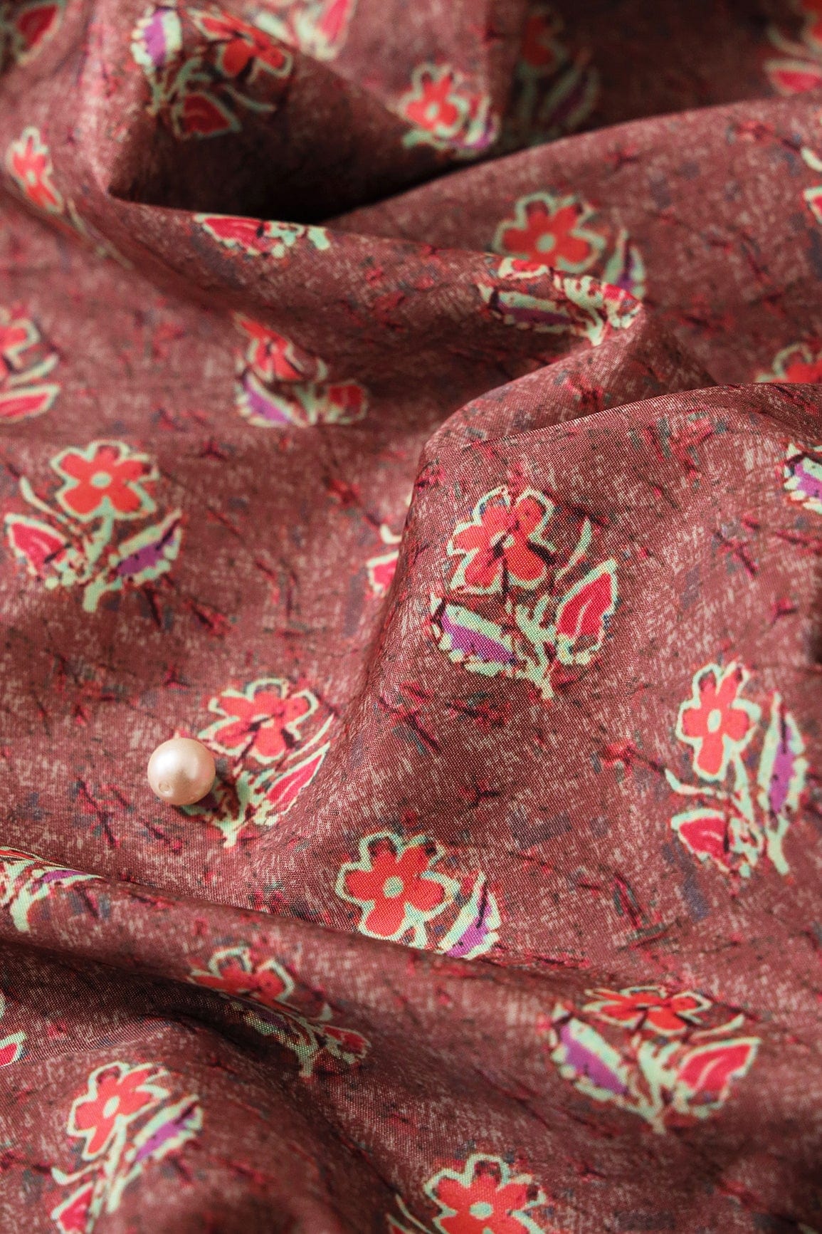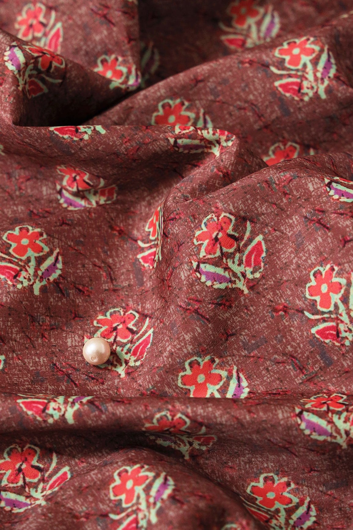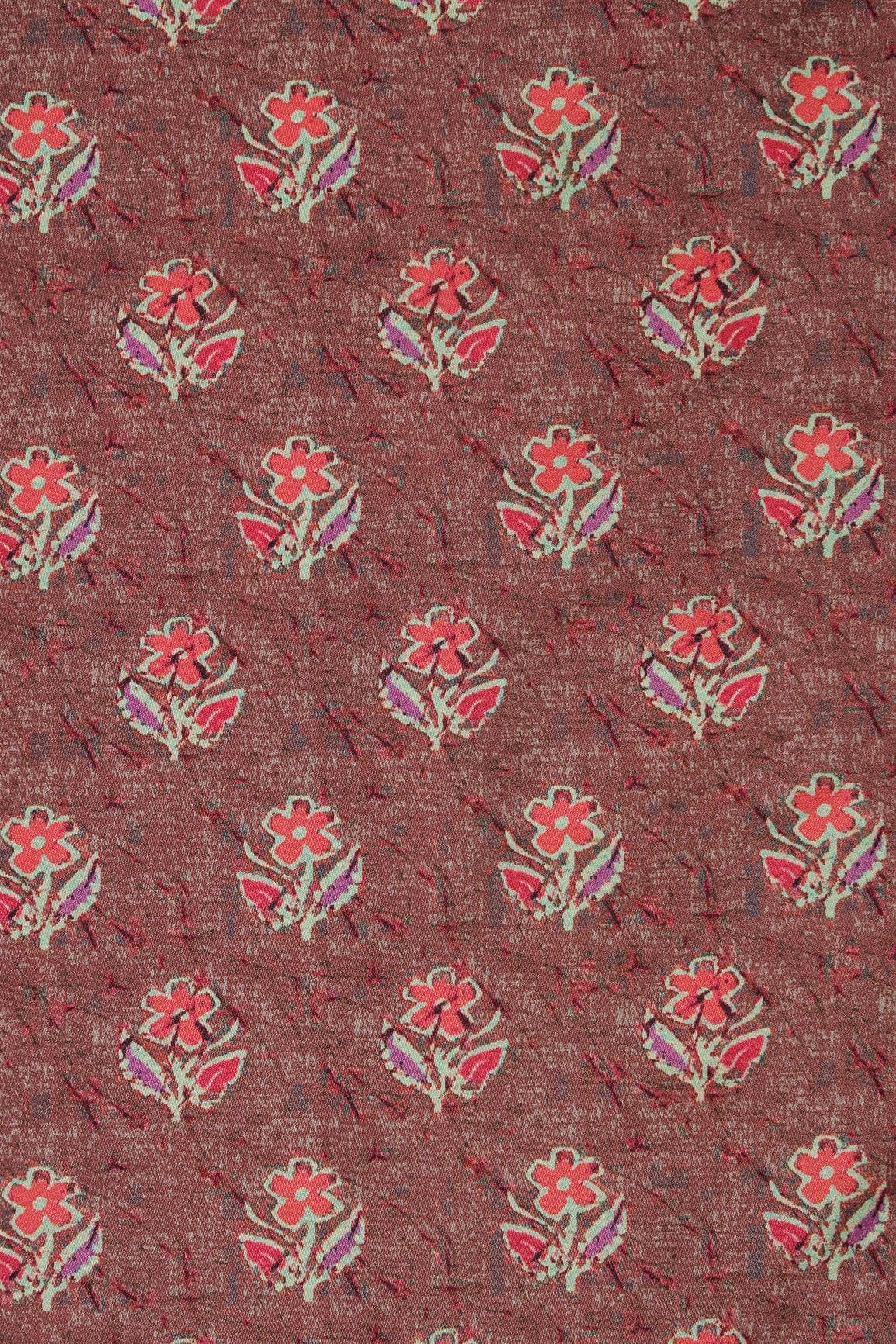 Peach And Pink Floral Pattern Digital Print On Brown French Crepe Fabric