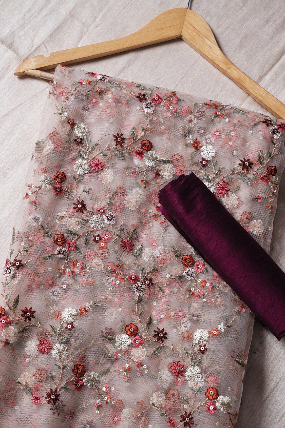 Fabric 1/ Saree : Heavy Multi Coloured Thread Embroidery On Peach Soft Net