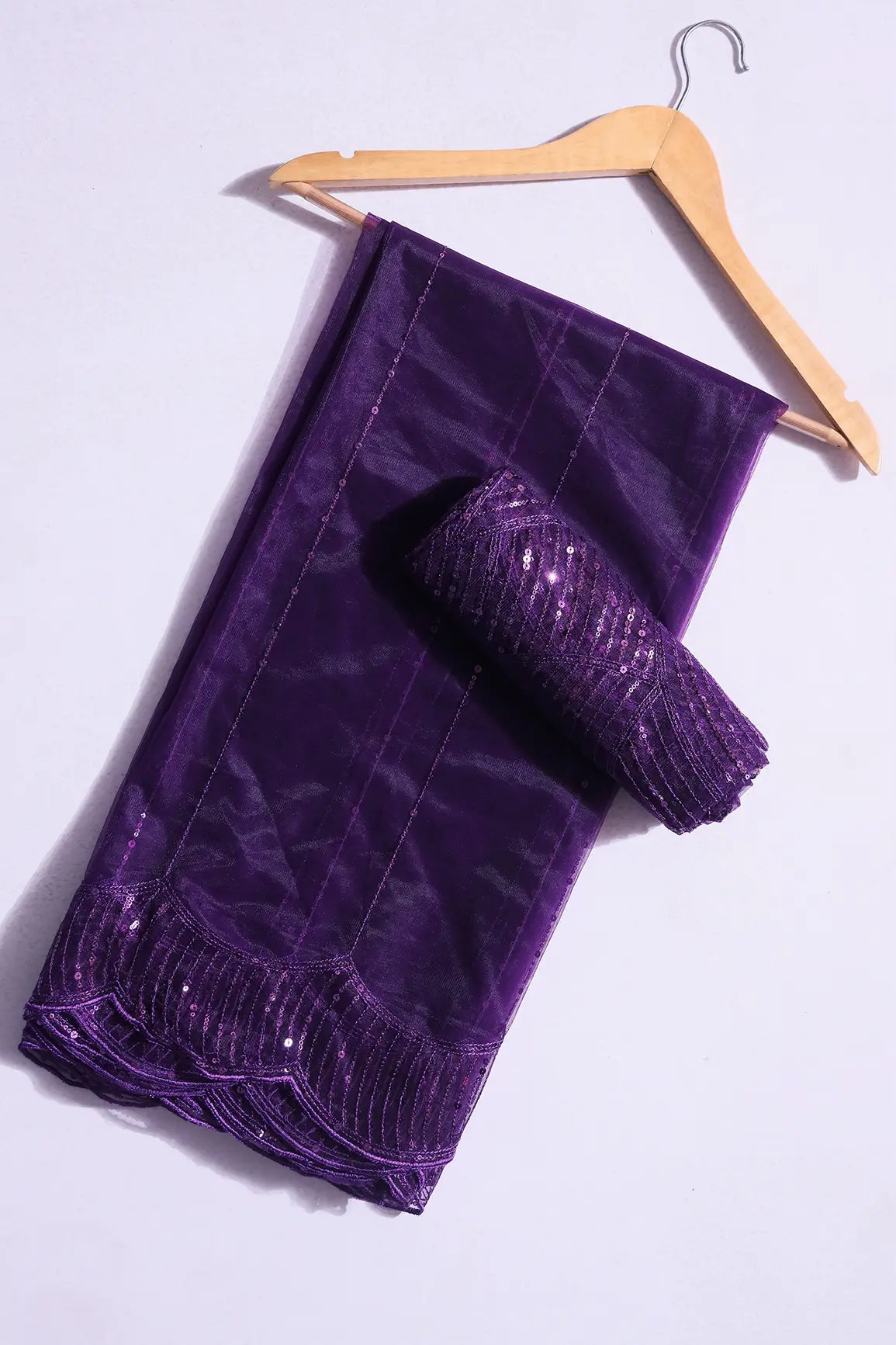 Dyed Fabric 1/ Saree : Sequins With Thread Work Embroidery On Purple Soft Net Fabric