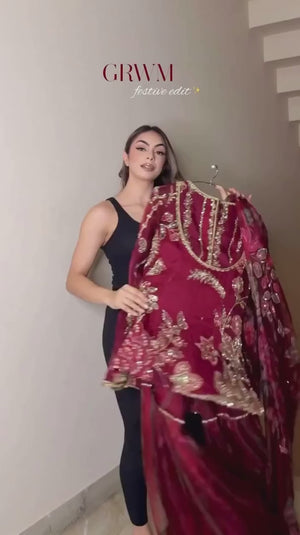 Make a regal statement with this stunning Sindoori Red Organza Gharara Set, crafted for weddings, festive occasions, and grand celebrations. Designed with intricate embroidery and luxurious detailing, this outfit beautifully blends traditional charm with modern elegance. ❤️✨